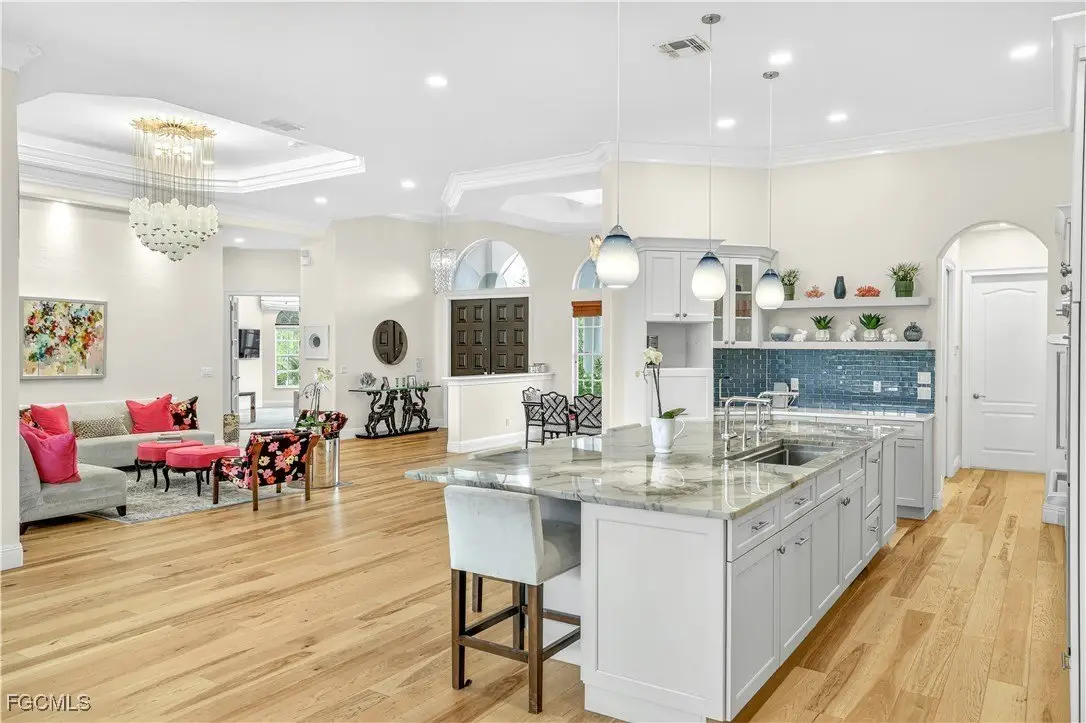 Discover luxury living in one of Fort Myers' most sought-after gated communities, Devonwood Estates. Situated on a meticulously landscaped 1.15 corner acre high and dry lot surrounded by 32 royal palms, this 4-bedroom, 4-bath estate has been thoughtfully renovated with high-end finishes and features throughout. A full interior remodel was completed in 2021, including the kitchen, all living areas, and bedrooms. The gourmet kitchen showcases custom cabinetry, a large Macaubas Fantasy Granite island, and top-tier Viking and Signature appliances. Additional updates include two new AC units and ductwork (2021), new roof (2024), remodeled pool, deck, and fencing (2022), and new pool equipment with a Jandy WiFi remote. Enjoy the elegance of ornate vintage chandeliers sourced from Palm Beach and Port Royal estates, soaring ceilings, rich wood flooring, and a seamless indoor-outdoor flow. The oversized lot offers privacy with preserve views, perfect for entertaining or relaxing in the custom pool and spa. Devonwood offers residents tennis, a community boat ramp with Gulf access, and serene privacy all while being just minutes from beaches, shopping, dining, and RSW Airport. This is one of the best kept secrets in all of SWFL.