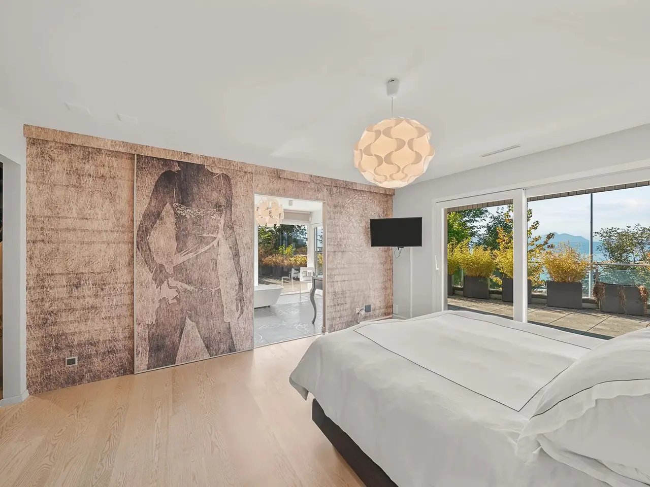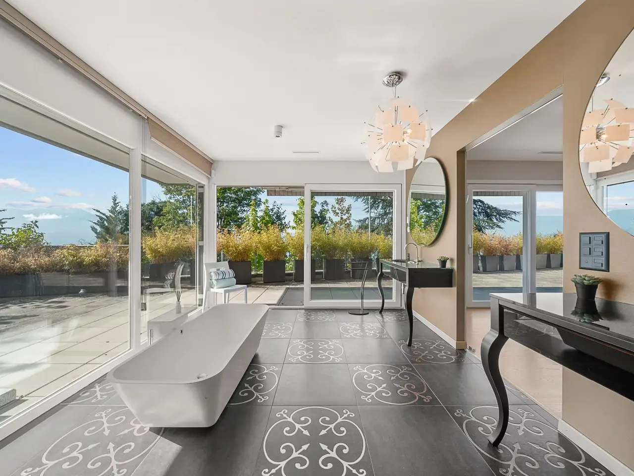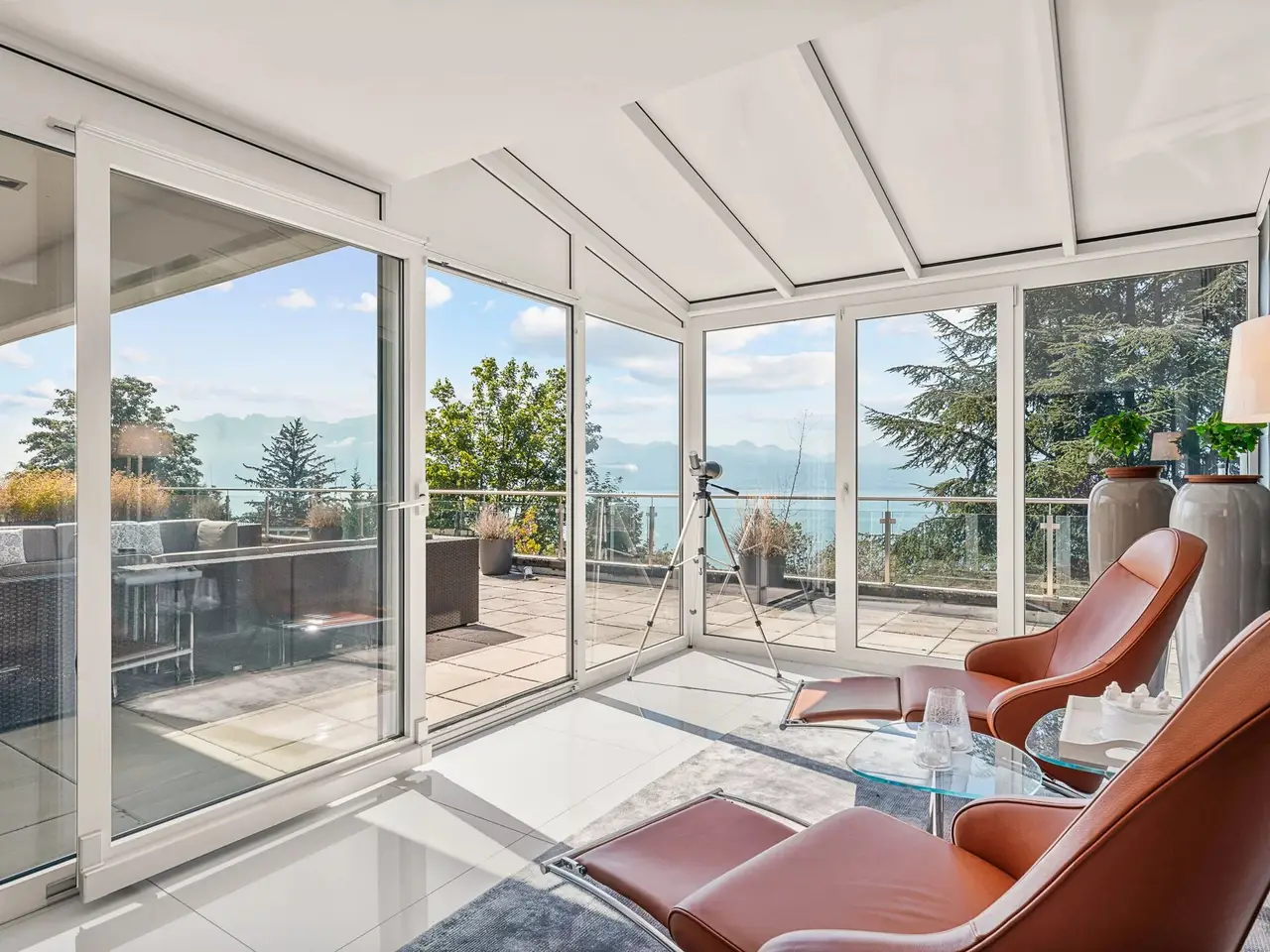 Discover this duplex penthouse apartment, located in a prestigious residence composed of two apartments. This exceptional property, spread over two floors, offers breathtaking views of Lake Geneva, blending modernity and elegance in an idyllic setting. The first level, spanning 136 sqm, opens onto a vast 180-sqm terrace, perfect for enjoying the stunning lake & Alps panorama. This level features four bedrooms, including two en-suites. The master suite is a true invitation to relaxation, with an open bathroom equipped with a shower and hammam, separate toilets, and a spacious walk-in closet. The second suite also has its own shower room and WC. Two additional bedrooms, an extra dressing room, and a bathroom with a shower and separate WC complete this floor. The second level, covering 160 sqm, is distinguished by its vast, light-filled living room, extended by a winter garden with direct access to a 107 sqm terrace wrapping around the floor. An elegant and functional open-plan kitchen seamlessly integrates with the dining area in this convivial living space. This floor also includes an en-suite bedroom with a shower room and separate WC, a guest WC, and an entrance with a cloakroom. The apartment benefits from four indoor parking spaces and a private garage (in addition), and two 12.5-square-meter cellars, providing generous storage space. A bright and elegant entry hall leads to the lift from the garage. The apartment benefits from Minergie-certified construction, ensuring high energy performance and a healthy living environment. For added convenience, central vacuuming is installed throughout the entire space. Additionally, the geocooling system provides natural and eco-friendly cooling during summer.