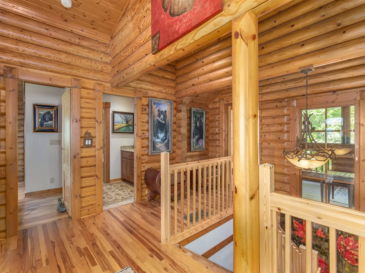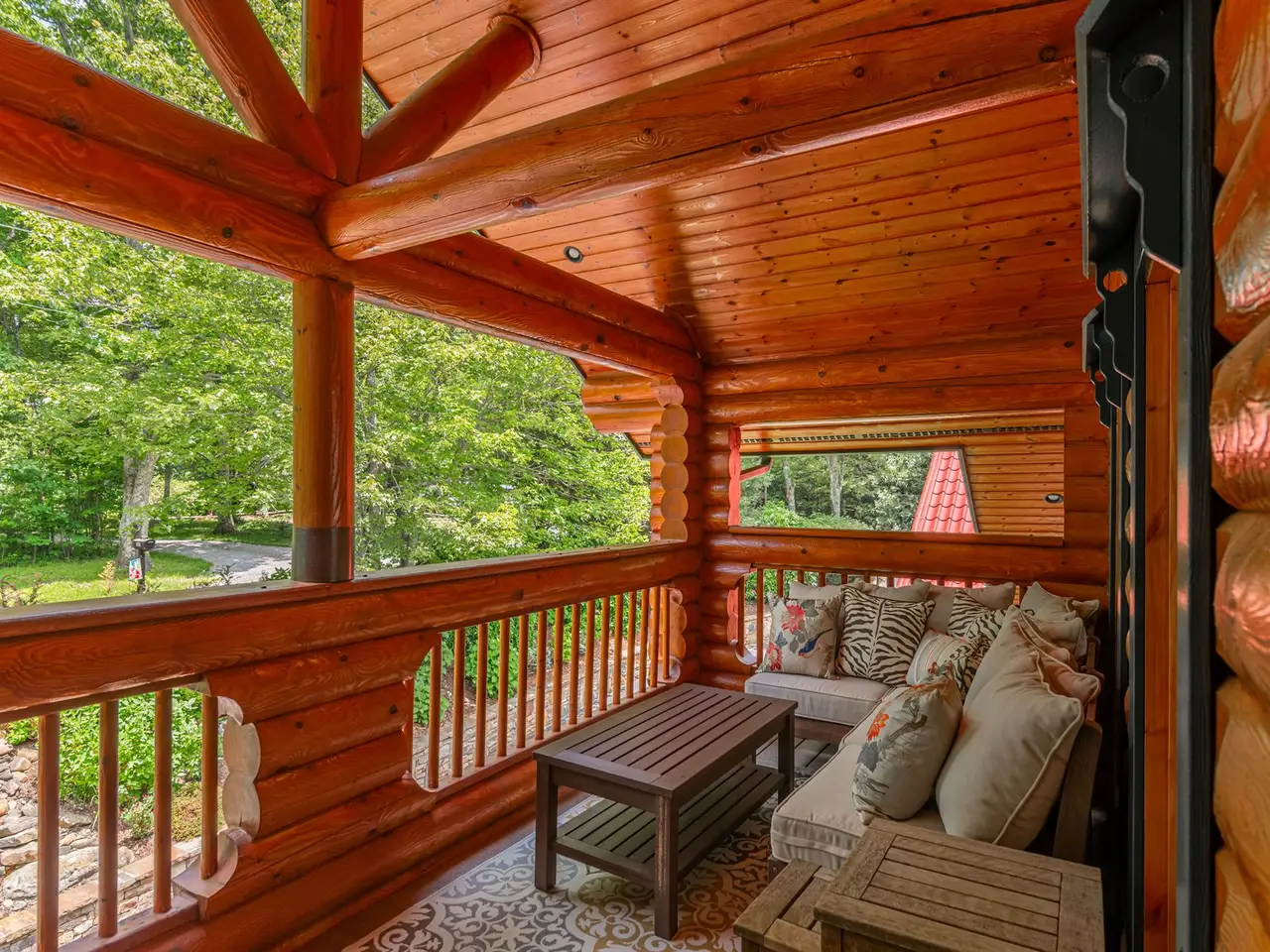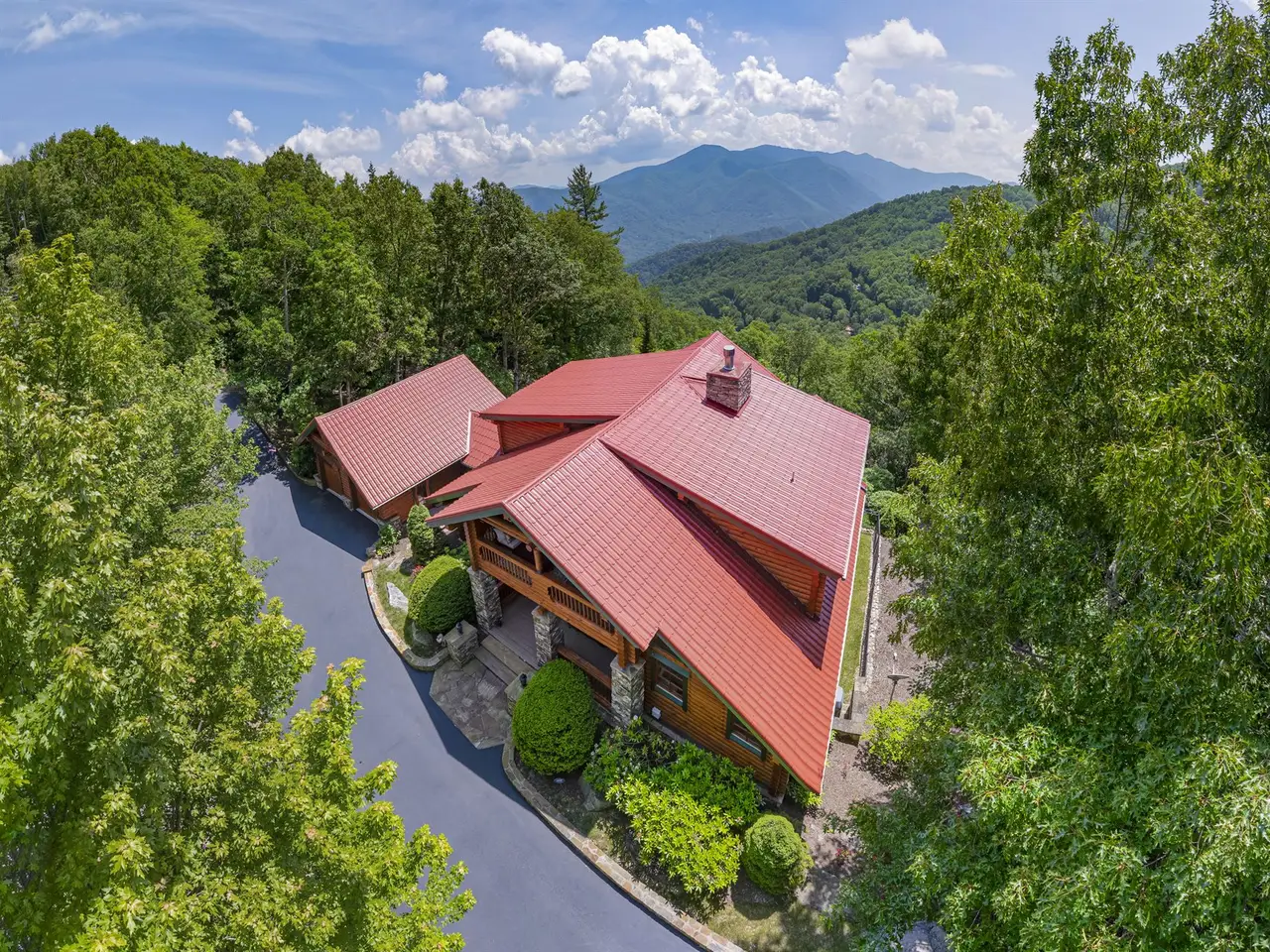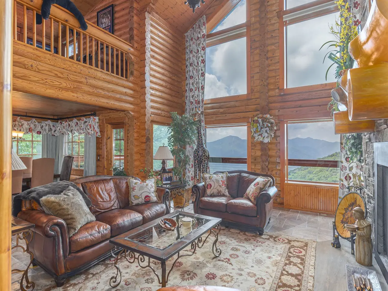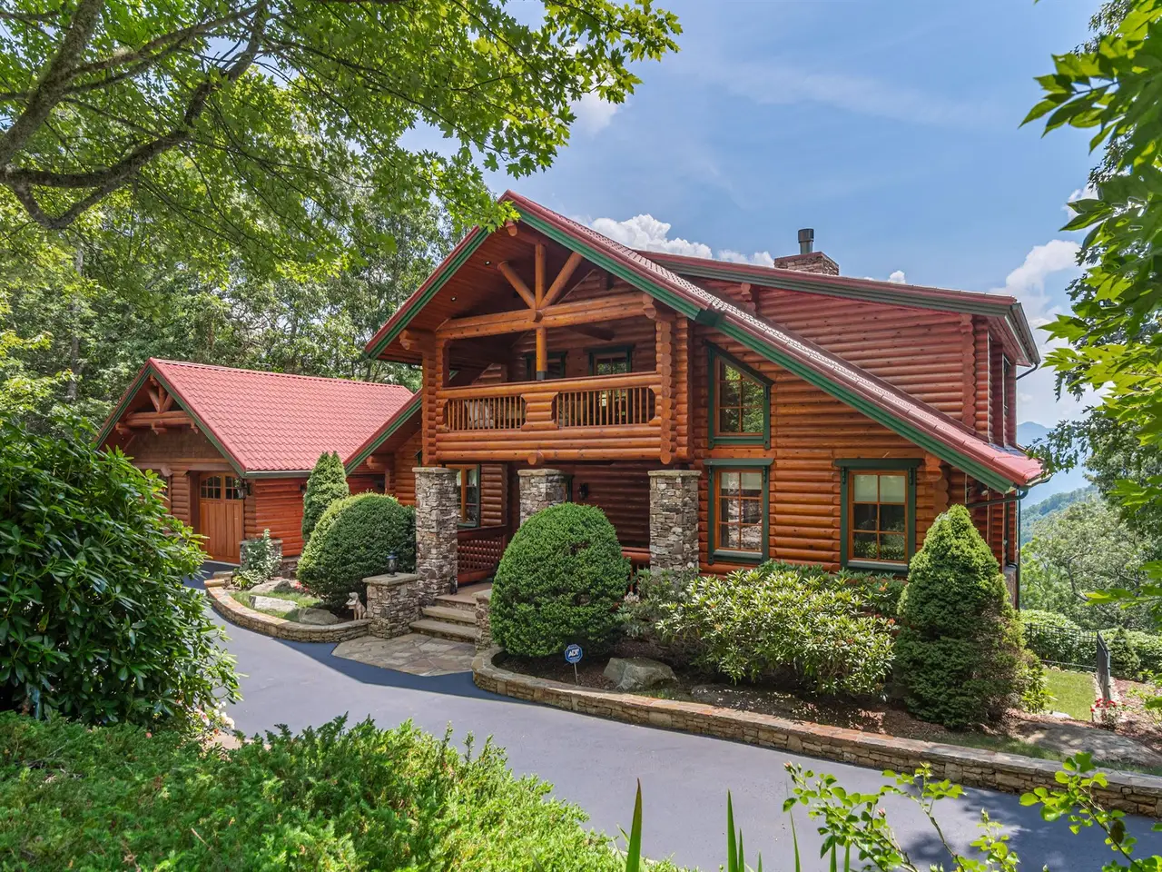 Discover this breathtaking Honka log home of Scandinavian design & precision nestled atop Maggie Valley in gated Laurel Heights. At 4800' elevation, enjoy cool temps and unparalleled long-range views from countless windows. Each of the three luxurious primary suites is a private retreat, boasting spacious rooms, walk-in closets and showers, and garden tubs for ultimate relaxation. For the culinary enthusiast, the main level chef's kitchen is seamlessly connected to the great room, which features a towering wall of windows framing magnificent south-facing views. Downstairs you'll find a second full kitchen, dining area, den, and a sprawling primary suite. The rec room/den is a great secondary entertaining space for gatherings. While mountain living fosters relaxation, the versatile upstairs loft serves as an ideal home office (or a spacious fourth sleeping room). Outside, the curated grounds are filled with exceptional, usable spaces to revel in the fresh mountain air.
