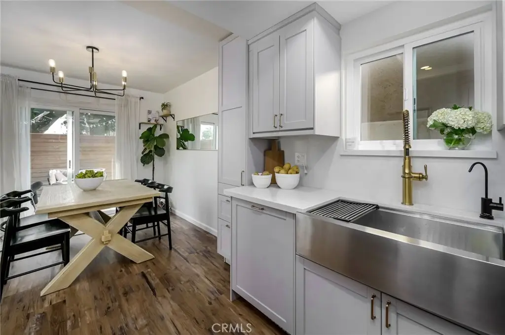 Vaulted & beamed ceiling in living room Remodeled kitchen with stone countertops & custom cabinetry