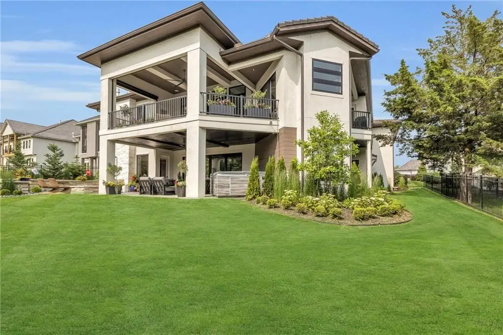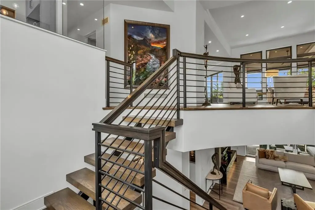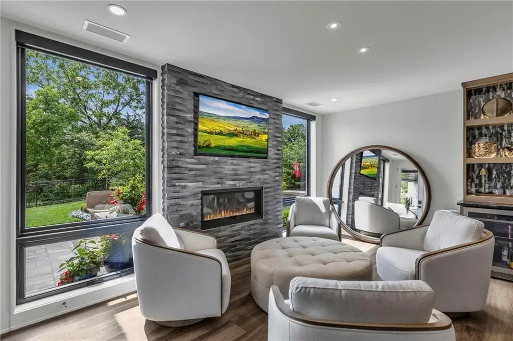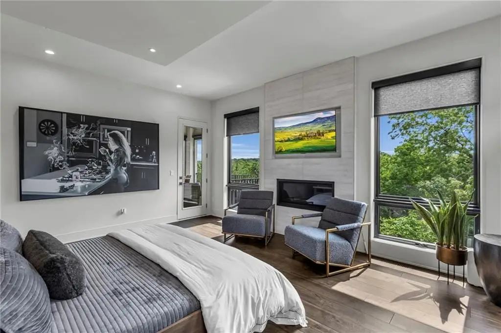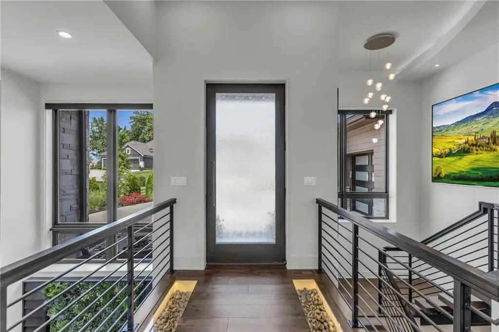 CONTEMPORARY AND LUXURY describes this Artisan designed home built by Casa Bella! A true masterpiece bringing in amazing architecture while touching all your senses! The 2 story water fall greets you at the entry along w/ dramatic ceiling, lighted walkway, leading to the great room w/ marble fireplace surround, back lit quartzite, floor to ceiling windows. The treed back drop is inviting & covered deck has new automatic screens. The Gourmet Kitchen has Carrera Marble island w/ waterfall edge, Frigidaire Refrigerator / Freezer, Cafe Induction Stove Top, Bosch Dishwasher, Cafe oven, Advantium microwace along w/ 2nd oven in the back pantry. Grill deck is a bonus feature right off the pantry. Perfectly positioned study w/ glass panels to bring in the light but nice and quiet for privacy. The Spa-like primary bath has marble floors, double headed shower w/ glass surround, soaking tub, large double vanity w/ plenty of cabinets. Primary bedroom includes built in headboard, king bed & side tables AND a beautiful view to the covered deck & backyard w/ fireplace for those chilly evenings. As you walk down the floating steel staircase w/ solid wood stairs, prepare to be WOW'd as the lower level is an Entertainer's Dream. Back wet bar w/ beverage frig & refrigerator drawer & ice/freezer drawer. The quartzite counter lit island is in perfect position for wine tastings next to the wine feature wall. The 3rd fireplace is the perfect conversation area while the media space is ample and comfortable. You can walk right out to the covered patio & enjoy the fire pit, lush fenced backyard and privacy. 3 bedrooms w/ 2 1/2 baths on the LL. The home gym is amazing space with storage tucked away. Pet Lovers will enjoy the Dog House. 8' deep chocolate modern interior solid wood doors w/ metal inlays, paved stone driveway, Fire & Water feature front and back, epoxy'd garage floor, remote blinds on front entry & sliding back door!
