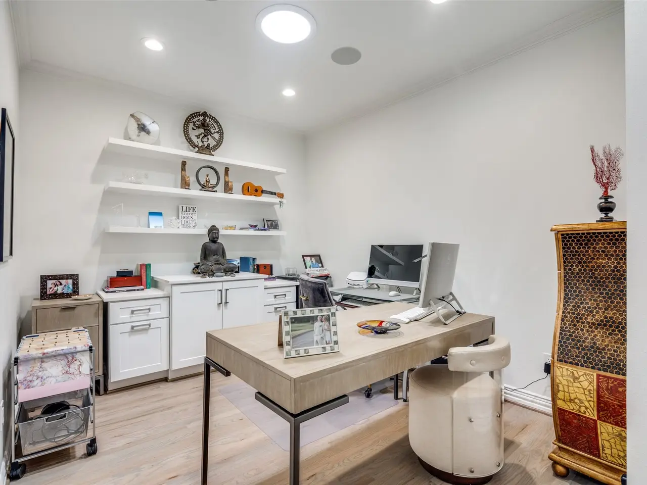 Fantastic zero lot line in the lovely Stonebriar Village, a gated and guarded community with TWO PRIMARY suites & TWO STUDIES. Second floor was completely remodeled in 2023. The second-story primary bath features quartz countertops, lighted mirrors, ceramic tile flooring, a large walk in shower, garden tub, and a linen closet. This primary suite also includes a huge closet (measures 12 x 10). Additionally the suite has hardwood flooring, a separate office with a wall of built-ins and shelves above, and a 155 sq feet of a sunroom that makes a great TV or sitting room with incredible views of tons of trees and creek area. Don't miss upstairs guest room. It has a ensuite bath with lighted mirror and quartz! First floor primary has been remolded in 2019 with granite countertops, a tower, dual sinks, free-standing elegant tub, a custom closet, and a large walk in shower! Heated flooring in both primary baths! Chef's kitchen with extended island, granite countertops, Viking Appliances, double ovens, a built-in subzero refrigerator, a large walk-in pantry and a reverse osmosis water filtration system. The wrap-around breakfast bar seats up to 5 people. Large breakfast room that views the resort style outdoor living area is open to the family room! Formal study (or could be 4th bedroom) with adjacent full bath, French doors, closet, a wall of built-ins. No carpet in this great home, hardwood floors and ceramic tile throughout. Great wine storage with wine cooler. Two attics with walk in storage. Security and Sprinkler systems! Double garage has epoxy flooring, and custom cedar door. Extensive landscaping with stone borders. A whole house Generac generator, a Culligan water softener system, and a Moen water safety system stay with the home. Seller prides in taking care of the home.