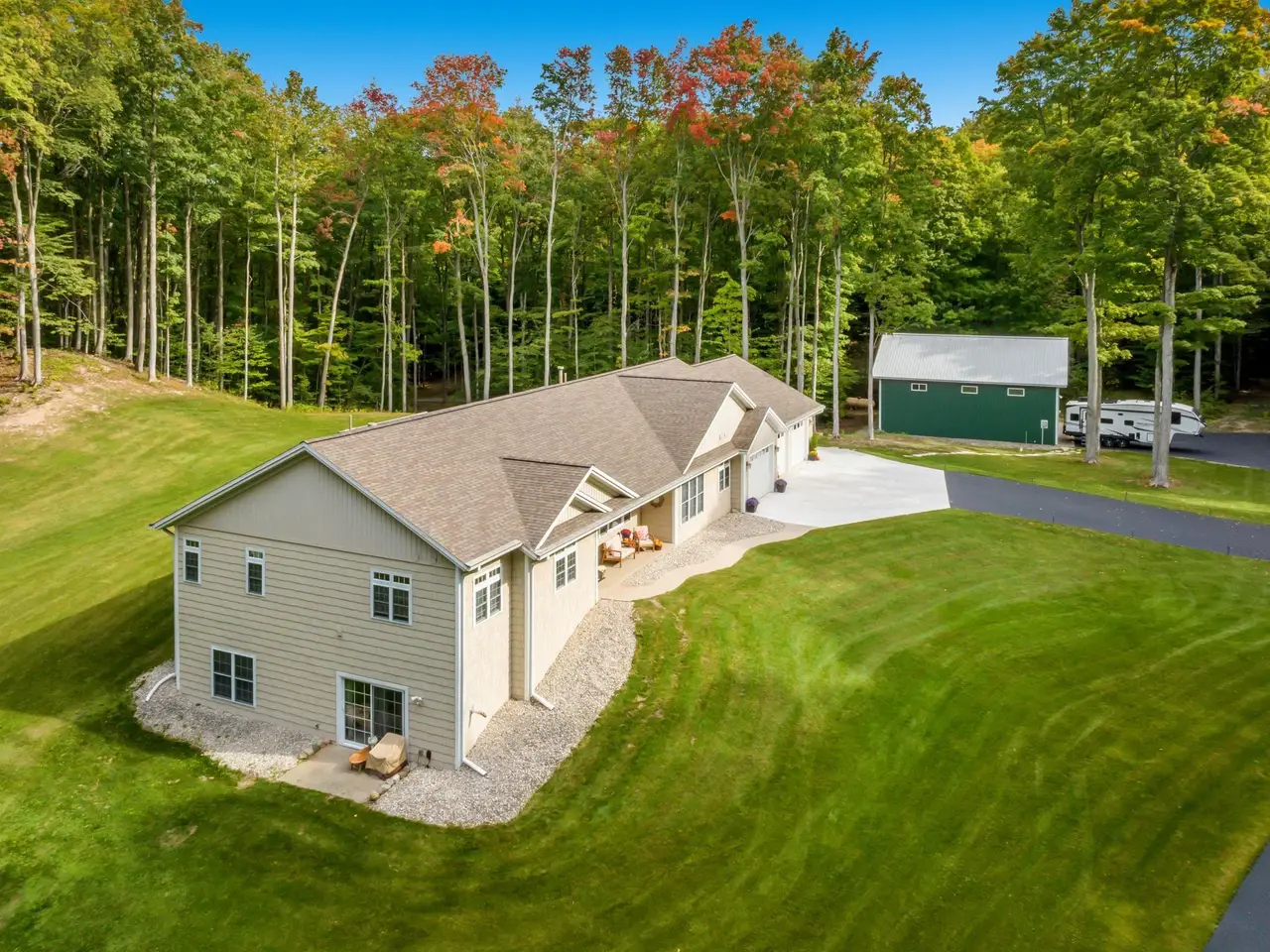 Welcome to your dream home in beautiful Leelanau County! This stunning property is situated on 10.36 acres hardwoods and very private, plenty of room for outdoor activities and entertaining. Step inside this 4325 square foot home and be greeted by an open floor plan, high ceilings, and an abundance of natural light. The master suite is a true oasis, complete with a spa-like en-suite bathroom, walk-in closet, laundry & office. The remaining bedrooms are equally impressive, offering ample space and comfort for everyone. Topping it off is a 3 car heated garage and a 34 x 42 heated polebarn with epoxy floors and upstairs office! WOW! Just 10 min's from Traverse City! Detailed upgrades to this amazing property can be found online.
