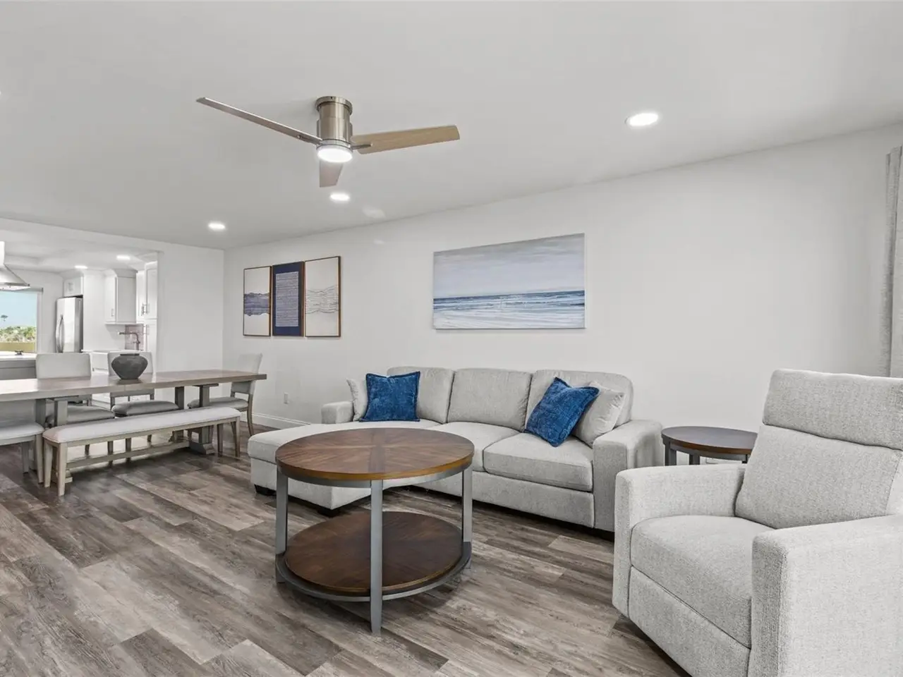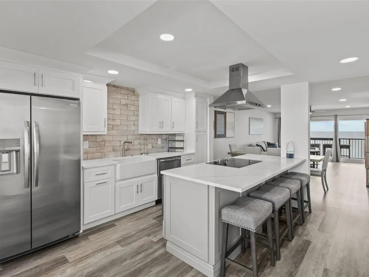 Architectural Digest on the Gulf Welcome to a residence where design and coastal beauty meet in perfect harmony. This exquisite 2-bedroom, 2-bath condo has been elevated to a standard worthy of Architectural Digest, with every detail thoughtfully curated and every finish chosen for both sophistication and comfort. At the heart of the home, the gourmet kitchen impresses with a striking island, custom cabinetry, wine bar, and professional-grade stainless steel appliances. Wide-open living and dining spaces are framed by brand-new hurricane-rated windows and sliding doors, showcasing breathtaking, unobstructed views of the Gulf of Mexico. The primary suite is a sanctuary of style, with serene water views and a spa-inspired en suite bath. Guests will feel equally indulged in the second bedroom, paired with its own elegantly updated bath. A discreet laundry closet with full-size washer and dryer enhances convenience without compromising the sleek design. Step onto your private balcony and let the romance of coastal living surround you—sunsets that set the horizon ablaze, dolphins and manatees playing in the surf, and the soothing rhythm of waves that feels like your own personal soundtrack. Beyond beauty, this condo also offers remarkable value. With a two-week rental policy, it presents excellent investment potential as both a luxurious personal retreat and an income-generating opportunity. Ocean Sands pampers residents with resort-style amenities: a beachfront heated pool and spa, shuffleboard courts, tiki hut, BBQ area, and direct access to one of Florida’s most beloved stretches of sand. Reserved under-building parking ensures peace of mind and convenience. More than a home, this is an experience—where luxury design, smart investment, and the magic of the Gulf Coast all come together.