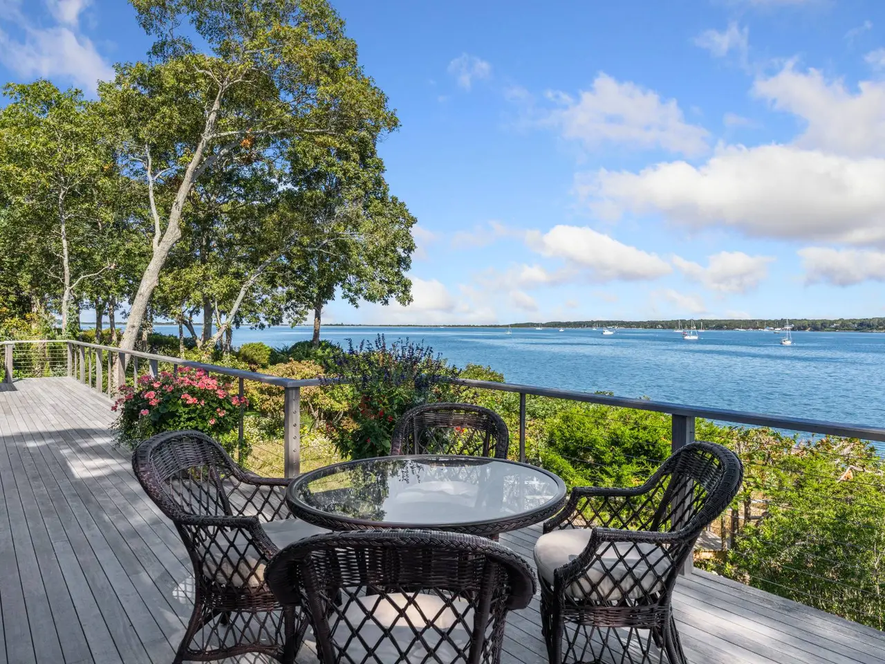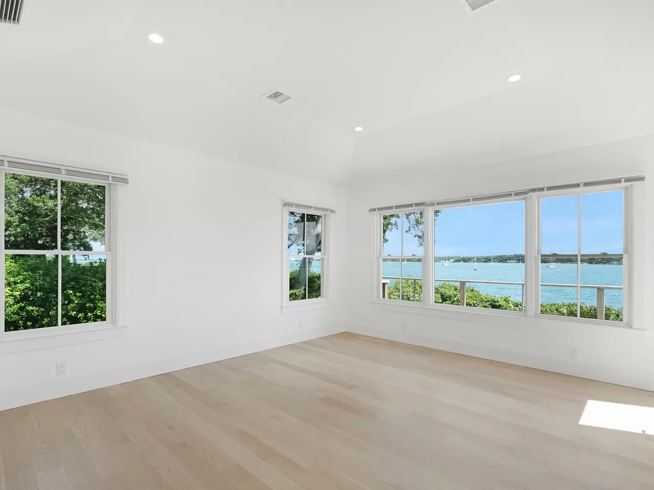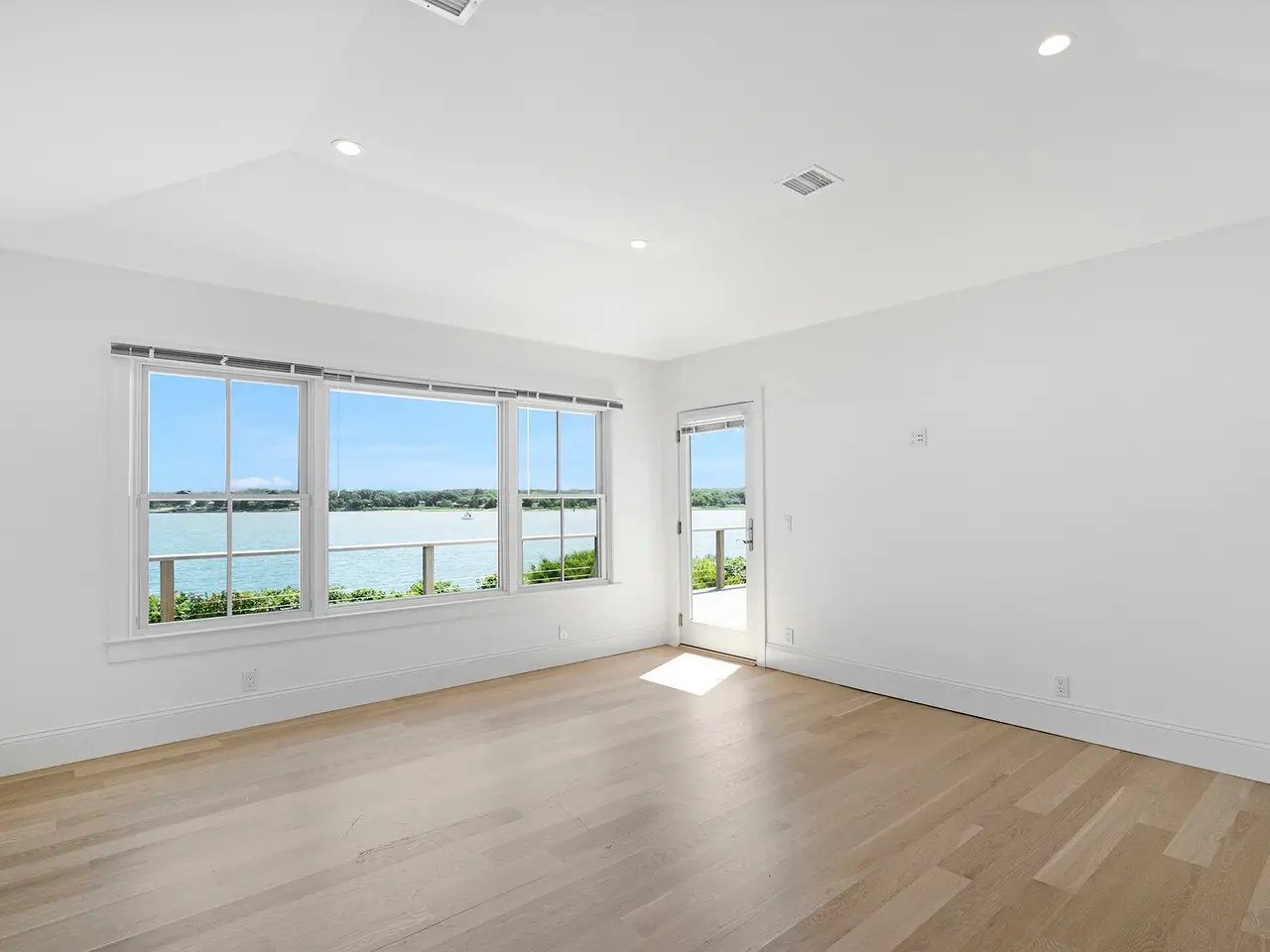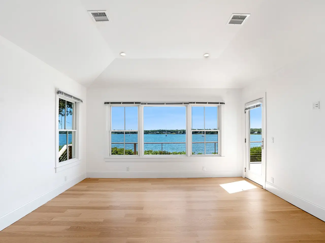 Facing due east for brilliant sunrises with 101' water frontage on Three Mile Harbor, this traditional house was thoroughly renovated in 2022. The upside-down configuration is approximately 3,500 square feet and each floor can operate separate from one another. The main floor has a 23' vaulted ceiling that creates a dramatic space for the living room with fireplace, wet bar with wine refrigerator, dining area and designer kitchen with island, double sinks, dishwashers and generous walk-in pantry. There are 5 bedrooms with 10' tray ceilings and 4.5 baths, two ensuite wings on the main floor, bedroom with private entrance and a separate private office with pocket door. The lower level hosts a living area with kitchenette including sink, dishwasher and refrigerator, two ensuite bedrooms, a miscellaneous room that had been a tackle room with shelving and a large mirror, laundry, massive amounts of storage and double doors leading to the water access. Additional amenities include a Kohler generator, solar panels, electric car charger, county water and a Self-Contained Hydro Action AN600 waste treatment system. The house sits 50 feet from the shoreline and 13 feet above sea level setting up the best 'in your face' pre-existing view of them all. This is the home of the late Hamptons Wellness Foundation creator who was also a life coach and avid sportsman. Beautifully designed, built and sited on 0.54 acre, the house is insulated from traffic noise because of the cul-de-sac location.