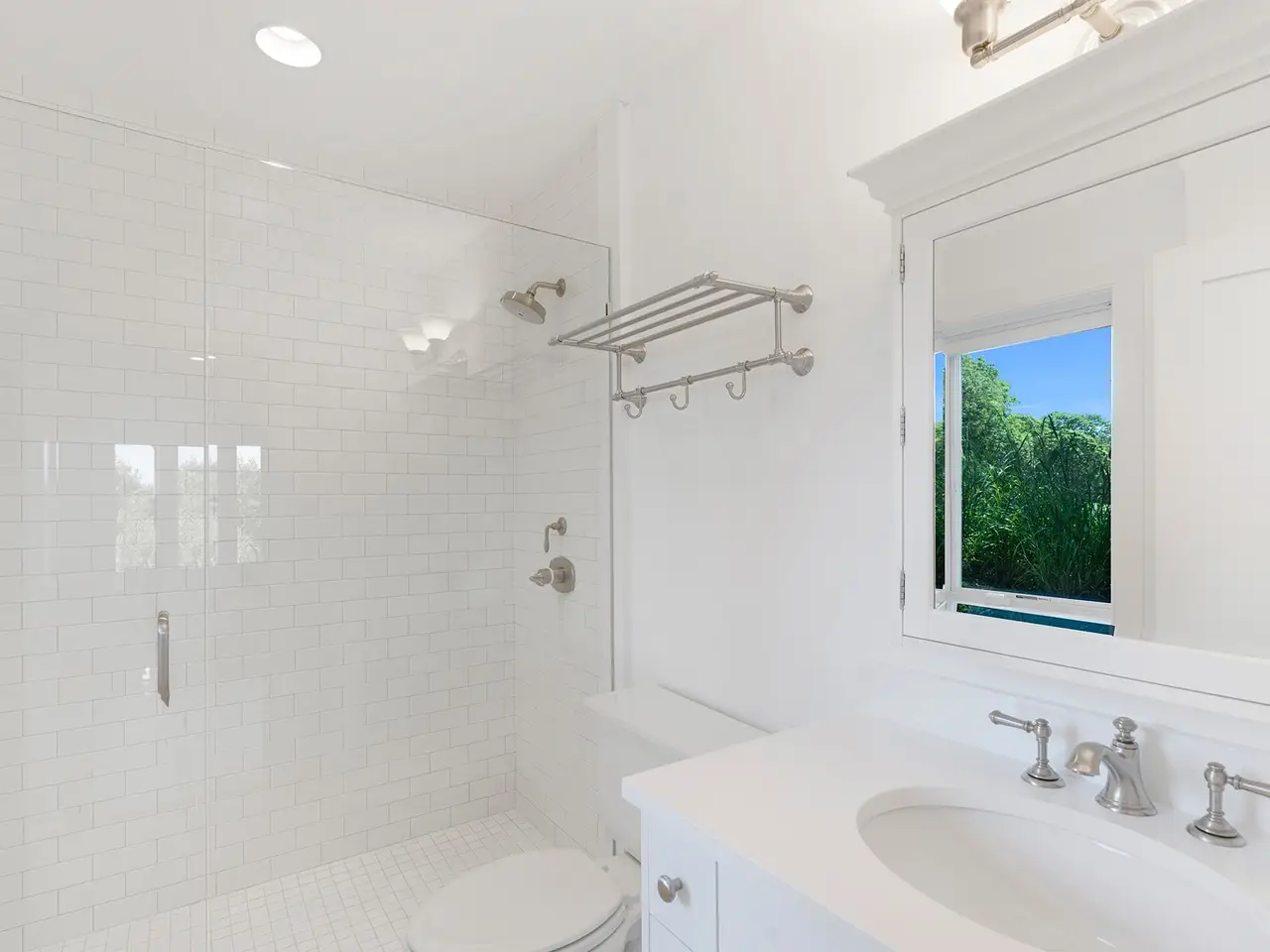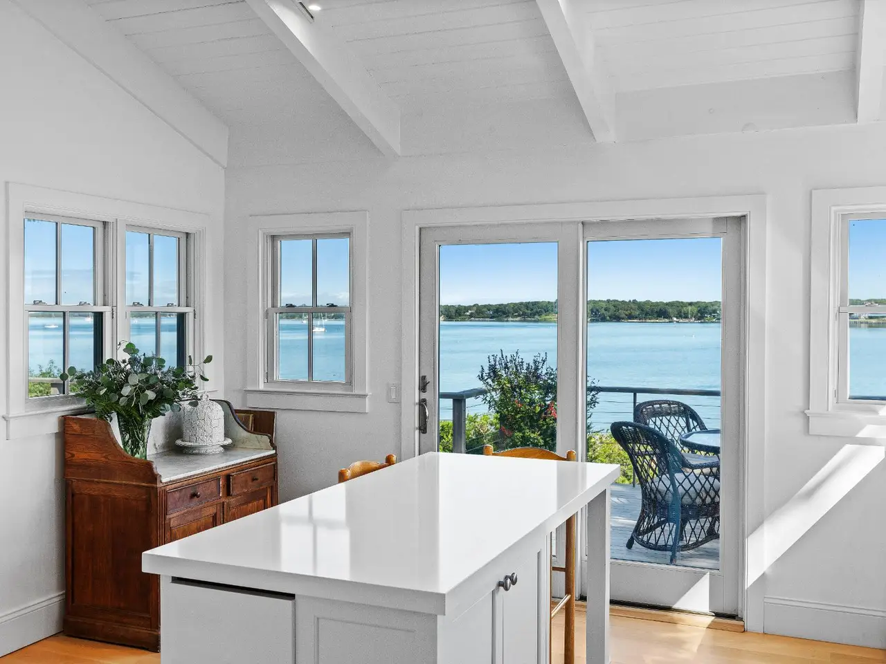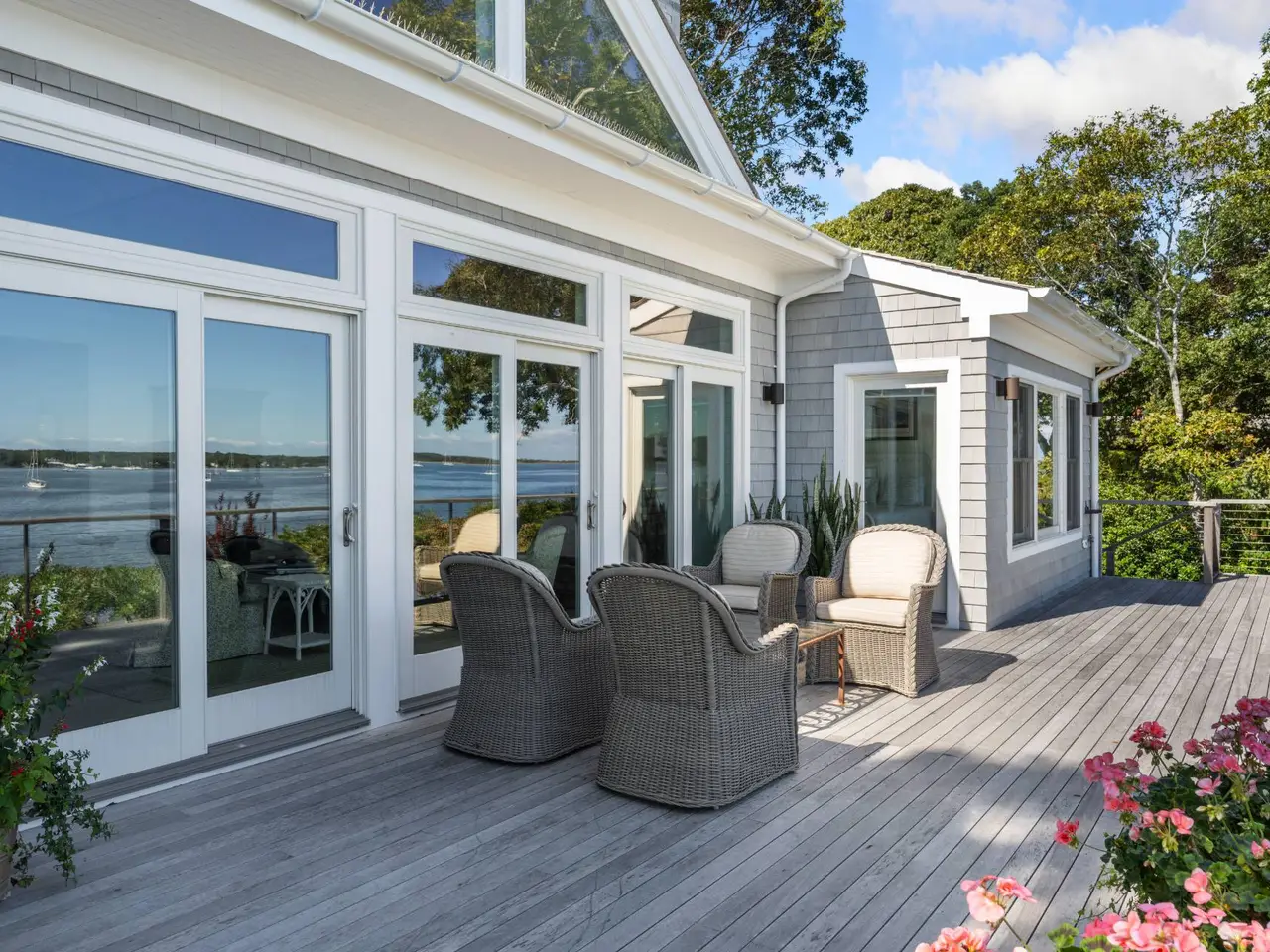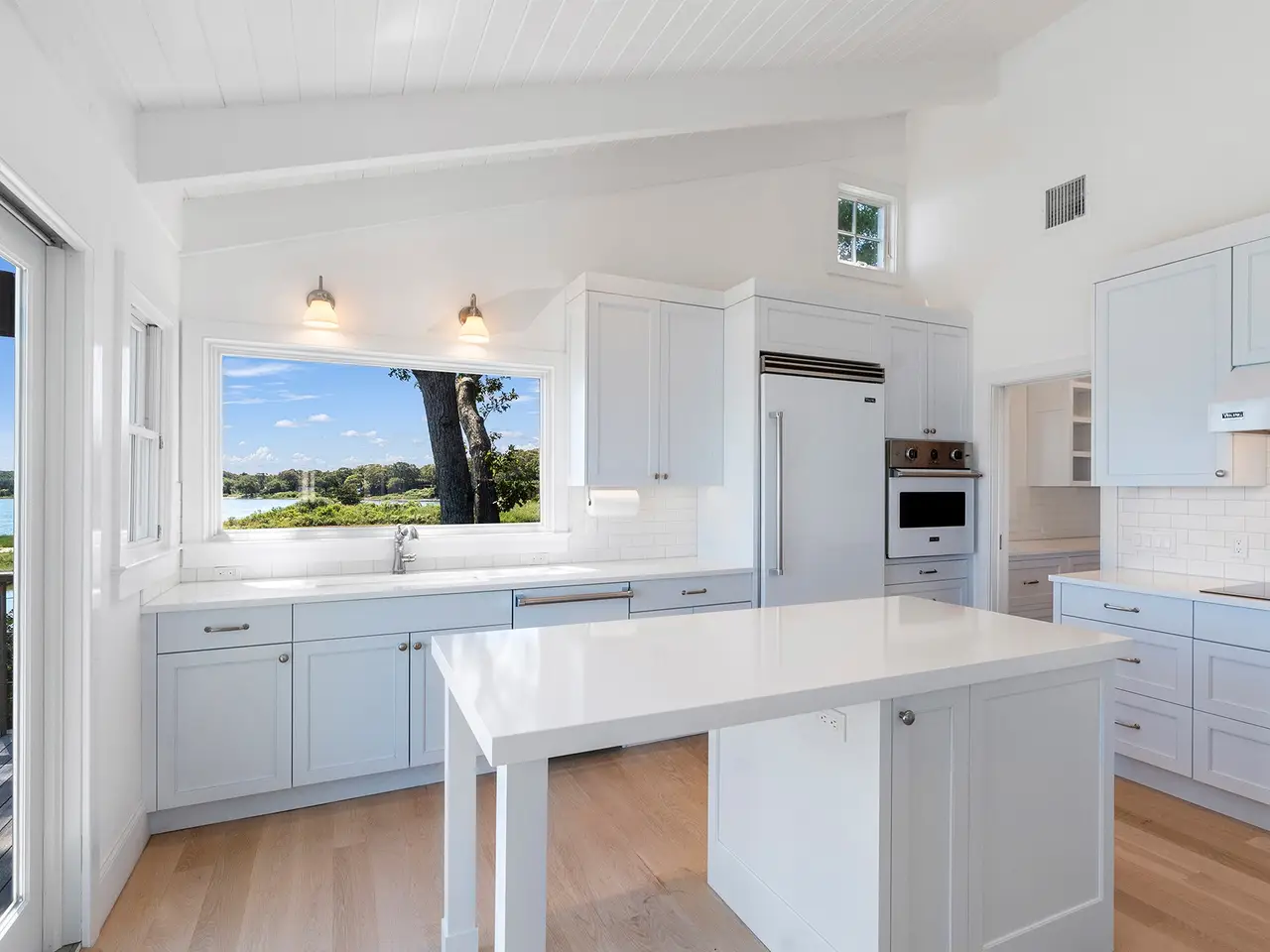 Facing due east for brilliant sunrises with 101' water frontage on Three Mile Harbor, this traditional house was thoroughly renovated in 2022. The upside-down configuration is approximately 3,500 square feet and each floor can operate separate from one another. The main floor has a 23' vaulted ceiling that creates a dramatic space for the living room with fireplace, wet bar with wine refrigerator, dining area and designer kitchen with island, double sinks, dishwashers and generous walk-in pantry. There are 5 bedrooms with 10' tray ceilings and 4.5 baths, two ensuite wings on the main floor, bedroom with private entrance and a separate private office with pocket door. The lower level hosts a living area with kitchenette including sink, dishwasher and refrigerator, two ensuite bedrooms, a miscellaneous room that had been a tackle room with shelving and a large mirror, laundry, massive amounts of storage and double doors leading to the water access. Additional amenities include a Kohler generator, solar panels, electric car charger, county water and a Self-Contained Hydro Action AN600 waste treatment system. The house sits 50 feet from the shoreline and 13 feet above sea level setting up the best 'in your face' pre-existing view of them all. This is the home of the late Hamptons Wellness Foundation creator who was also a life coach and avid sportsman. Beautifully designed, built and sited on 0.54 acre, the house is insulated from traffic noise because of the cul-de-sac location.
