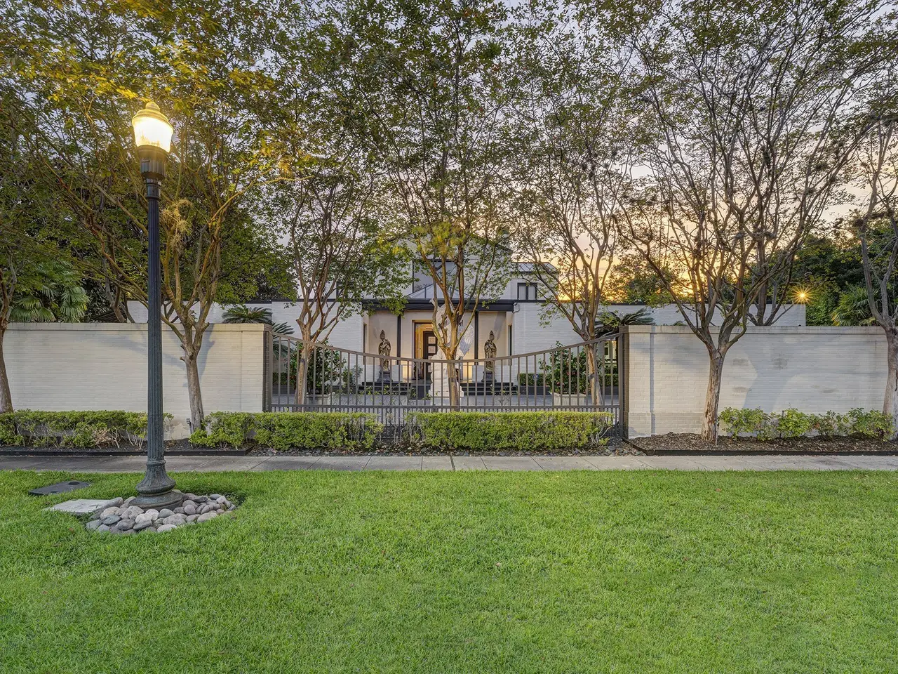 This stunning River Oaks home, initially designed by renowned architect John F. Staub, has been beautifully transformed. The first floor boasts light-filled rooms with expansive glass walls, offering views of lush gardens and an outdoor pool. The formal living and dining rooms are perfect for gatherings and feature ample wall space for art. The luxurious primary suite includes a spacious walk-in closet and dressing area. A sophisticated library and cozy sitting room provide quiet spaces, while the kitchen is discreetly tucked away. On the second floor, two additional bedrooms with en-suite baths ensure a welcoming environment for guests. The separate pool house features a full bath and a party room with an expanded bar, perfect for entertaining. The gardens are a masterpiece with lush turf, sparkling fountains, and whimsical ironwork sculptures. A private guest house with a mini kitchen and full bath adds convenience, and a full-house generator ensures peace of mind. All per Seller