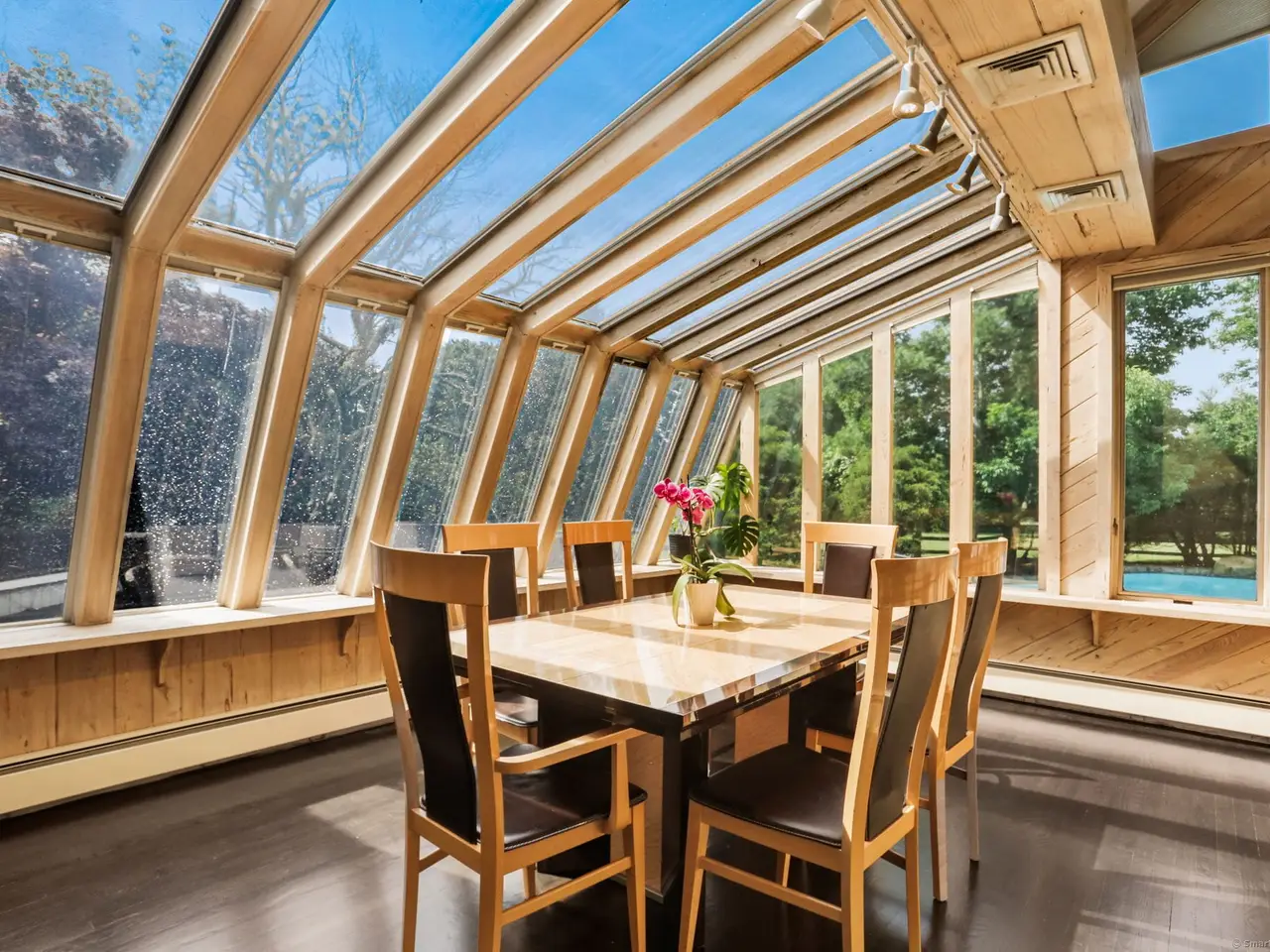 Modern Back Country Retreat with Pool, Spa & 4 Private Acres. Set on 4 serene acres in coveted Back Country Greenwich, this impressive contemporary estate blends striking architecture with comfortable, light-filled living. Built in 1978 and thoughtfully maintained, the home features 11 rooms, 4 bedrooms, 4 full and 2 half baths, and an in-law suite over the 3-car garage. The main level showcases 9-ft + ceilings, hardwood floors, and walls of glass that open to expansive terraces and level lawns. A gracious living room with fireplace, formal dining room, and library with custom built-ins complement the cathedral-ceiling family room and wet-bar den, creating ideal flow for entertaining. The eat-in kitchen offers quartz counters, breakfast bar, atrium windows, and premium appliances including a gas cooktop, wall oven, counter grill, and built-in refrigerator/freezer. The primary suite on the main floor provides a peaceful retreat with a remodeled bath, walk-in closet, hardwood floors, and private sliders to the terrace. Upstairs are three additional bedrooms, two full baths, and access to the in-law suite. The lower level adds over 3,500 sq ft of unfinished space perforct for a gym, media room, or recreation area. Outdoor living is exceptional with an in-ground heated saltwater pool and spa, expansive deck and terrace, and beautifully landscaped grounds offering privacy and room to play. Modern conveniences include central air, audio and security systems, automatic garage.