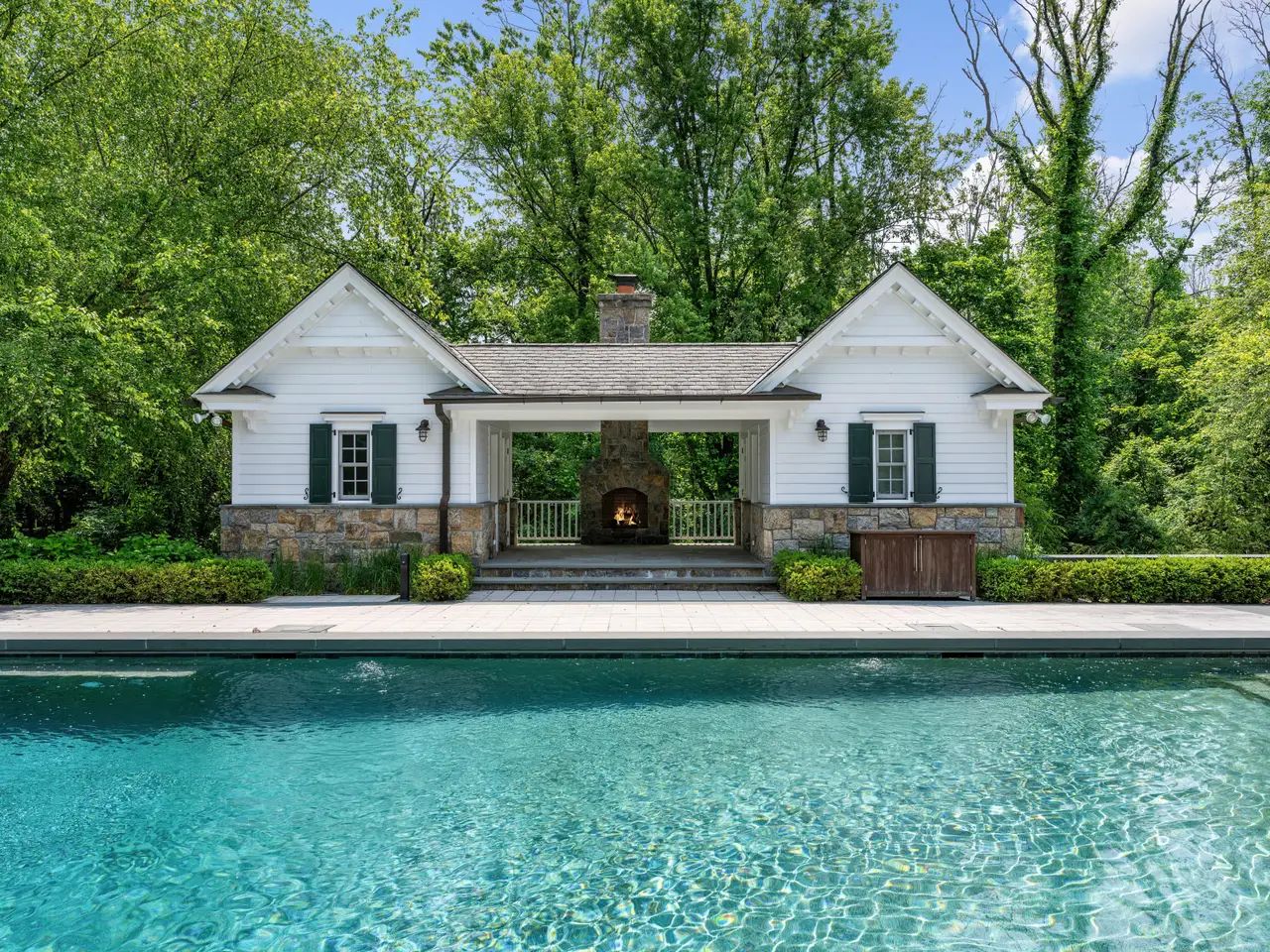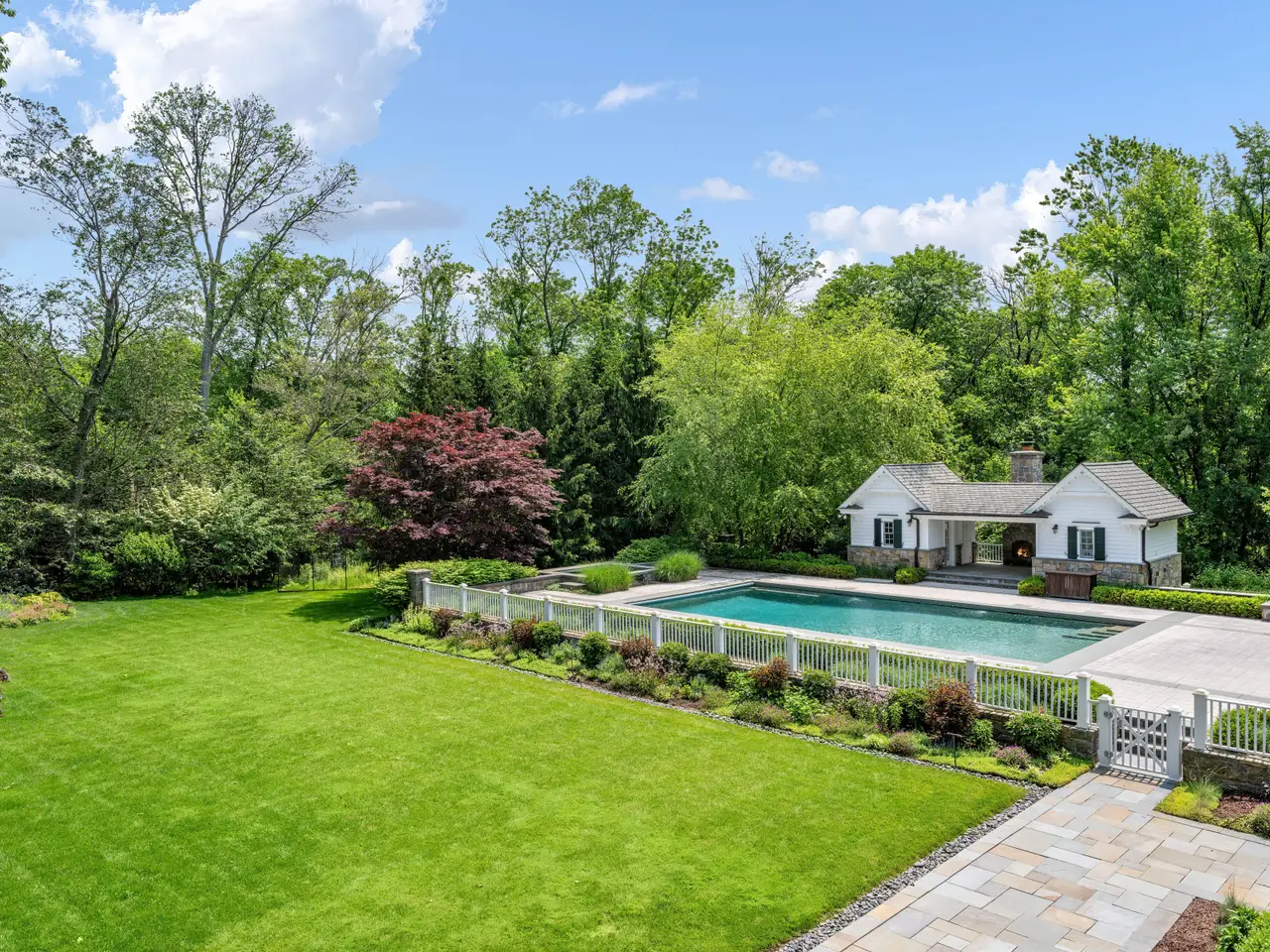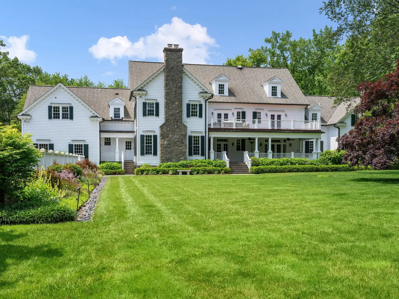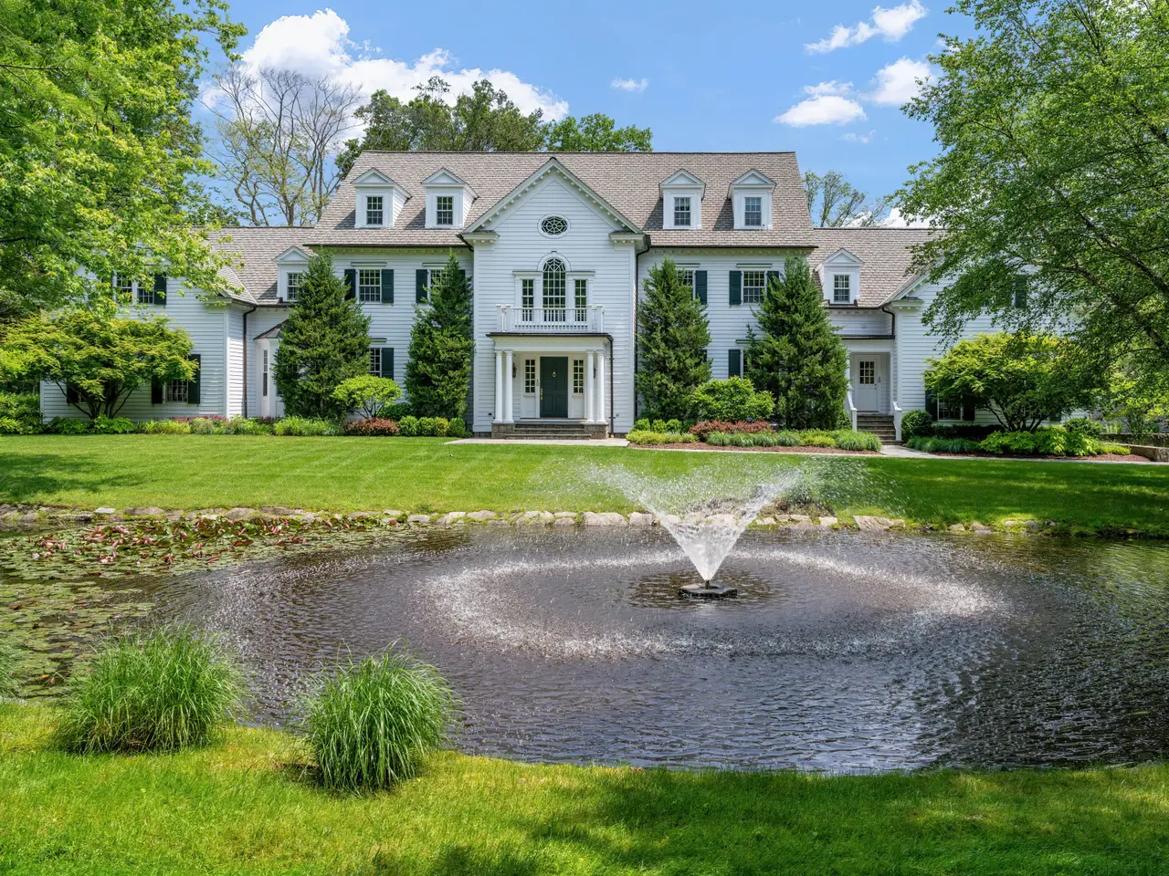 Privately nestled behind gates on 2.89 lush acres, this classically updated 8-bedroom, 8.3-bath New England Colonial offers unmatched elegance, space, and serenity. With a picturesque natural pond in front and sweeping golf course views in back, this estate is a rare and refined offering. From the moment you arrive, the charm is undeniable - from the stately approach to the beautifully maintained grounds. Inside, the first floor features a formal living or greeting room, a richly paneled library with bespoke millwork, a private office with custom built-ins, and a spectacular great room/game room perfect for large-scale entertaining or intimate gatherings. The formal dining room is graciously sized for hosting and filled with natural light. At the heart of the home is the dream kitchen: Christopher Peacock cabinetry, an oversized island, two Sub-Zero refrigerators, two Bosch dishwashers, and seamless flow into the adjacent family room with fireplace and French doors leading to the expansive covered patio. Upstairs, discover four ensuite bedrooms, two additional bedrooms with a Jack-and-Jill bath, and a luxurious primary suite with a fireplace, private terrace, spa-like bathroom, custom dressing room, walk-in closet, and an additional full bath. The finished lower level is designed for recreation and relaxation, featuring a full home theater, gym, guest suite, game room, TV lounge, and abundant storage all beautifully finished and thoughtfully arranged. Outdoors, enjoy resort-style living with a sparkling pool and spa, perfectly manicured lawns, mature perennial gardens, and a full pool house with kitchenette, full bath, and laundry. This estate is a rare blend of timeless design, modern luxury, and extraordinary setting a true one-of-a-kind offering.