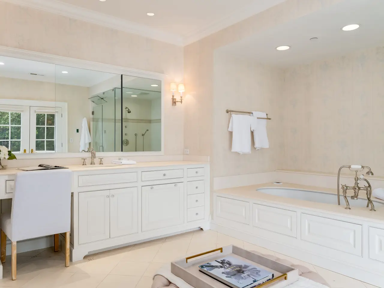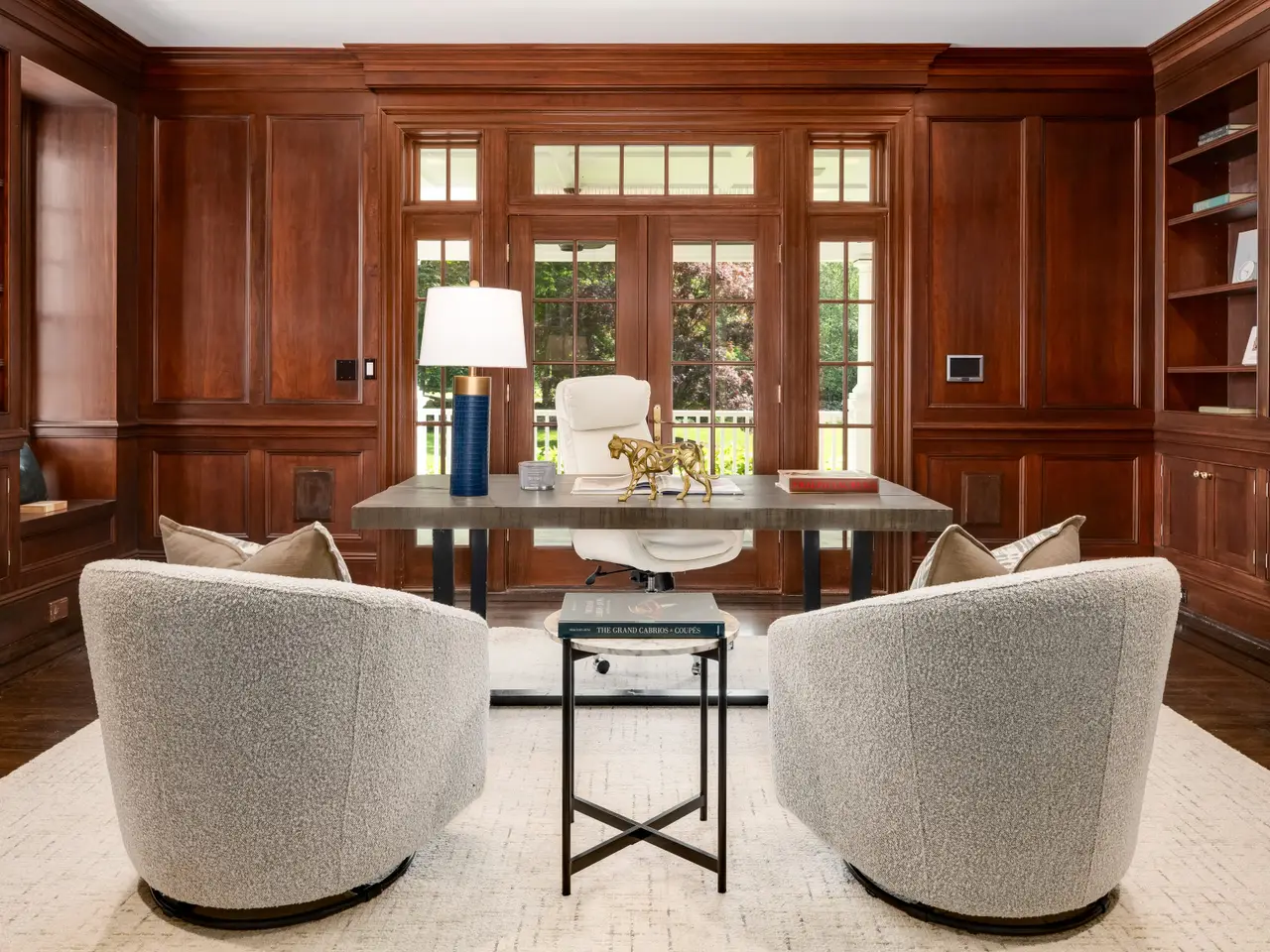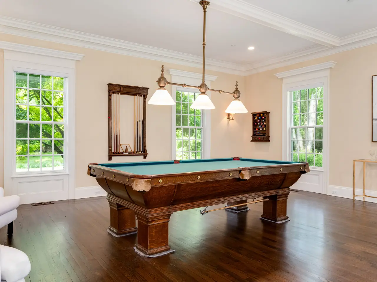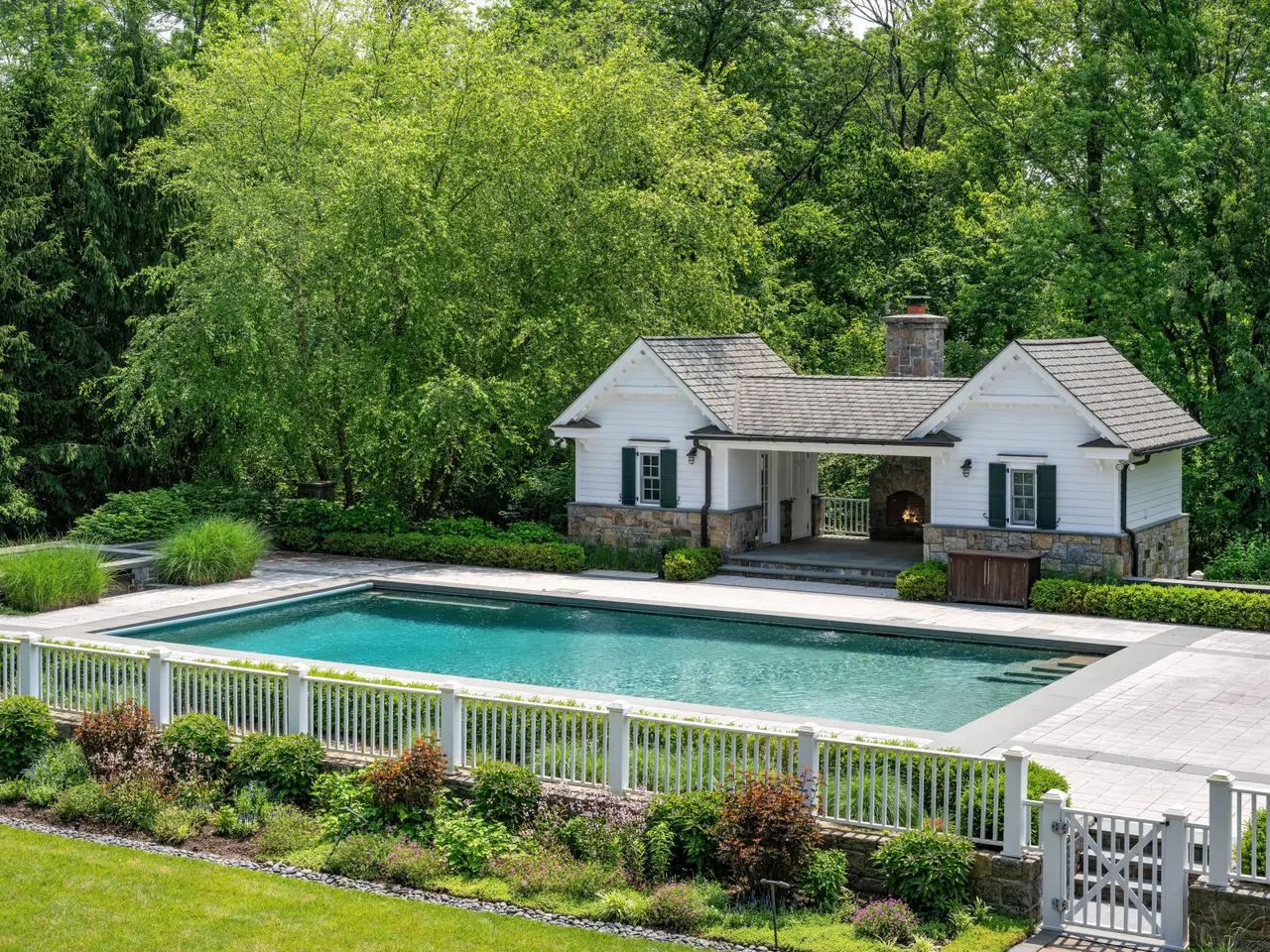 Privately nestled behind gates on 2.89 lush acres, this classically updated 8-bedroom, 8.3-bath New England Colonial offers unmatched elegance, space, and serenity. With a picturesque natural pond in front and sweeping golf course views in back, this estate is a rare and refined offering. From the moment you arrive, the charm is undeniable - from the stately approach to the beautifully maintained grounds. Inside, the first floor features a formal living or greeting room, a richly paneled library with bespoke millwork, a private office with custom built-ins, and a spectacular great room/game room perfect for large-scale entertaining or intimate gatherings. The formal dining room is graciously sized for hosting and filled with natural light. At the heart of the home is the dream kitchen: Christopher Peacock cabinetry, an oversized island, two Sub-Zero refrigerators, two Bosch dishwashers, and seamless flow into the adjacent family room with fireplace and French doors leading to the expansive covered patio. Upstairs, discover four ensuite bedrooms, two additional bedrooms with a Jack-and-Jill bath, and a luxurious primary suite with a fireplace, private terrace, spa-like bathroom, custom dressing room, walk-in closet, and an additional full bath. The finished lower level is designed for recreation and relaxation, featuring a full home theater, gym, guest suite, game room, TV lounge, and abundant storage all beautifully finished and thoughtfully arranged. Outdoors, enjoy resort-style living with a sparkling pool and spa, perfectly manicured lawns, mature perennial gardens, and a full pool house with kitchenette, full bath, and laundry. This estate is a rare blend of timeless design, modern luxury, and extraordinary setting a true one-of-a-kind offering.