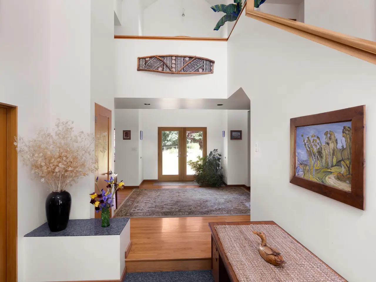 Tucked away on 3.75 acres of peaceful farmland, this custom Scandinavian-inspired home offers stunning southern exposure, all-day sun, and unforgettable sunsets. Thoughtfully designed with wood Pella windows, a durable metal roof, and over 2,850 sq.ft. of living space, the home showcases a thoughtful blend of timeless craftsmanship and contemporary design. The main level features soaring 24’ ceilings in the living room, a bright open kitchen and dining area, two bedrooms, a full bath, and a spacious garage with mudroom/laundry. Upstairs, the primary suite includes a walk-in closet and spa-like ensuite, alongside a large family room, flex space, and an oversized bedroom with rough-in ensuite. Multiple patios invite outdoor living, and the quiet, private setting offers a true retreat—just minutes from town and 20 minutes to Victoria.