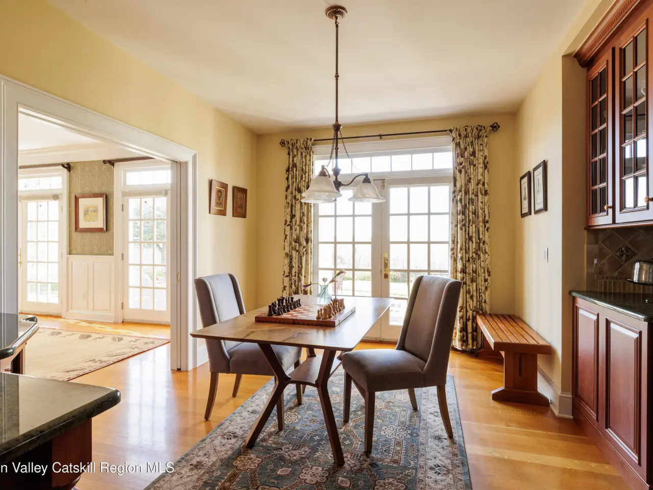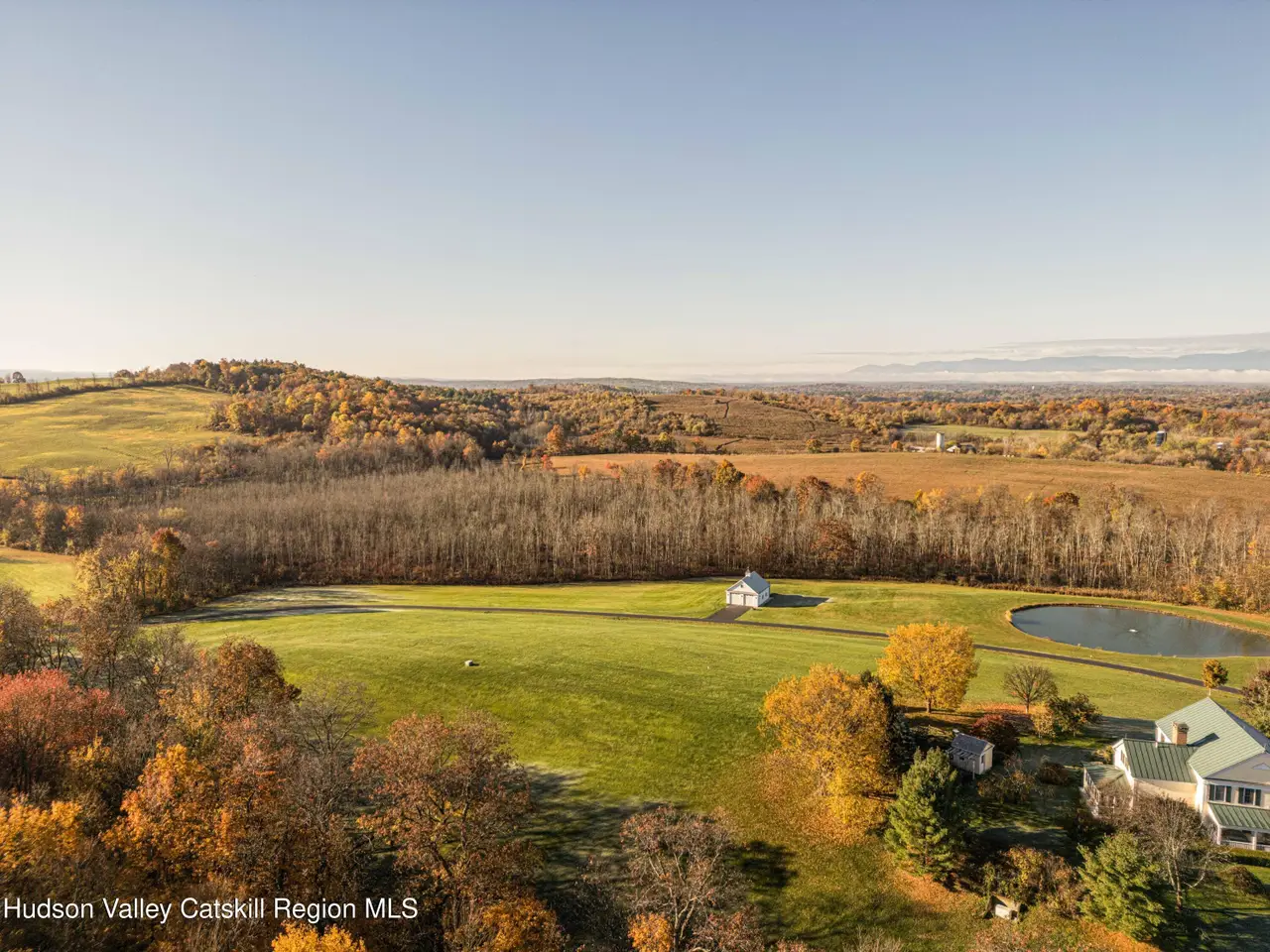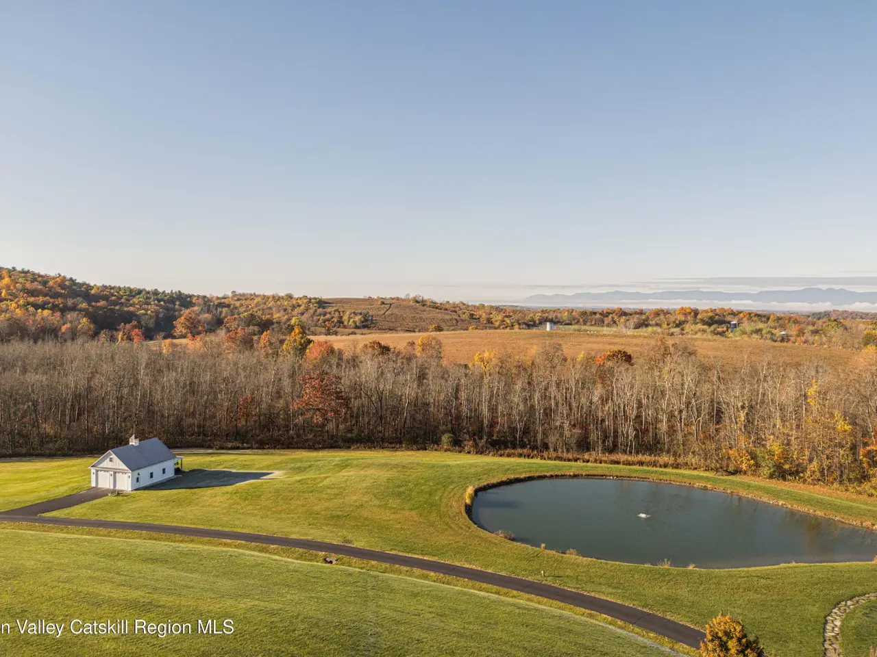 Welcome to Notre Colline Estate, a private country compound set on more than 56 acres of rolling meadows, gardens, ponds, and Catskill Mountain views. French for ''Our Hill,'' Notre Colline has an easy sense of belonging to its landscape. A long-paved drive leads to this elegantly designed 5,760 square-foot home, inspired by classic Greek Revival architecture. Built in 2005 for comfort, entertaining, and longevity, it features a standing-seam metal roof, radiant heated floors, energy-efficient heat pumps, and a fully integrated smart home system that manages lighting, temperature, security, video, and sound. The main level opens to bright, connected gathering spaces centered around a modern chef's kitchen with a large custom island, a counter depth paneled fridge, and professional-grade appliances. French doors from the dining area and breakfast nook open to a wide stone patio with an outdoor kitchen framed by landscaped gardens and open lawns, creating an easy indoor-outdoor flow. A paneled cherry wood office with built-in cabinetry and a wood-burning stove offers a quiet workspace beside a three-season sunroom, and a spacious living room with a gas fireplace invites relaxed evenings with friends and family. Upstairs, the grand primary suite feels like a private retreat, complete with a gas fireplace, two walk-in closets and a luxurious bath with a soaking tub and steam shower. Three additional bedrooms, a guest living room, two full bathrooms and a laundry room complete the second floor. The finished lower level adds generous additional living space with a recreation room, billiards area, kitchenette, sauna and full bath, ideal for guests or wellness use. An attached three-car heated garage features a porcelain tile floor and plenty of space for storage. Outdoors, a peaceful aerated pond lies at the center of the property, crossed by a charming footbridge and bordered by open lawns and walking paths. The grounds also include raised-bed gardens with irrigation, a potting shed, and a newly constructed insulated 26x34 foot outbuilding with water, electric, and space for six or more vehicles. Every detail has been considered for efficiency and ease, from spray-foam insulation and upgraded hydronic systems to improved drainage and a generator. Located minutes from Chatham village, Notre Colline Estate offers refined country living in beautiful Columbia County.