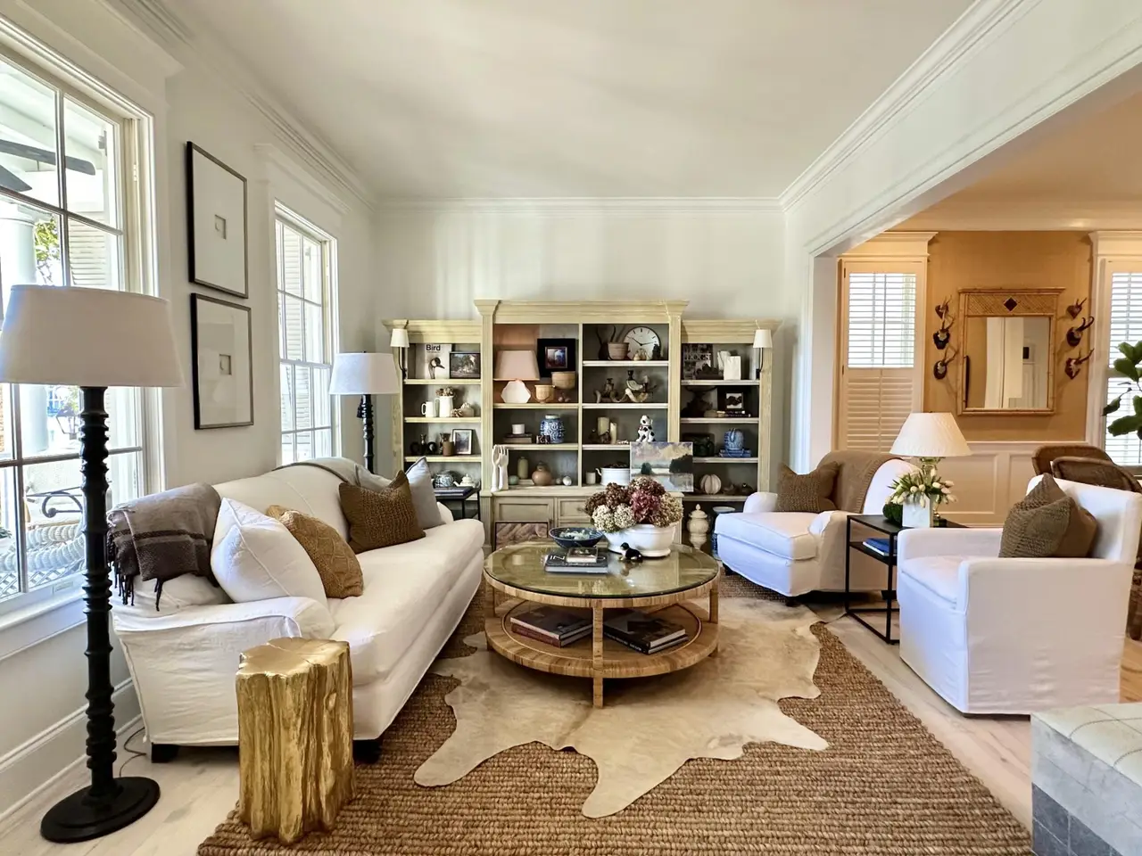 Large family room with fireplace and bookcases