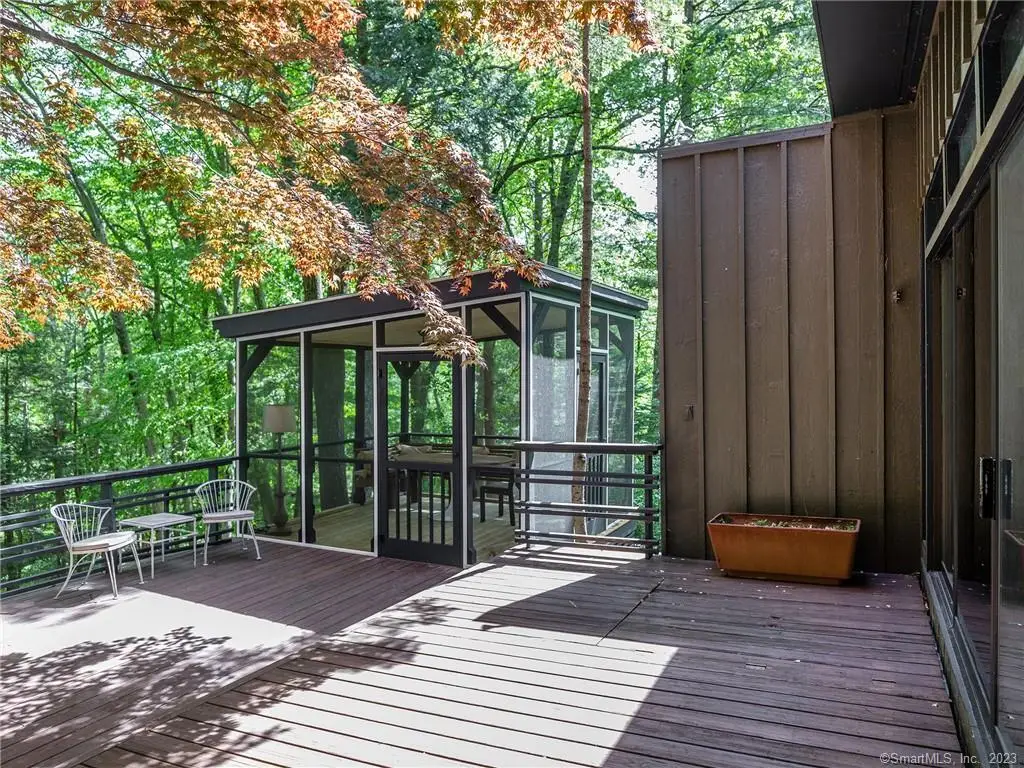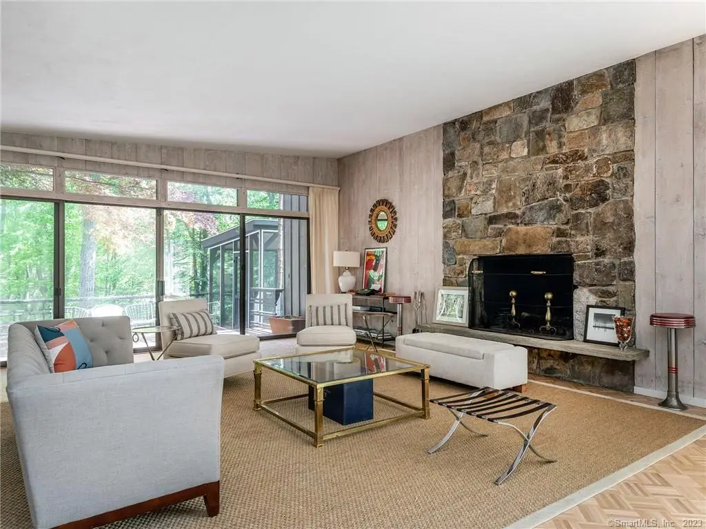 Chic Mid-Century Modern Retreat with Sunset Views and Ultimate Privacy! Tucked away in the heart of nature and bordered by the protected Steep Rock Preserve, this stylish single-level Mid-Century Modern home is the perfect weekend getaway. Designed for effortless living and entertaining, the spacious, light-filled layout includes 3 bedrooms and 3 full baths. A wall of floor-to-ceiling windows frames serene woodland views in the expansive living and dining area, anchored by a wood-burning fireplace. Step onto the side deck or into the charming enclosed sun porch, ideal spots for relaxing or hosting guests. The primary suite is a private haven with its own fireplace and en suite bath. The cheerful kitchen and bright breakfast nook open to the backyard oasis, featuring a secluded, heated Gunite pool surrounded by lush landscaping. Whether you're seeking quiet weekends or lively gatherings, this home offers both in a peaceful, sought-after setting. Enjoy direct access to miles of hiking trails on almost 1,000 acres of Steep Rock land. Just minutes from Washington Depot, The Mayflower Inn, and only 90 minutes from NYC. No laundry on-site. Owner uses local service.