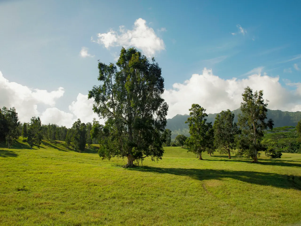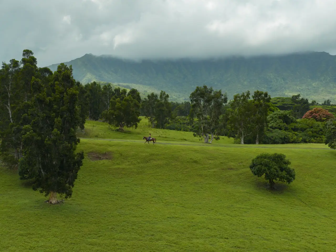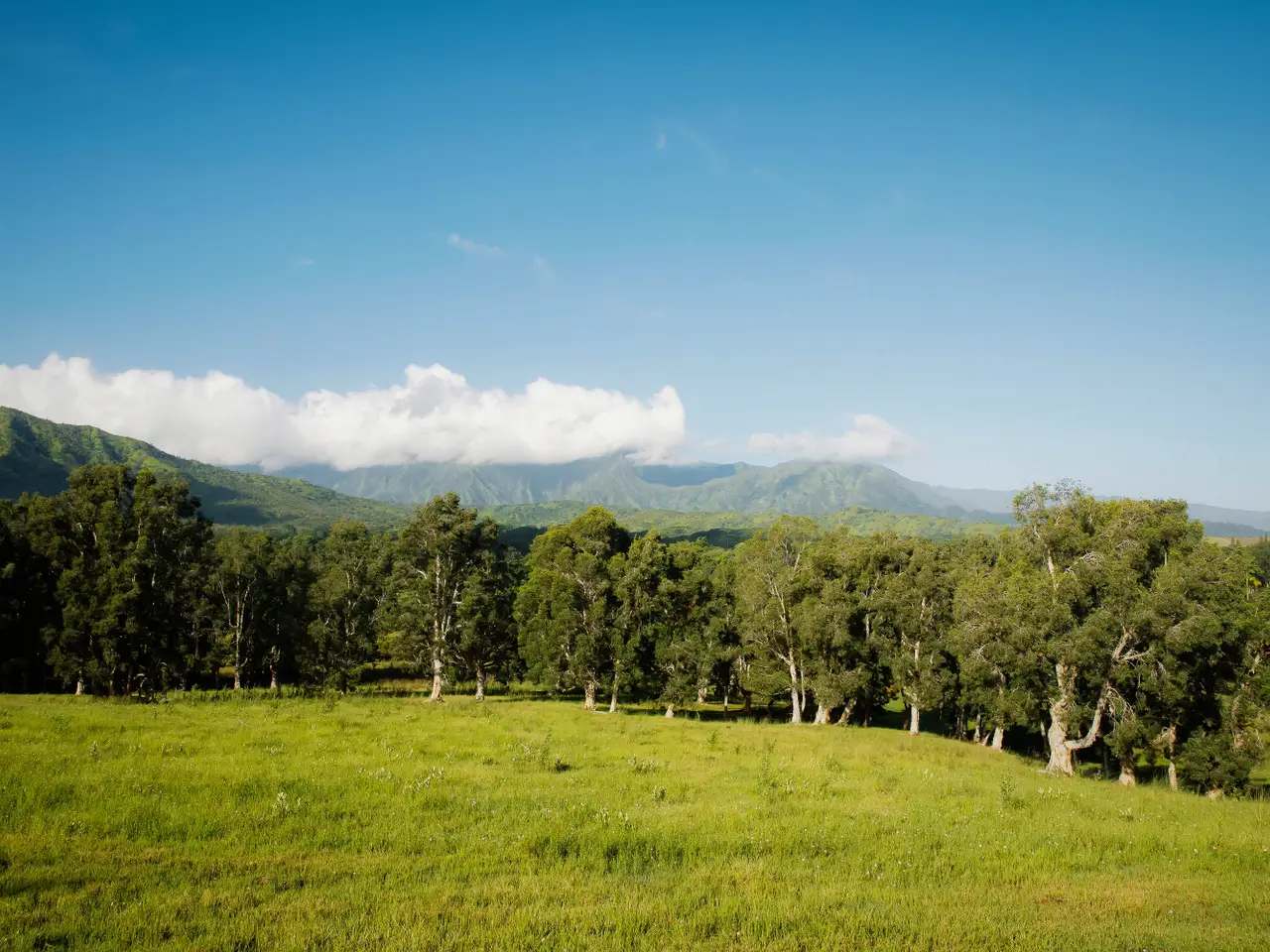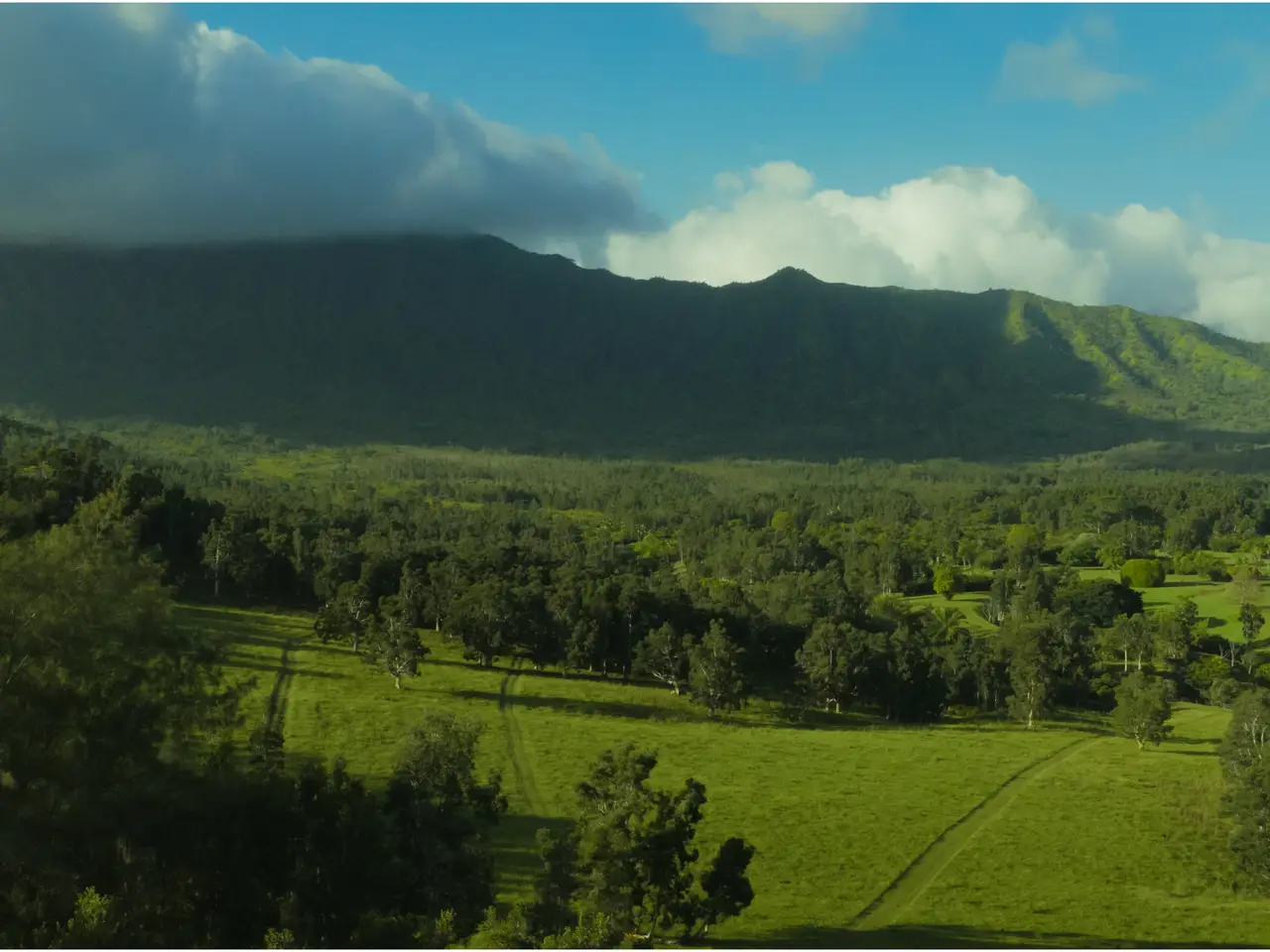 At the base of Mount Namahana, Halaulani spans more than sixty-three acres of rolling pastures, forest edge, and stream valley on Kaua‘i’s North Shore. Accessed by a private truss bridge, the property unfolds across open meadows, ridgelines, and valleys bordered by thousands of feet of deep-flowing, swimmable stream. The land features broad pastures, a mature eucalyptus grove, and varied riding terrain with panoramic mountain views. A historic stone dam and established water features highlight the land’s natural character and scale. Halaulani offers a rare combination of size, beauty, and seclusion in one of the North Shore’s most scenic settings. It is a landscape shaped by water, land, light and sky; quiet, natural, and enduring.