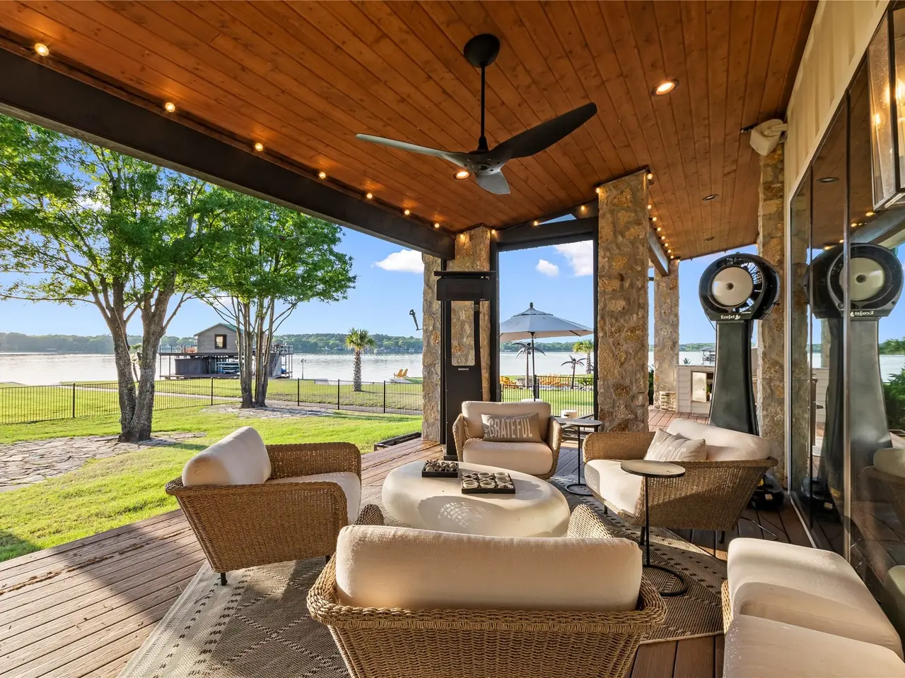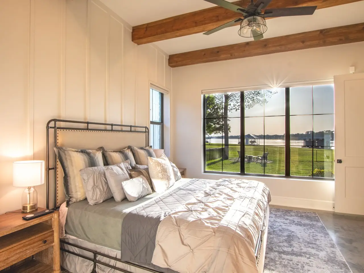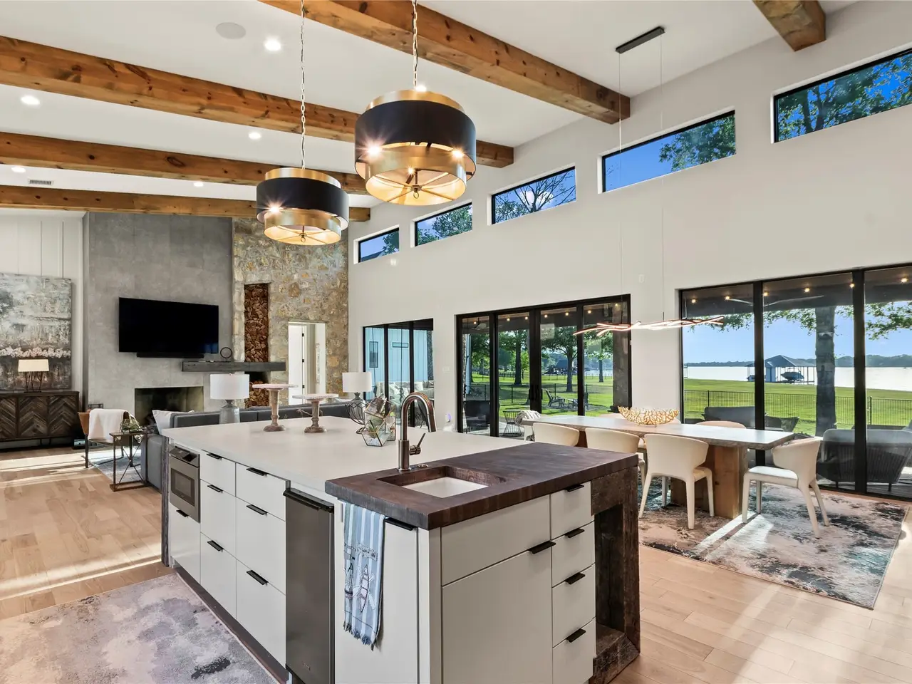 • Wall of windows with lake views