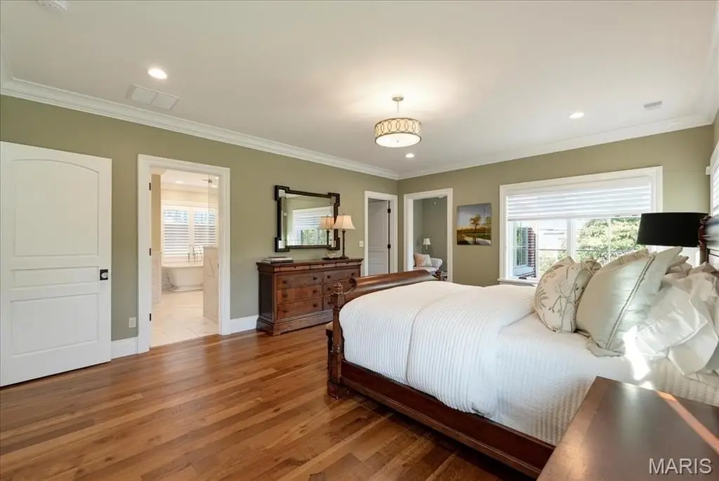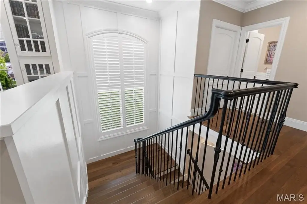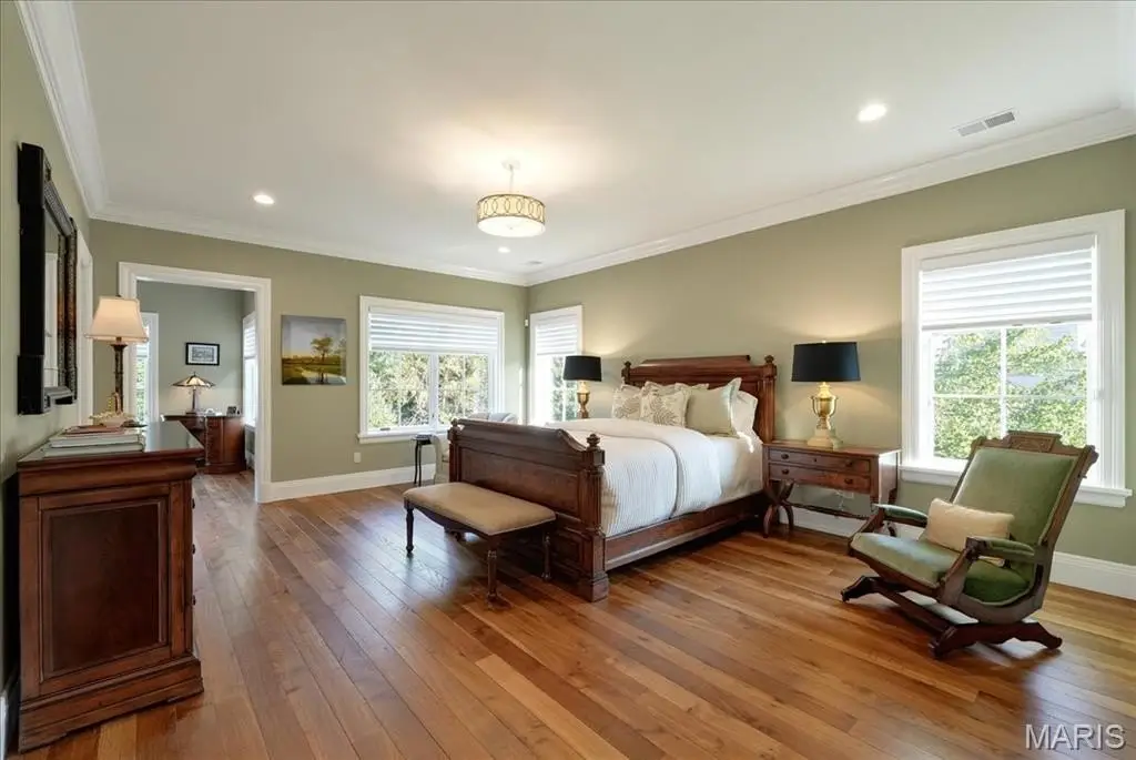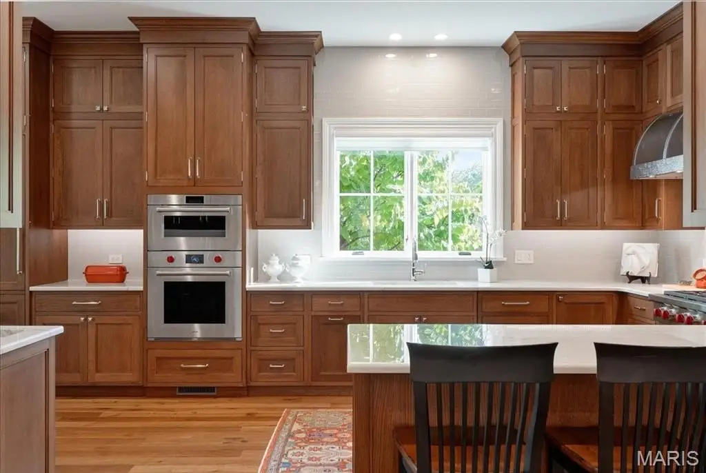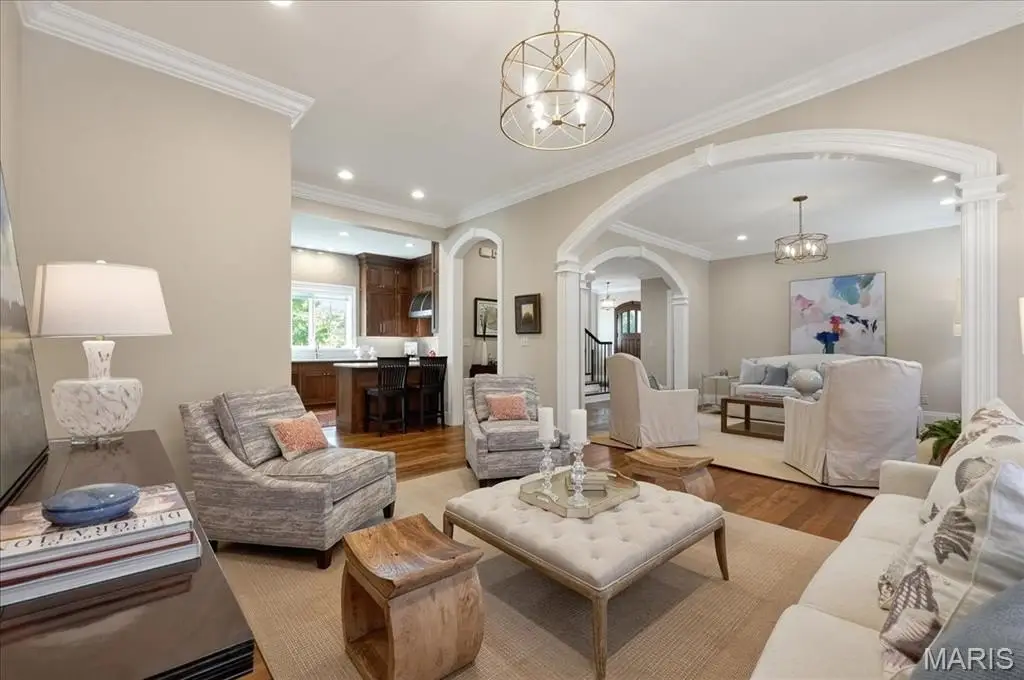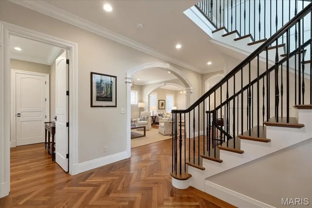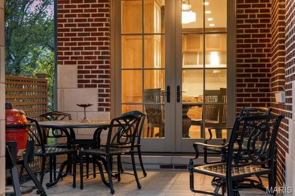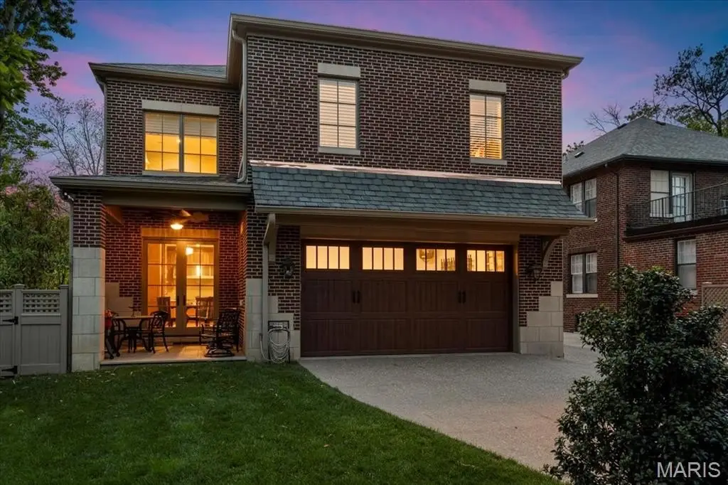Constructed of brick and limestone, this newer home evokes the timeless charm of historic architecture while blending harmoniously into the surroundings of Old Town Clayton. Designed with impeccable attention to detail, the home boasts European oak floors, detailed moldings, and 10-foot and 9-foot ceilings on the main and second levels, offering refined comfort throughout. The gracious living room with a gas fireplace flows into a spacious dining area and a custom kitchen featuring rift-sawn Plato cabinetry, Sub-Zero and Wolf appliances, and a custom hammered stainless steel hood. The serene primary suite upstairs includes a versatile adjacent room, a large walk-in closet, and a luxurious bath with a soaking tub, steam shower, Vaughn sconces, and Robern cabinets. A second ensuite bedroom boasts restored Vitrolite tile, while a third bedroom has a direct access full bath. Completing the upper level is an oversized laundry room and a loft with leaded glass cabinetry and a window seat with views to downtown Clayton. A large family room with a wet bar, full bath, bedroom, and second laundry is found on the lower level. Additional features include geothermal HVAC, attached two-car and detached one-car heated garages, and an elevator shaft ready to serve all floors. Across from Taylor Park and within walking distance to Clayton’s shops and dining, this home offers luxury, location, and lifestyle. Optional adjacent duplex available for expanded living or investment.