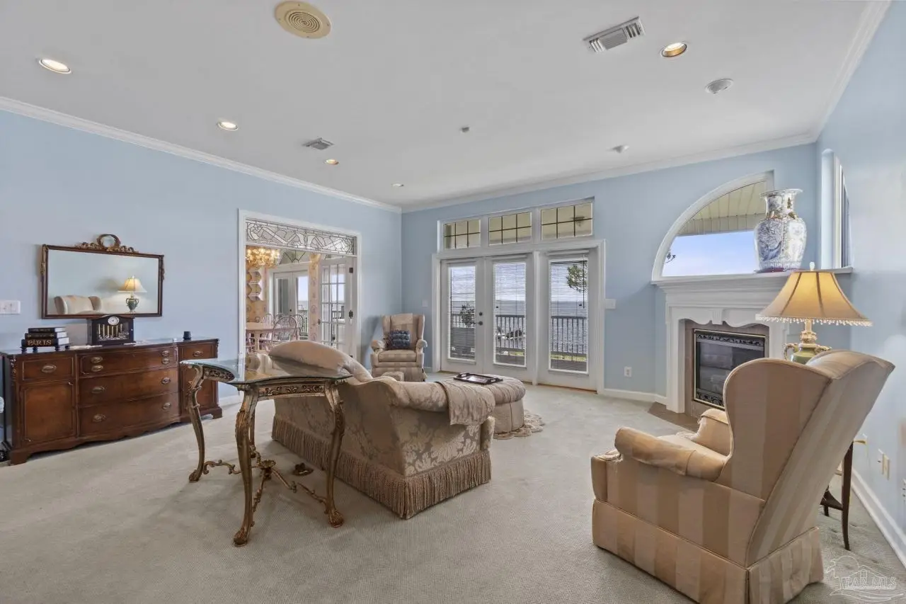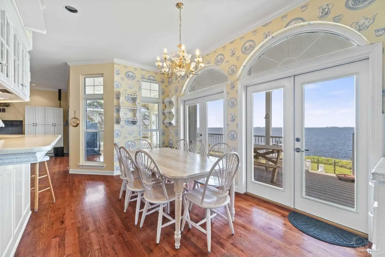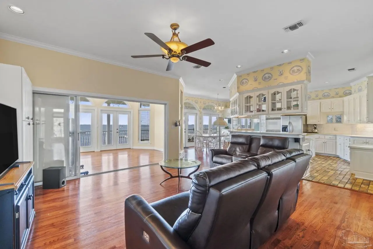 Waterfront living reaches new heights at this exceptional Soundside East retreat, offering 97 feet of Intracoastal Waterway frontage is designed for seamless indoor-outdoor living, this custom-built home showcases panoramic bay views from nearly every room and featuring a flowing, multi-level layout ideal for both everyday comfort and elegant entertaining. The main level includes a spacious den, formal dining, and a flexible room perfect for a studio or office-all connected to a chef's kitchen with Silestone Quartz countertops, double ovens, custom floating cabinetry, and generous prep space. Upstairs, the primary suite features vaulted ceilings, oversized closets, and a wall of windows framing stunning water views. Additional bedrooms offer privacy and comfort for family or guests. The expansive garage accommodates up to eight vehicles and two golf carts, with room for kayaks, paddleboards, and a workshop. Eight insulated, wind-loaded garage doors and elevated breaker panels reflect the home's smart engineering. Built for longevity and storm resilience, the property features a 50-year synthetic slate roof with stainless fasteners, copper flashing, storm shutters, new AZEK and TREX decking, and AQUA-DEK flow-through flooring off the primary suite. Additional highlights include an elevator, direct-vent fireplace, natural gas appliances, two 2024-installed water heaters, and whole-home systems like central vacuum, intercom, intelligent thermostats, and REME-HALO air purifiers. A rock seawall, aluminum dock grating, and a well-equipped irrigation system complete the exterior. Facing south across the Intracoastal Waterway and directly across from the protected National Seashore, this home offers rare, forever-protected views. Located minutes from top schools, shopping, dining, and the white sands of Pensacola Beach, this Soundside East home blends luxury, efficiency, and timeless coastal living.