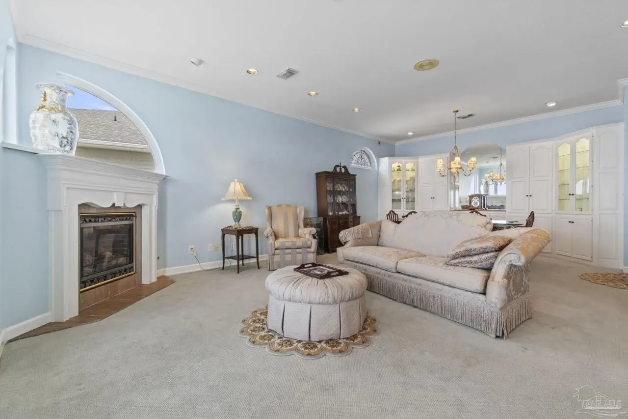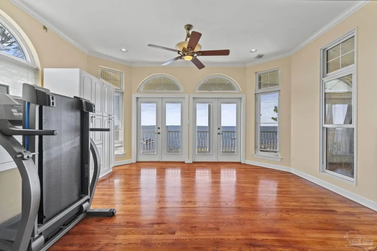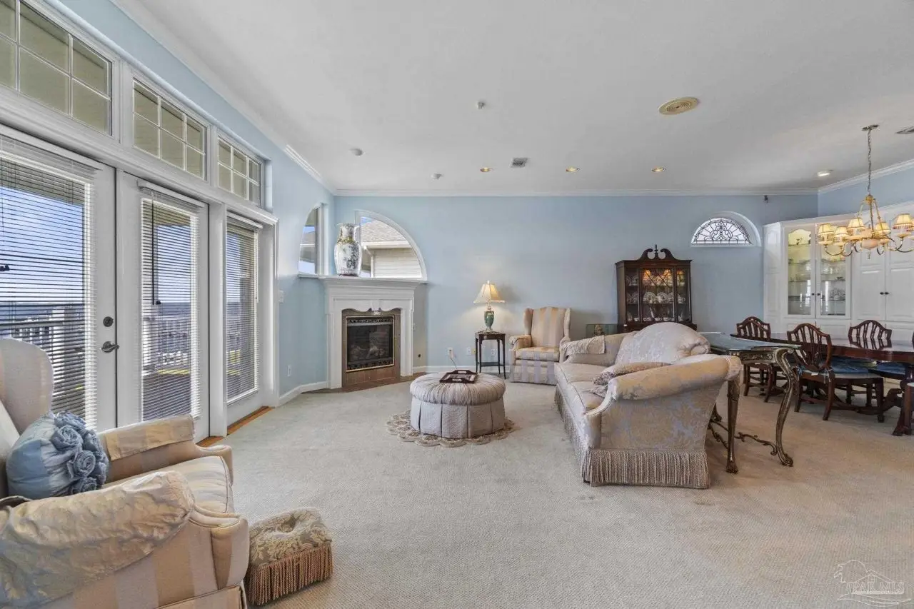 Waterfront living reaches new heights at this exceptional Soundside East retreat, offering 97 feet of Intracoastal Waterway frontage is designed for seamless indoor-outdoor living, this custom-built home showcases panoramic bay views from nearly every room and featuring a flowing, multi-level layout ideal for both everyday comfort and elegant entertaining. The main level includes a spacious den, formal dining, and a flexible room perfect for a studio or office-all connected to a chef's kitchen with Silestone Quartz countertops, double ovens, custom floating cabinetry, and generous prep space. Upstairs, the primary suite features vaulted ceilings, oversized closets, and a wall of windows framing stunning water views. Additional bedrooms offer privacy and comfort for family or guests. The expansive garage accommodates up to eight vehicles and two golf carts, with room for kayaks, paddleboards, and a workshop. Eight insulated, wind-loaded garage doors and elevated breaker panels reflect the home's smart engineering. Built for longevity and storm resilience, the property features a 50-year synthetic slate roof with stainless fasteners, copper flashing, storm shutters, new AZEK and TREX decking, and AQUA-DEK flow-through flooring off the primary suite. Additional highlights include an elevator, direct-vent fireplace, natural gas appliances, two 2024-installed water heaters, and whole-home systems like central vacuum, intercom, intelligent thermostats, and REME-HALO air purifiers. A rock seawall, aluminum dock grating, and a well-equipped irrigation system complete the exterior. Facing south across the Intracoastal Waterway and directly across from the protected National Seashore, this home offers rare, forever-protected views. Located minutes from top schools, shopping, dining, and the white sands of Pensacola Beach, this Soundside East home blends luxury, efficiency, and timeless coastal living.
