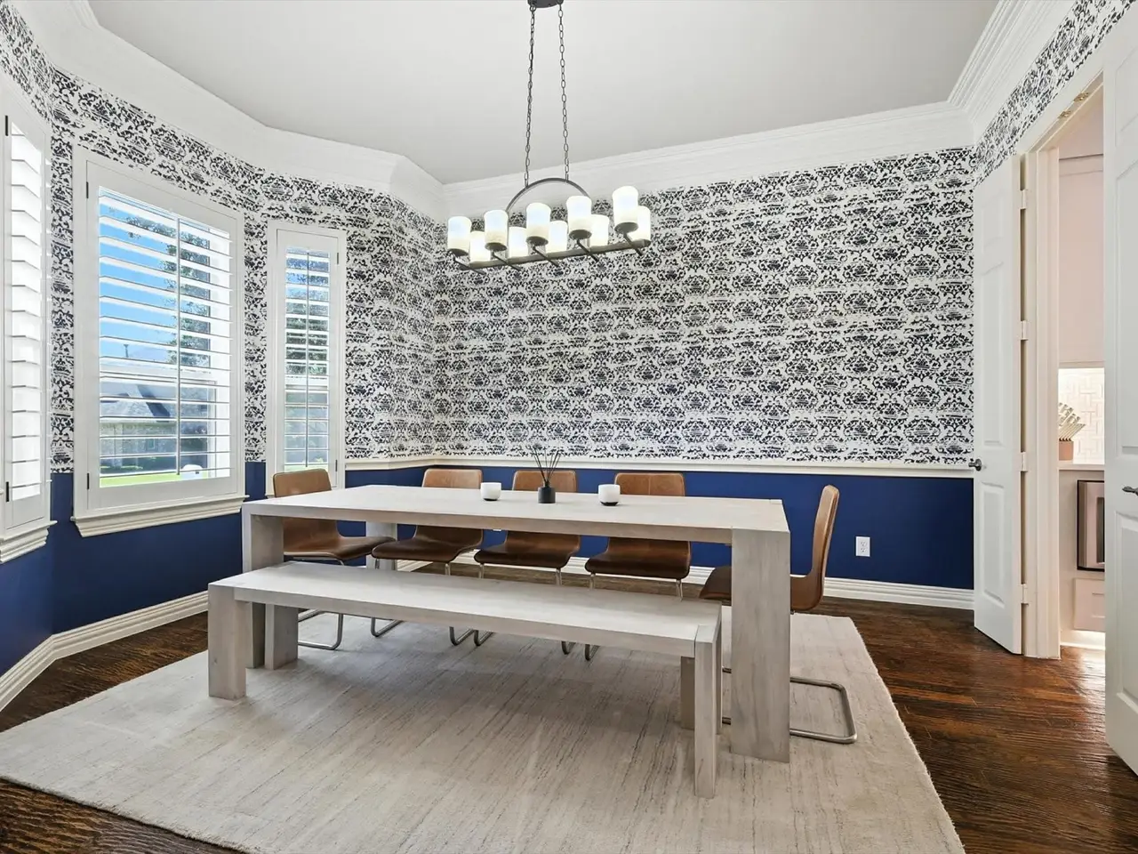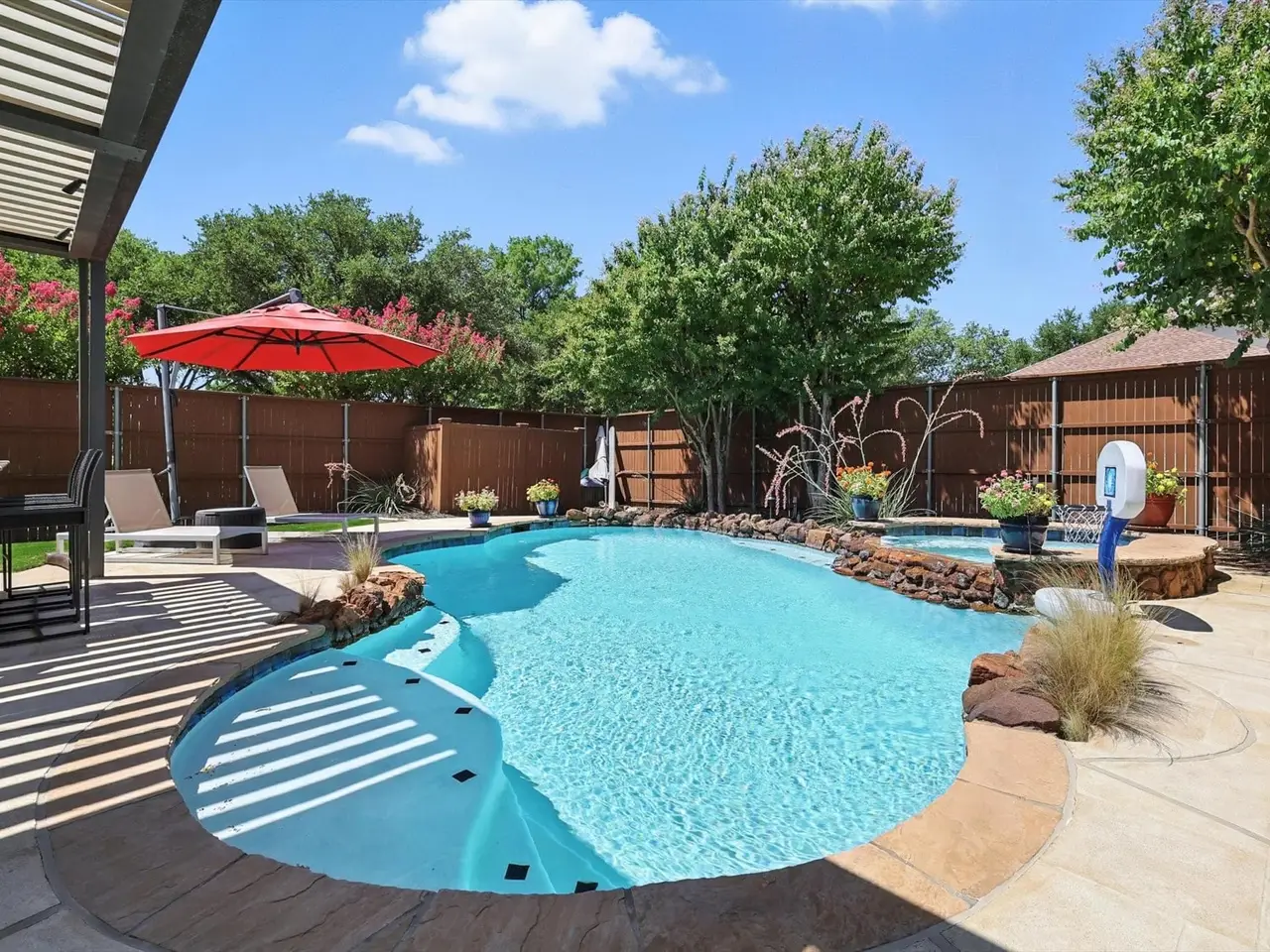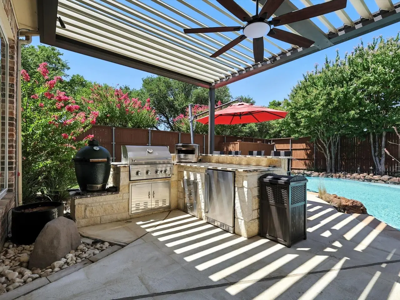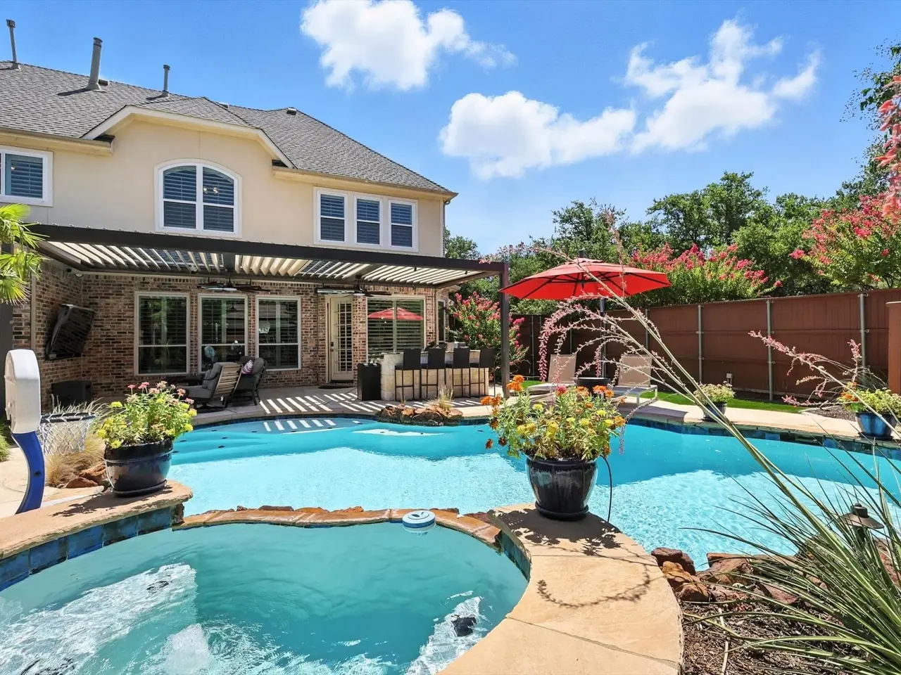 Welcome to 2354 Clearspring Drive N, located in the highly sought-after gated community of Hackberry Creek. This beautifully updated 4 bed, 3 bath home sits on a premium corner lot with circle drive, striking brick and stone exterior, and lush, professional landscaping. Step inside to a light-filled foyer that offers a direct view to the backyard retreat. The formal dining room, wrapped in custom wallpaper, complements a front flex room currently styled as a wine lounge, with views into the kitchen and front yard. The chefs kitchen features custom cabinetry, a large quartz island with bar seating, marble backsplash, stainless steel appliances, and designer lighting - all flowing seamlessly into the living and breakfast areas with backyard views. The living room centers around a custom gas fireplace with built-in shelving. A private guest suite and remodeled full bath are located downstairs. Upstairs, the spacious primary suite overlooks the pool and boasts a spa-like bath with slate floors, rain shower, jetted tub, dual vanities, and walk-in closet. Two additional bedrooms, a shared bath with separate vanities, and a game room with built-ins complete the second level. The outdoor space is a true retreat, featuring a built-in kitchen with granite counters, bar seating, propane grill, refrigerator, and drawers. A custom motorized louvered pergola with dual ceiling fans and heaters offers adjustable shade and comfort year-round. The resurfaced, heated pool with spa and water feature is bordered by flagstone and Carvestone decking - perfect for entertaining. Additional highlights include an oversized garage with epoxy flooring and bonus storage, plantation shutters throughout, and a downstairs utility room with sink. Hackberry Creek offers three private parks, neighborhood events, and quick access to Hwy's 114, 635, and 161. The community is also within Coppell ISDs limited open enrollment program. Refined, functional, and move-in readythis home is not to be missed!