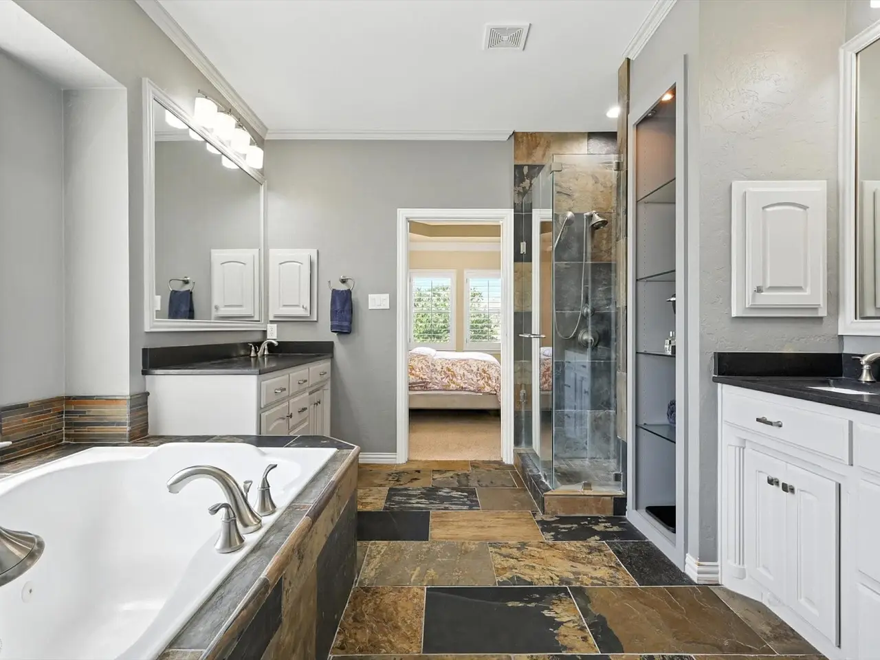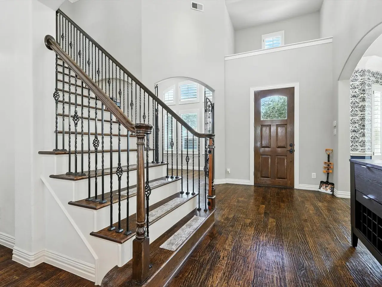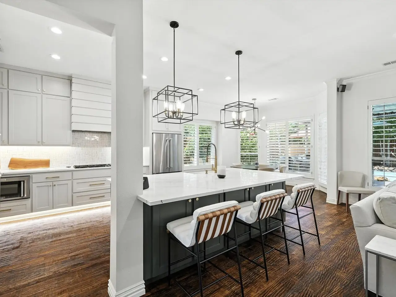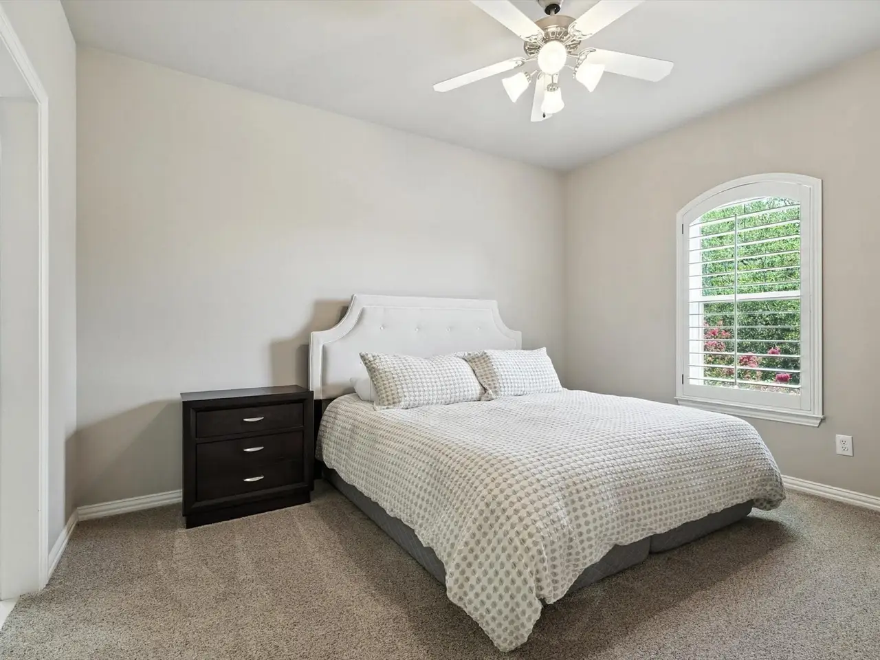 Welcome to 2354 Clearspring Drive N, located in the highly sought-after gated community of Hackberry Creek. This beautifully updated 4 bed, 3 bath home sits on a premium corner lot with circle drive, striking brick and stone exterior, and lush, professional landscaping. Step inside to a light-filled foyer that offers a direct view to the backyard retreat. The formal dining room, wrapped in custom wallpaper, complements a front flex room currently styled as a wine lounge, with views into the kitchen and front yard. The chefs kitchen features custom cabinetry, a large quartz island with bar seating, marble backsplash, stainless steel appliances, and designer lighting - all flowing seamlessly into the living and breakfast areas with backyard views. The living room centers around a custom gas fireplace with built-in shelving. A private guest suite and remodeled full bath are located downstairs. Upstairs, the spacious primary suite overlooks the pool and boasts a spa-like bath with slate floors, rain shower, jetted tub, dual vanities, and walk-in closet. Two additional bedrooms, a shared bath with separate vanities, and a game room with built-ins complete the second level. The outdoor space is a true retreat, featuring a built-in kitchen with granite counters, bar seating, propane grill, refrigerator, and drawers. A custom motorized louvered pergola with dual ceiling fans and heaters offers adjustable shade and comfort year-round. The resurfaced, heated pool with spa and water feature is bordered by flagstone and Carvestone decking - perfect for entertaining. Additional highlights include an oversized garage with epoxy flooring and bonus storage, plantation shutters throughout, and a downstairs utility room with sink. Hackberry Creek offers three private parks, neighborhood events, and quick access to Hwy's 114, 635, and 161. The community is also within Coppell ISDs limited open enrollment program. Refined, functional, and move-in readythis home is not to be missed!