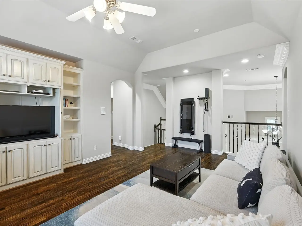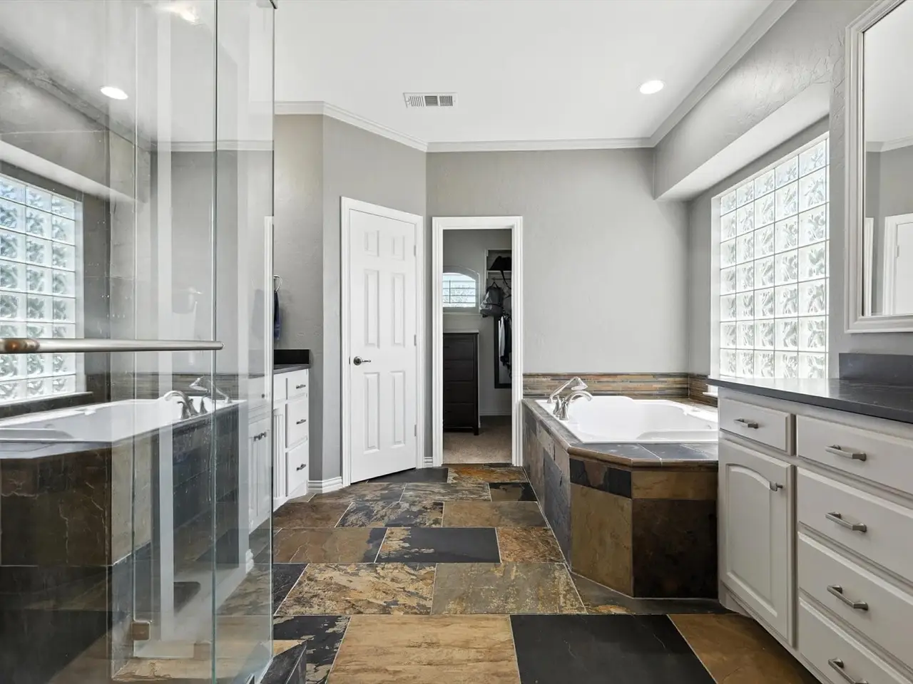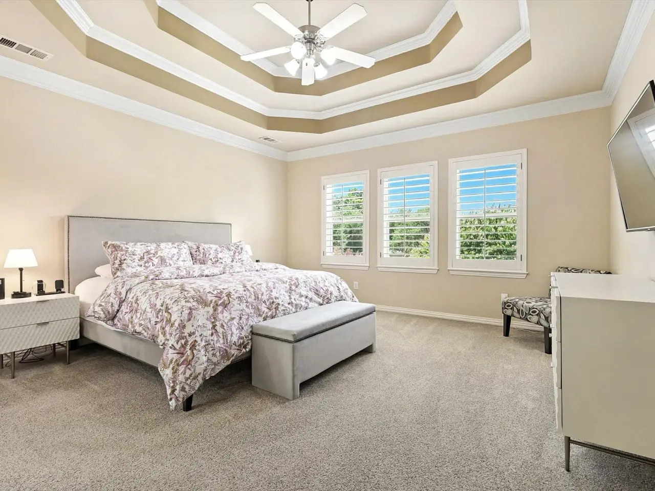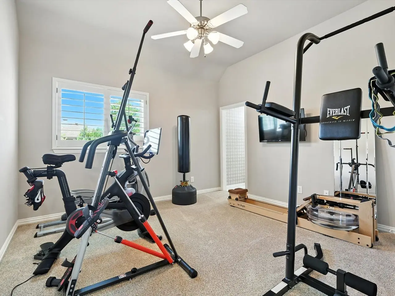 Welcome to 2354 Clearspring Drive N, located in the highly sought-after gated community of Hackberry Creek. This beautifully updated 4 bed, 3 bath home sits on a premium corner lot with circle drive, striking brick and stone exterior, and lush, professional landscaping. Step inside to a light-filled foyer that offers a direct view to the backyard retreat. The formal dining room, wrapped in custom wallpaper, complements a front flex room currently styled as a wine lounge, with views into the kitchen and front yard. The chefs kitchen features custom cabinetry, a large quartz island with bar seating, marble backsplash, stainless steel appliances, and designer lighting - all flowing seamlessly into the living and breakfast areas with backyard views. The living room centers around a custom gas fireplace with built-in shelving. A private guest suite and remodeled full bath are located downstairs. Upstairs, the spacious primary suite overlooks the pool and boasts a spa-like bath with slate floors, rain shower, jetted tub, dual vanities, and walk-in closet. Two additional bedrooms, a shared bath with separate vanities, and a game room with built-ins complete the second level. The outdoor space is a true retreat, featuring a built-in kitchen with granite counters, bar seating, propane grill, refrigerator, and drawers. A custom motorized louvered pergola with dual ceiling fans and heaters offers adjustable shade and comfort year-round. The resurfaced, heated pool with spa and water feature is bordered by flagstone and Carvestone decking - perfect for entertaining. Additional highlights include an oversized garage with epoxy flooring and bonus storage, plantation shutters throughout, and a downstairs utility room with sink. Hackberry Creek offers three private parks, neighborhood events, and quick access to Hwy's 114, 635, and 161. The community is also within Coppell ISDs limited open enrollment program. Refined, functional, and move-in readythis home is not to be missed!