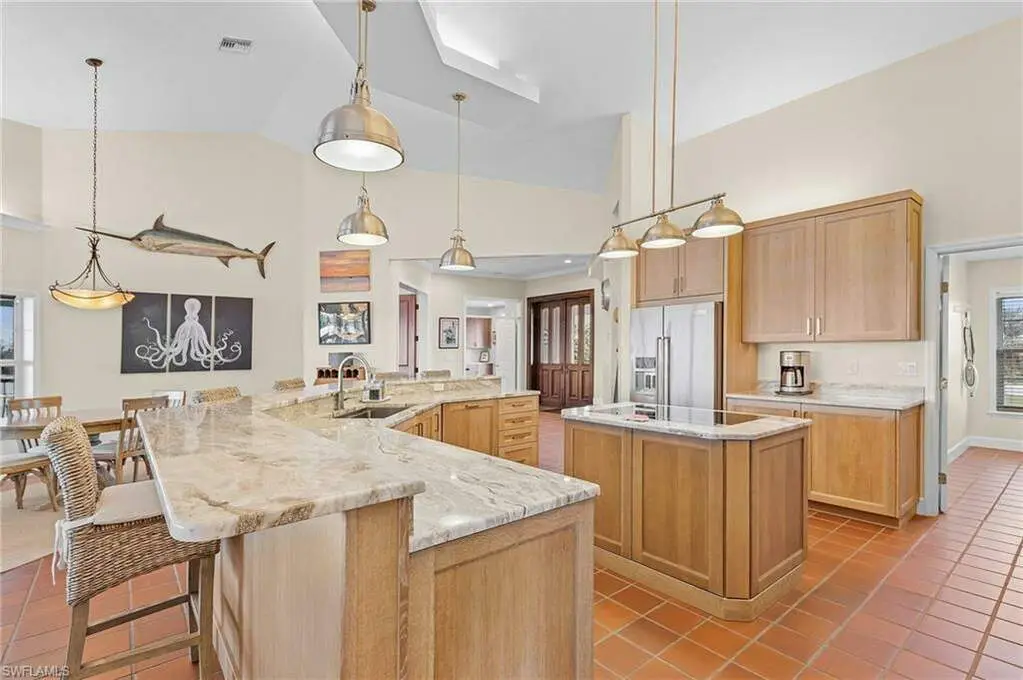 This home has it all. It sits on a gorgeous interior bay with big views. You can safely keep your boats behind your house. It has a large dock with space for four boats with two boat lifts. There is a large backyard with a pool and spa with a paver patio. Below the home is a large carport for your cars and toys, plus almost 2300 square feet of storage, workshop, craft room, or whatever. Take a look at the interior photos. There is too much to mention, but some of the highlights are a completely remodeled modern kitchen with granite countertops, two islands, and all new appliances, a separate living room and family room, a pass-through fireplace between the family room and primary bedroom, large primary bath with dual sinks and separate tub and shower, home office/library, all paver driveway and patios, huge porches front and rear (sunset views), and much more. The photos do a much better job of describing this home than anyone can. Here are more details: new kitchen-2017; new pool and pool deck-2021; new seawall-2020; replace front porch decking and railing-2018; replace back porch decking and railing-2019; new metal roof-2021; resod backyard-2021; redo guest bathroom tile, counter and cabinets-2020; new recessed lighting-2019; new solar fans in attic-2018; new office cabinets and countertop-2020; new electric at dock-2021; new hurricane windows, front of house-2018; new gutters-2017&2021; new fence-2021; new primary bathroom cabinets, lights, vanity counter, and shower door-2021-2022; new carpet-2022; new hurricane sliders-2023; new floor in sewing room-2023; new shelving in sewing room-2023; new front gutters-2023; pool salt sell replaced-2023; pool pump replaced-2022; new dock pilings and deck-2024; new washer-2020; new dryer-2022; new two-zone lawn sprinkler-2022; carport floor epoxied-2024. Make your appointment today to see this gem.