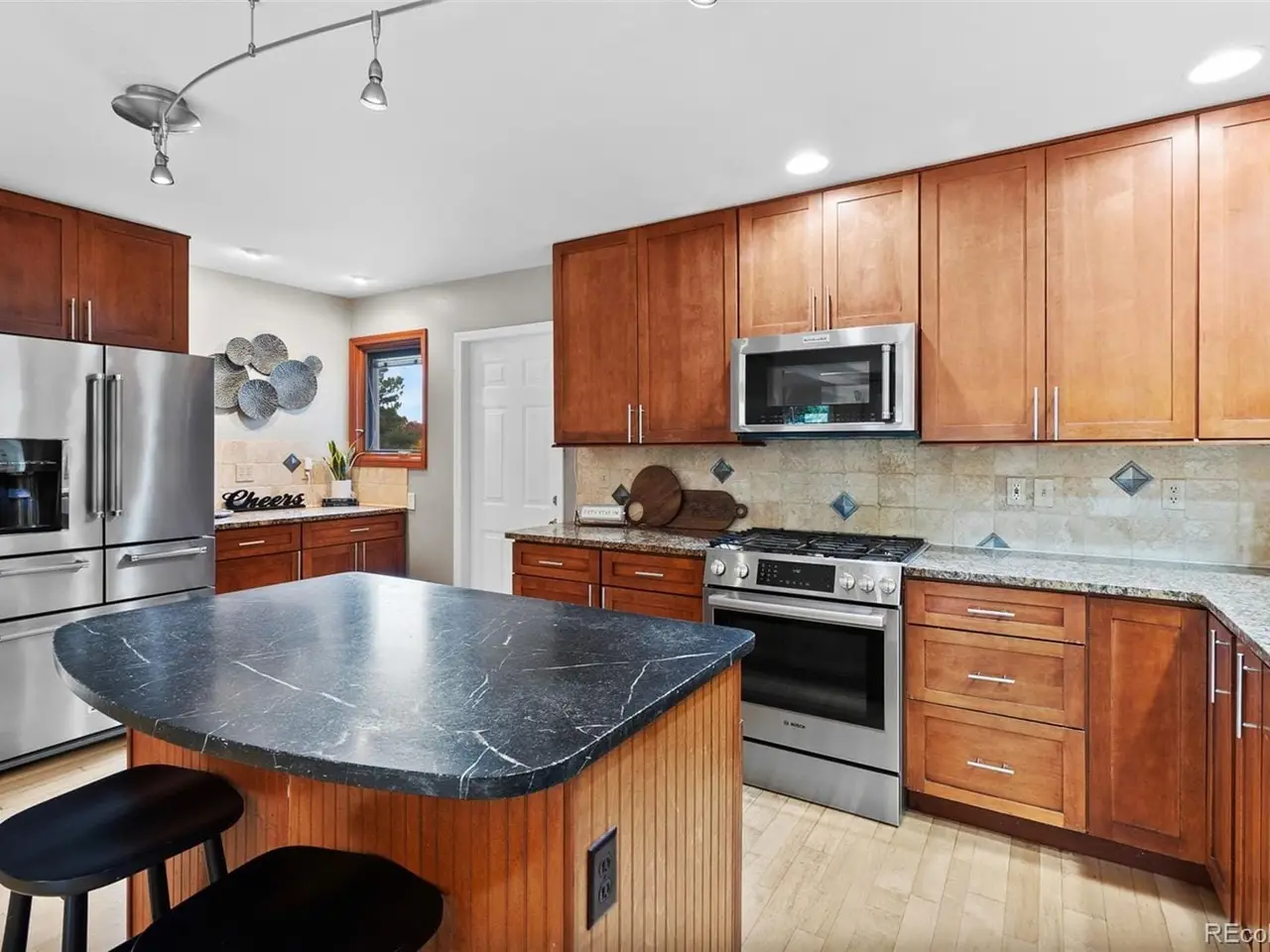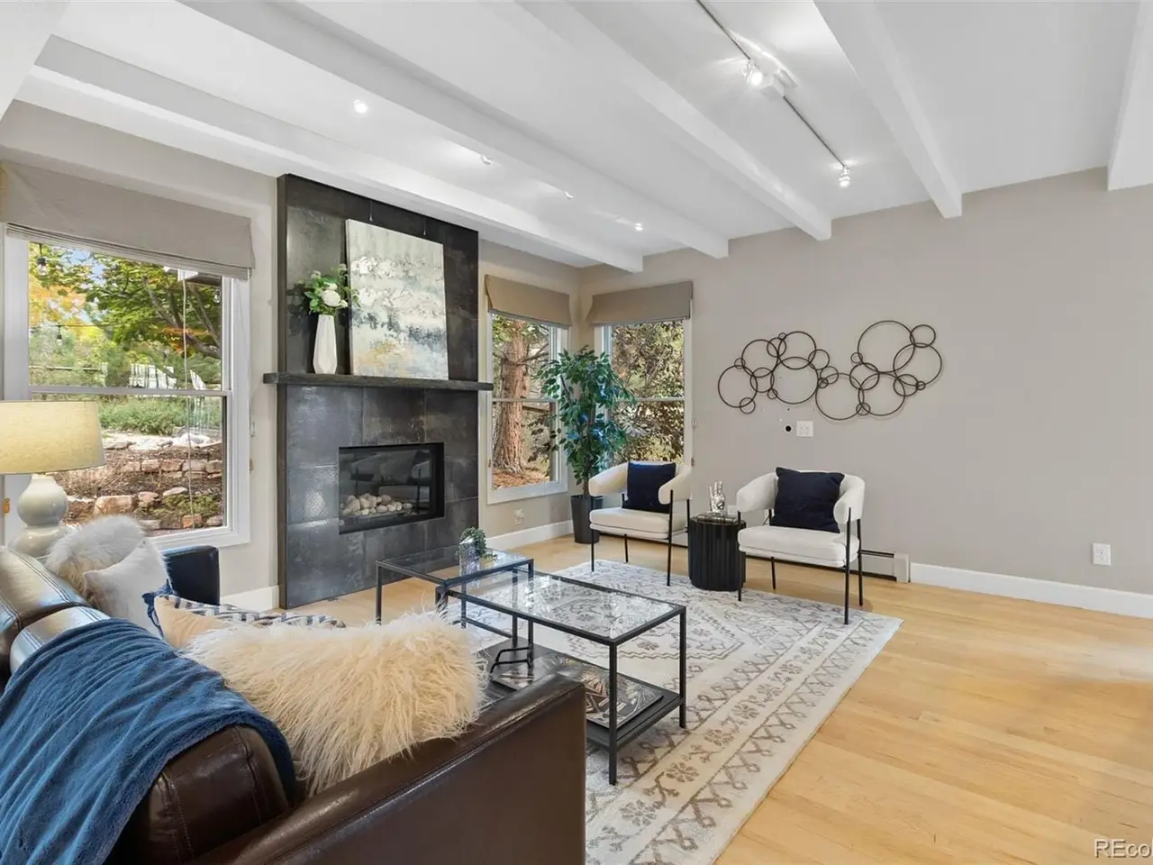 Presenting a distinctive home in a coveted Louisville location. This residence features abundant natural light, highlighted by wood floors, vaulted ceilings, and large windows. The open kitchen is designed for functionality, equipped with custom cabinets, granite countertops, and a central island, seamlessly connecting to the dining area and a spacious living room with a slate fireplace, making it ideal for entertaining.The main level includes a bedroom and bathroom, perfect for guests or as a private office. Upstairs, the primary suite showcases high beamed ceilings and dual closets, offering a comfortable retreat. Two additional bedrooms on this level provide generous space and light, enhanced by dormer windows and unique archways that add character to the home.The finished basement offers a versatile living area, including a cozy living room, a media/bonus space suitable for games or relaxation, and a renovated bathroom and bedroom, providing extra flexibility. Ample storage options are available throughout the home.The attached oversized garage provides space for a workshop and storage for bikes and outdoor equipment. Step outside to enjoy a wraparound deck overlooking a large yard and garden area, perfect for outdoor living and entertaining. Situated on a quiet cul-de-sac, this home offers direct access to trails, ensuring a peaceful environment while maintaining convenience. This is a rare opportunity to own a home in a desirable neighborhood, with no HOA fees, and easy access to Boulder and the many amenities that Louisville has to offer.