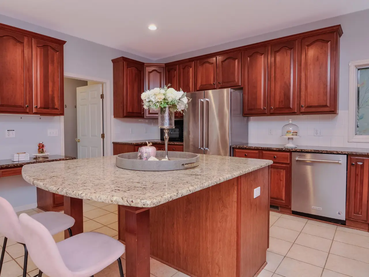 Spacious hilltop home backing to scenic Narrow Gauge Park offers privacy, wooded views, and updated landscaping. The impressive two-story foyer opens to a main floor with soaring 10-foot ceilings. The gourmet kitchen boasts a huge island, custom cherry cabinets, hardwood floors, granite counters, tile backsplash, and a walk-in pantry. The adjoining two-story family room features a gas fireplace and expansive windows framing beautiful park views. Also on the first floor: a formal dining room with hardwood floors and a private study. The luxurious primary suite offers a tray ceiling, walk-in closet, spa bath with Jacuzzi tub, separate shower, and a private deck. Upstairs are three spacious bedrooms, a Jack-and-Jill bath, plus another full bath.Home Energy Score of 4.