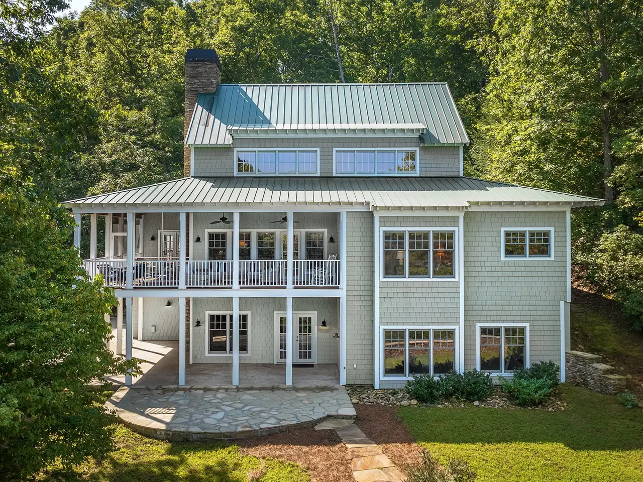 Idyllic lakefront home tucked in a private cove on Lake Adger is the perfect mountain getaway! Featuring year-round lake and mountain views, this home sits close to the water and has a gentle sloped yard with stone pathway to the lake and your own floating dock. This home checks all the boxes including an open floor plan, a large versatile kitchen, warm pine wood floors, and a marvelous great room with a dramatic two-story stacked stone fireplace and vaulted wood ceilings. The rooms are spacious, and the ceilings are almost 10' tall throughout. Relax and listen to the splashing creek from the wraparound covered porch or terrace level patio. Create the ultimate home office on the second level loft. Invite all of your friends because there is plenty of room including a terrace level family room with entertainment kitchenette, a large bunk room, and bonus rooms throughout. Loads of storage, and an attached tandem garage with plenty of room to store your water toys. This is the lake life!