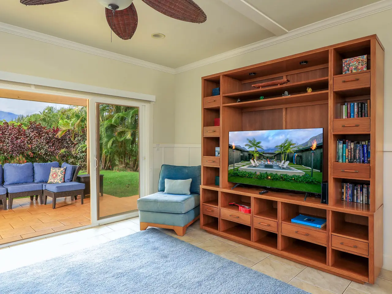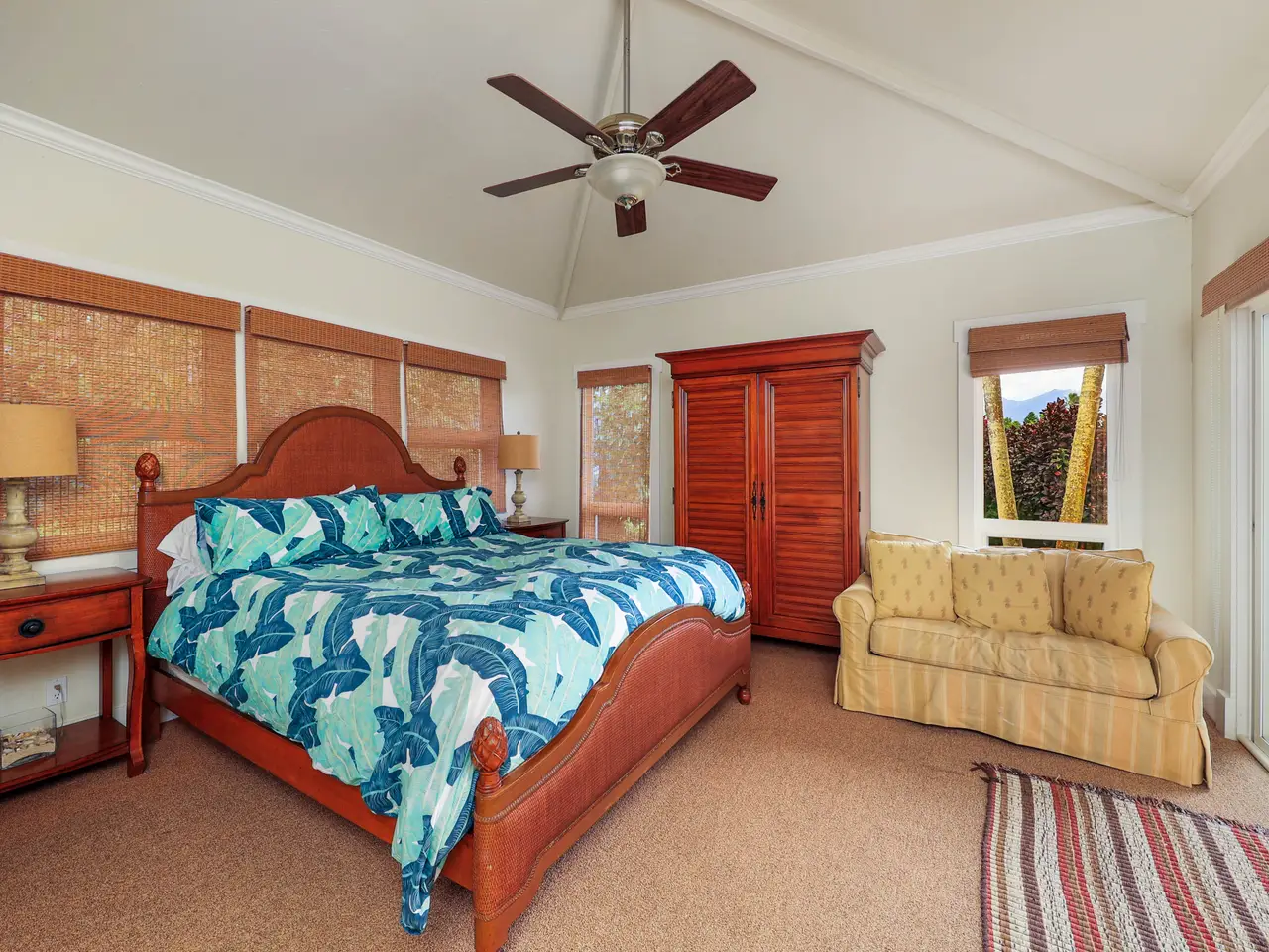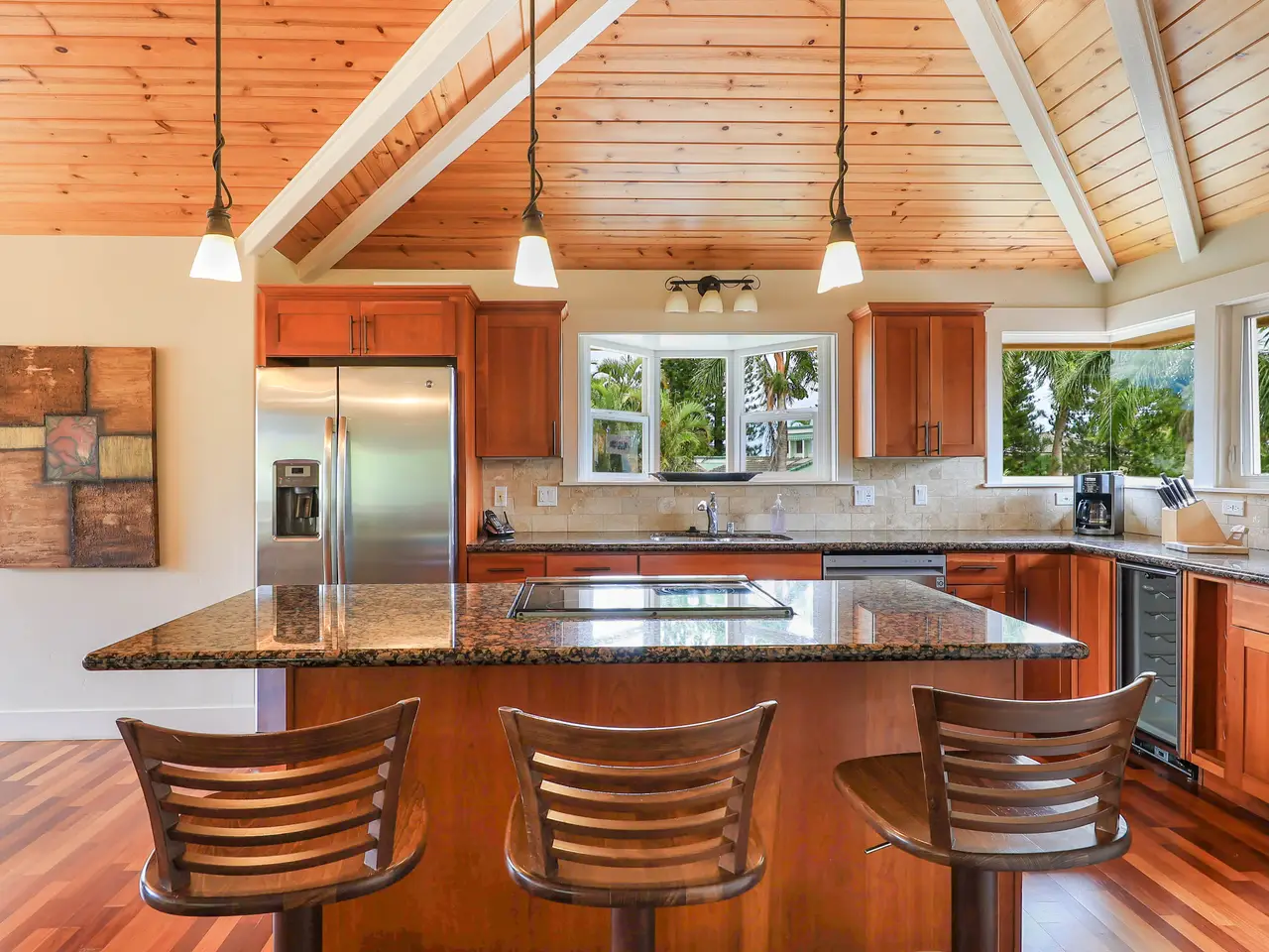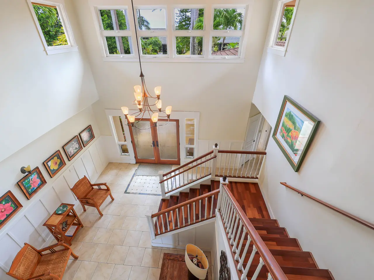 Escape to paradise in this stunning 5-bedroom, 4.5-bathroom vacation rental home, nestled in a tranquil cul-de-sac in one of Princeville’s most sought-after neighborhoods. Offering breathtaking mountain views and a lush, vibrant yard, this large home boasts a thoughtfully designed floor plan that maximizes natural light, space, and style. The home features two separate living rooms—one on each level—providing extra comfort and convenience for you and your guests. The exposed beams add a touch of elegance and charm to the spacious interiors. The gourmet-style kitchen features granite countertops, stainless steel appliances, and a large dining area perfect for gathering and hosting. Step outside to the amazing wrap-around lanai, where you can fire up the BBQ grill and soak in the stunning mountain views. Located in Princeville on Kauai's North Shore, this home is just a short drive from the luxurious 1 Hotel, world-class golf courses, and the amenities of Princeville Shopping Center. You’re also a stone’s throw from the iconic surf town of Hanalei, making this the perfect island retreat. With 5 bedrooms, a highly functional floor plan and set in its ideal location, this is a great property, with its many individual spaces and areas, for a large family to call home or to continue as a rare vacation rental home that can accommodate large groups.