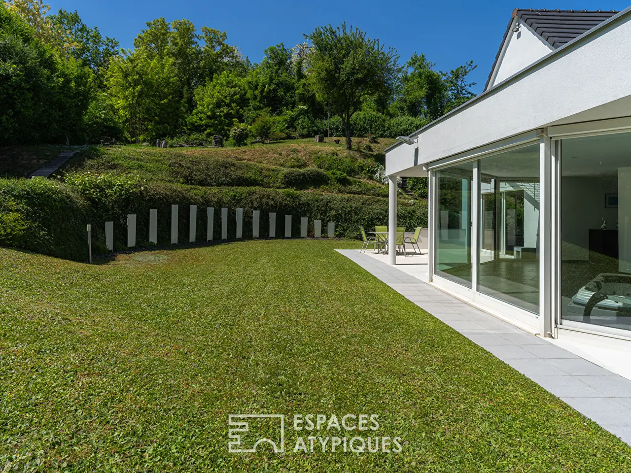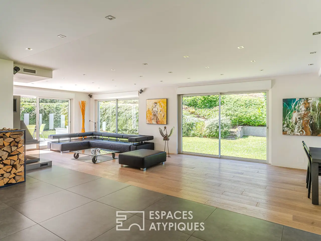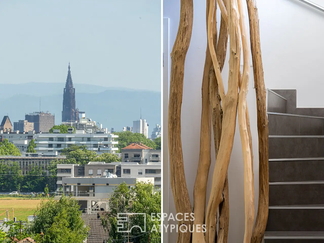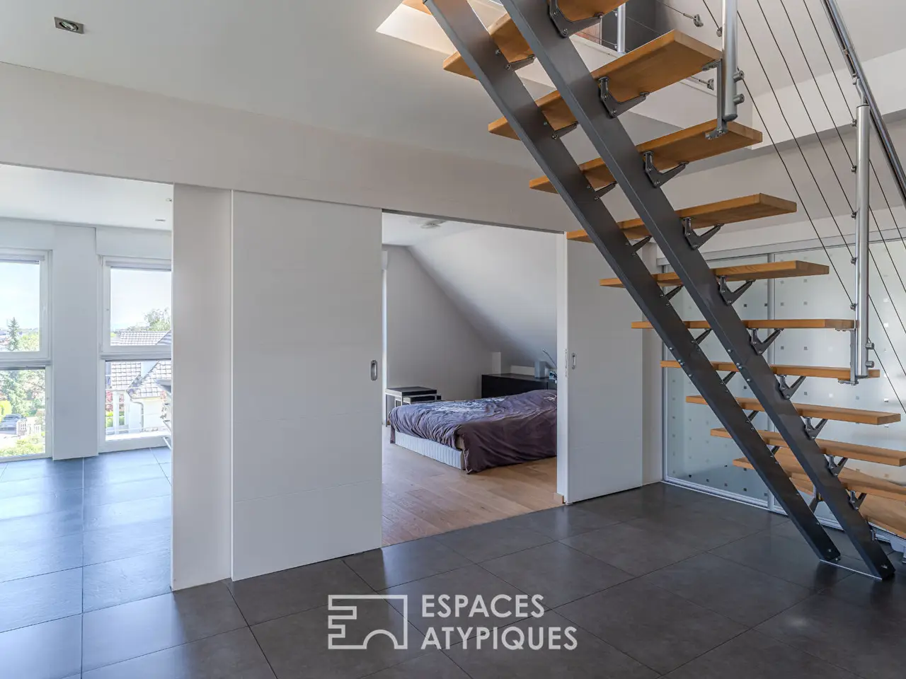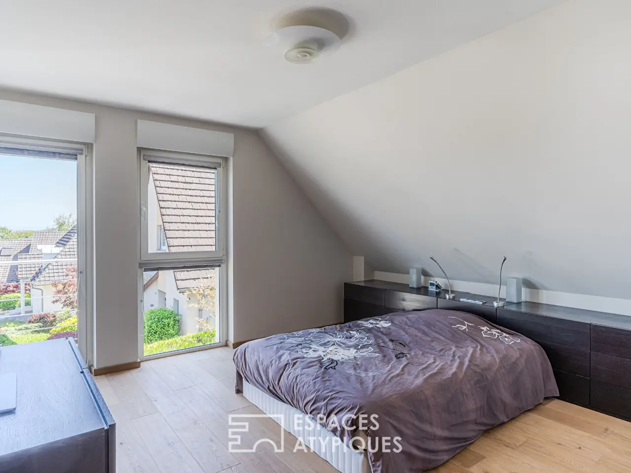 Just 15 minutes from Strasbourg, nestled in the sought-after hills of Mittelhausbergen, this contemporary house boasts a floor area of 365 sqm, including 300 sqm of living space, on a plot of 9.87 ares. Located on the edge of the forest and sheltered from view, it offers unobstructed views as far as Strasbourg Cathedral. Designed to meet an elegant and comfortable lifestyle, it stands out for its quality features, generous volumes, and omnipresent brightness.The entrance opens onto a vast living room of over 90 sqm bathed in natural light thanks to its large bay windows. This dual-aspect living room, with its solid oak parquet flooring and fireplace, is extended by a fully equipped open kitchen. Modular thanks to a movable partition, this convivial space adapts to everyday desires. A wellness area, housed in a veranda bathed in light by a skylight, houses a spa and a fitness area with direct views of the garden.Upstairs, an open hallway leads to four bedrooms, including the master bedroom and its bathroom with a view of the Cathedral, and a bedroom with an adjoining shower room and a view of the garden. The attic has been converted to accommodate an office area, a relaxation area, or even a games room. In addition, the basement, on the courtyard level, houses a large double garage, a laundry room, a wine cellar, as well as a bedroom with a shower room and a window. Outside, several terraces allow you to fully enjoy a green environment without overlooking.The carefully landscaped grounds are in harmony with the surrounding nature and are an ideal extension of the interior spaces. The elevated location gives the garden a peaceful and confidential atmosphere, while offering unique panoramas of the Black Forest and Strasbourg. This contemporary house combines modern comfort, generous volumes and high-quality services in a rare and preserved environment. Its location, its interior and exterior fittings and its openness to nature make it a unique property, designed for a clientele looking for a privileged place to live at the gates of Strasbourg.Schools 5 min walkBus 5 min walkREF. 1541Additional information* 7 rooms* 5 bedrooms* 3 bathrooms* 2 floors in the building* Outdoor space : 987 SQM* Property tax : 3 201 €Energy Performance CertificatePrimary energy consumptionc : 127 kWh/m2.yearHigh performance housing*A*B*127kWh/m2.year20*kg CO2/m2.yearC*D*E*F*GExtremely poor housing performance* Of which greenhouse gas emissionsc : 20 kg CO2/m2.yearLow CO2 emissions*A*B*20kg CO2/m2.yearC*D*E*F*GVery high CO2 emissionsEstimated average amount of annual energy expenditure for standard use, established from energy prices for the year 2021 : between 2090 € and 2870 €Agency feesThe fees include VAT and are payable by the vendorMediatorMediation Franchise-Consommateurswww.mediation-franchise.com29 Boulevard de Courcelles 75008 ParisInformation on the risks to which this property is exposed is available on the Geohazards website : www.georisques.gouv.fr