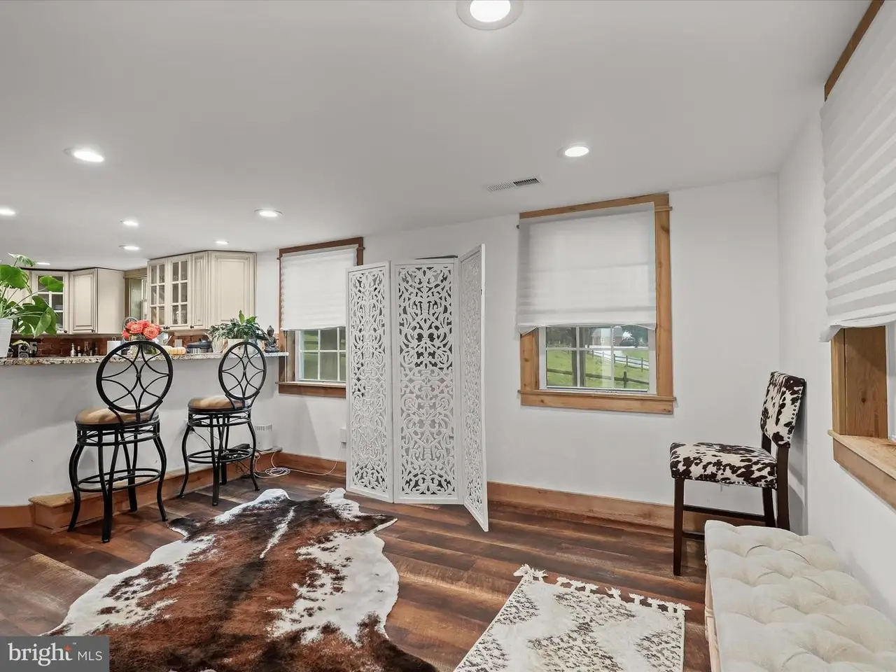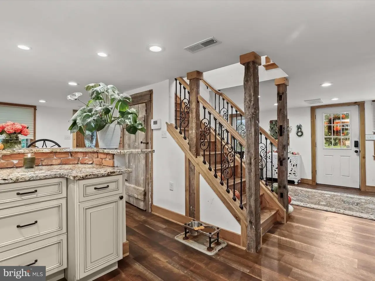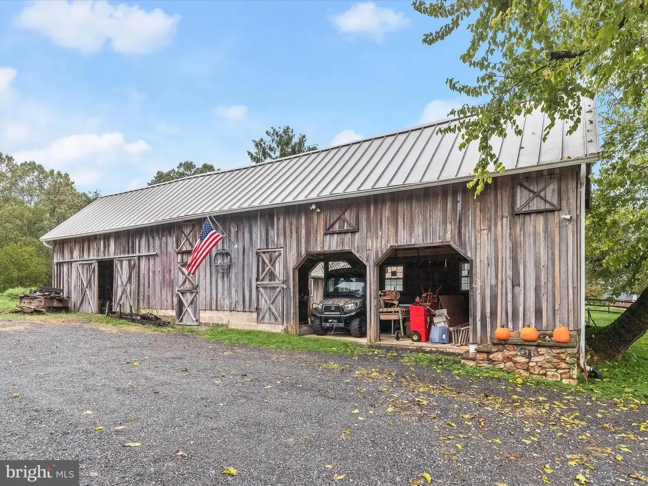 Nestled on a picturesque 10.86-acre pastoral lot, this charming farmhouse offers the perfect blend of rustic charm and modern amenities, featuring two bedrooms and a full bathroom. A welcoming covered wraparound front porch greets you, leading into a bright interior adorned with a neutral color palette, recessed lighting, and sun-filled windows complemented by luxury vinyl plank flooring. The open-concept main level showcases a relaxing living area and a dining space that boasts a brick fireplace with a wood-burning stove, perfect for cozy gatherings. The well-equipped kitchen impresses with stainless steel appliances, granite counters, a brick backsplash, soft-close cabinets, a breakfast bar, and a pantry. This level also includes a convenient laundry room, along with versatile unfinished storage and bonus rooms. Upstairs, you will find the two bedrooms and the full bathroom with a tub shower. A nook at the end of the hallway could easily function as an office or workout space with French doors that lead to the rear balcony. A utility room for additional storage completes the upper level. Outside, the expansive barn is equipped with electricity and two stalls that open into one of the fenced pastures. A separate shed provides even more storage. This retreat is ideal for those seeking tranquility and space to roam.