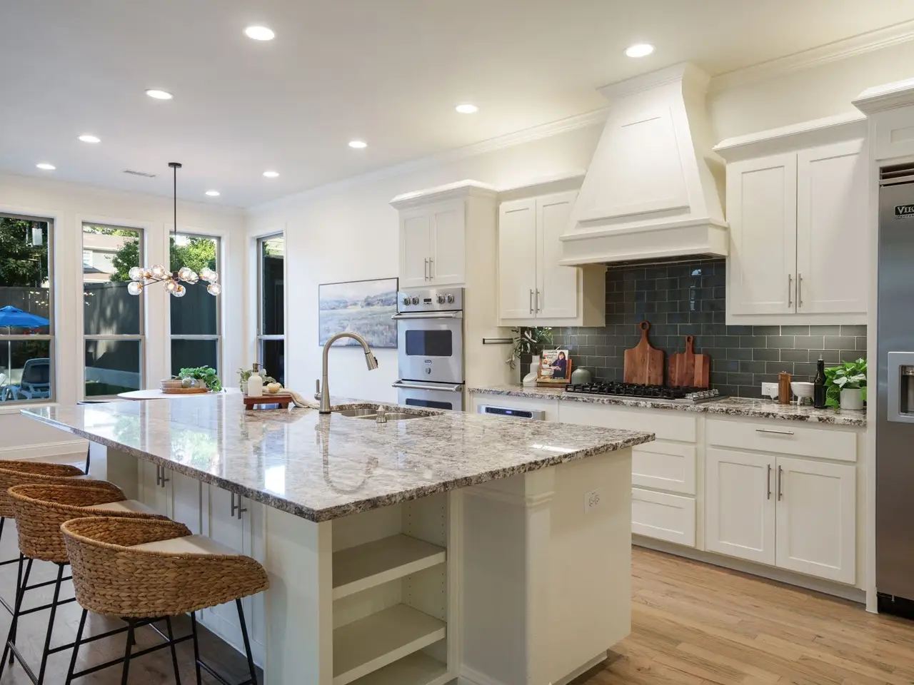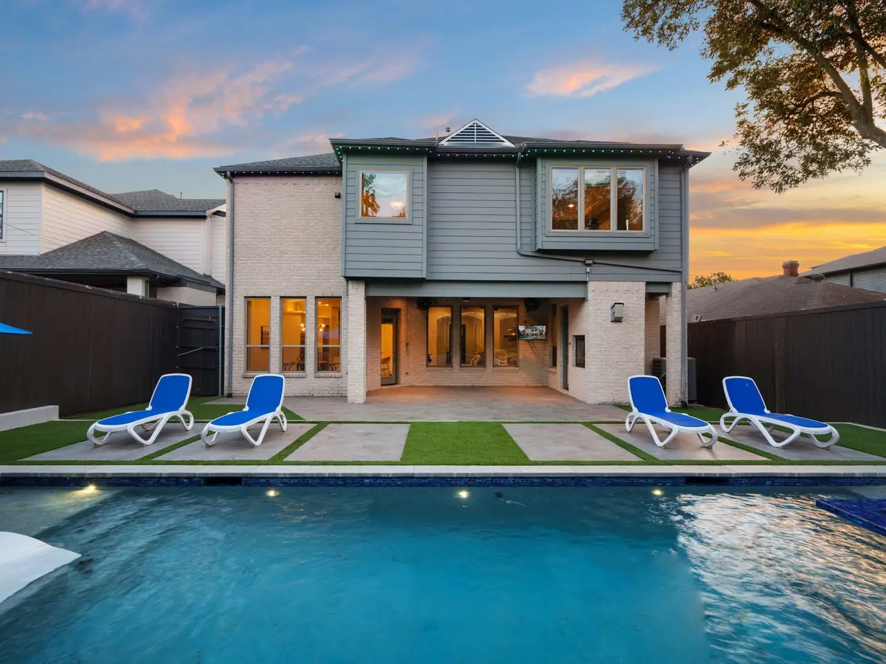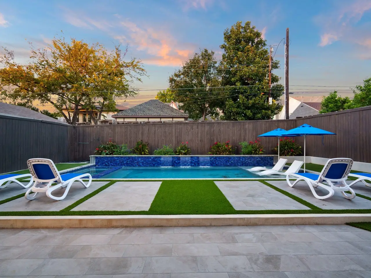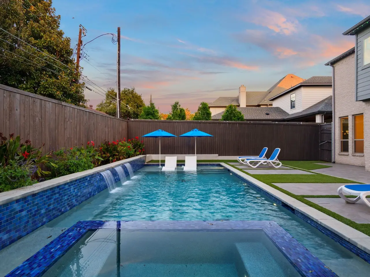 Located on a quiet street in Lakewood Heights near Tietze Park, this beautifully designed home blends timeless sophistication with modern comfort. With plenty of space and thoughtful touches, it offers a warm and inviting environment for both everyday living and weekend fun. Sunlight floods the open-concept living and dining areas, highlighted by freshly refinished light wood floors. Featuring four spacious bedrooms, an office, a media room, and multiple living spaces, there's room for everyone to relax and recharge. The spacious kitchen is outfitted with Viking commercial-grade appliances and plenty of counter space, making meal prep a breeze. Each bedroom has its own en-suite bath for added privacy and comfort. Outside, enjoy your own backyard oasis with a covered patio, a beautiful, custom-built pool with water features, and a turfed yard. Jellyfish Lighting around the outside of the house creates a versatile ambiance, whether youre celebrating holidays or the changing of the seasons. This charming home is a fantastic retreat for exploring the Lakewood area and creating new memories.