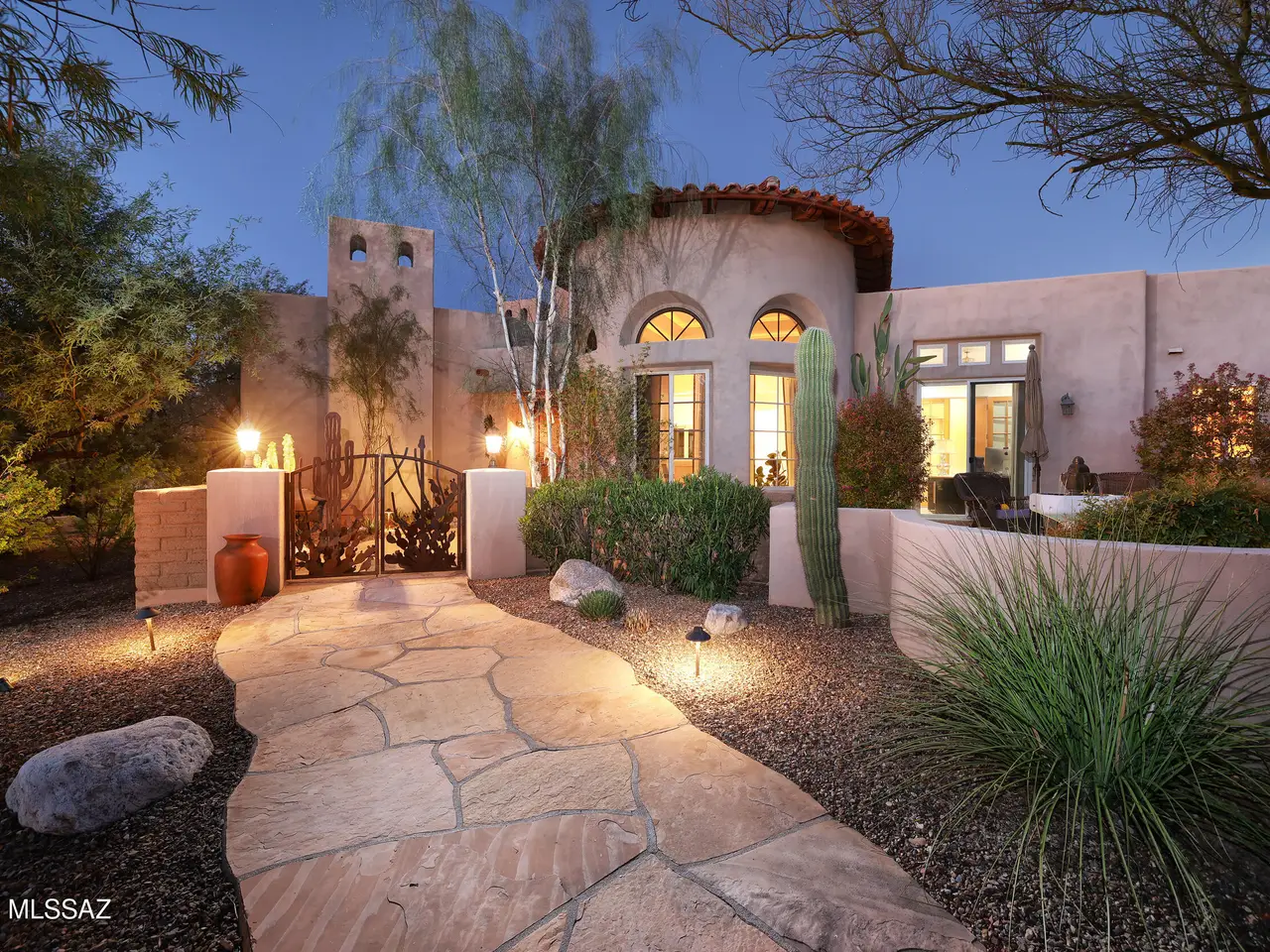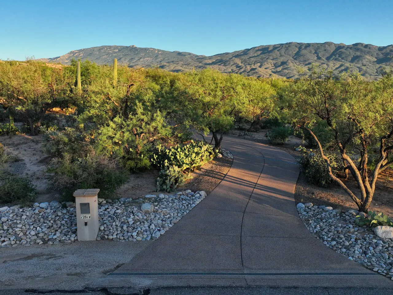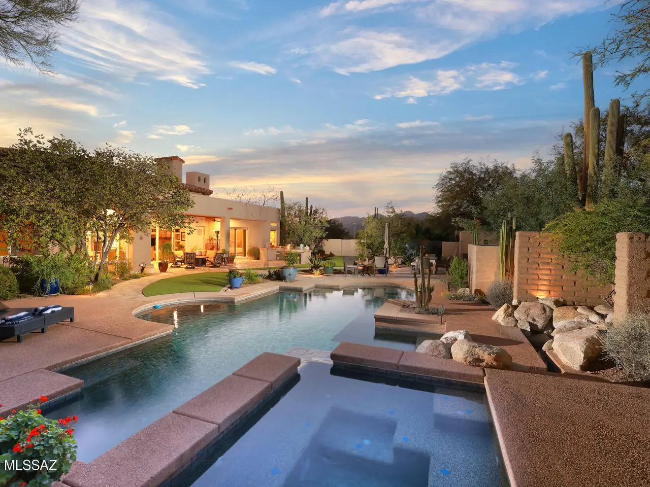 This beautifully updated home features breathtaking mountain views on 3.2 Acres with a 4 car garage & Rock waterfall and elevated heated spa that flows beautifully into the heated pool. A gated front courtyard with a soothing fountain welcomes you and sets the tone for what you're about to experience. Step through the custom mesquite entry door into a light-filled living space with walls of windows that frame the surrounding scenery. The gourmet kitchen, completely remodeled in 2023, showcases shaker-style cabinetry with lots of drawers. All Stainless steel appliances with Bosch refrigerator and top of the line WOLF gas cooktop with griddle, WOLF convection oven, WOLF steam oven - a dream for any home chef. With 4 bedrooms plus an office, plus a den/TV room and 4 full baths. there's plenty of space for everyone.The luxurious primary suite offers a private sitting area, a two-sided fireplace, spa-like bath, and a large walk-in closet. Step outside to your resort-style backyard featuring a sparkling pool with rock waterfall, heated spa, outdoor fireplace, and artificial turf for easy care. The built-in outdoor kitchen with BBQ and seating is perfect for entertaining under the stars. Additional highlights include a tankless water heater (2021), two newer HVAC systems (2019), and a high-efficiency water softener. All this just half a mile from the trailhead, where you can enjoy hiking and the beauty of nature right outside your door.