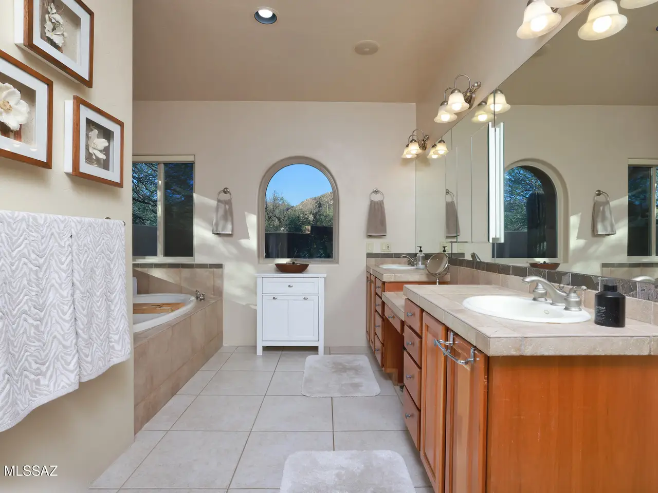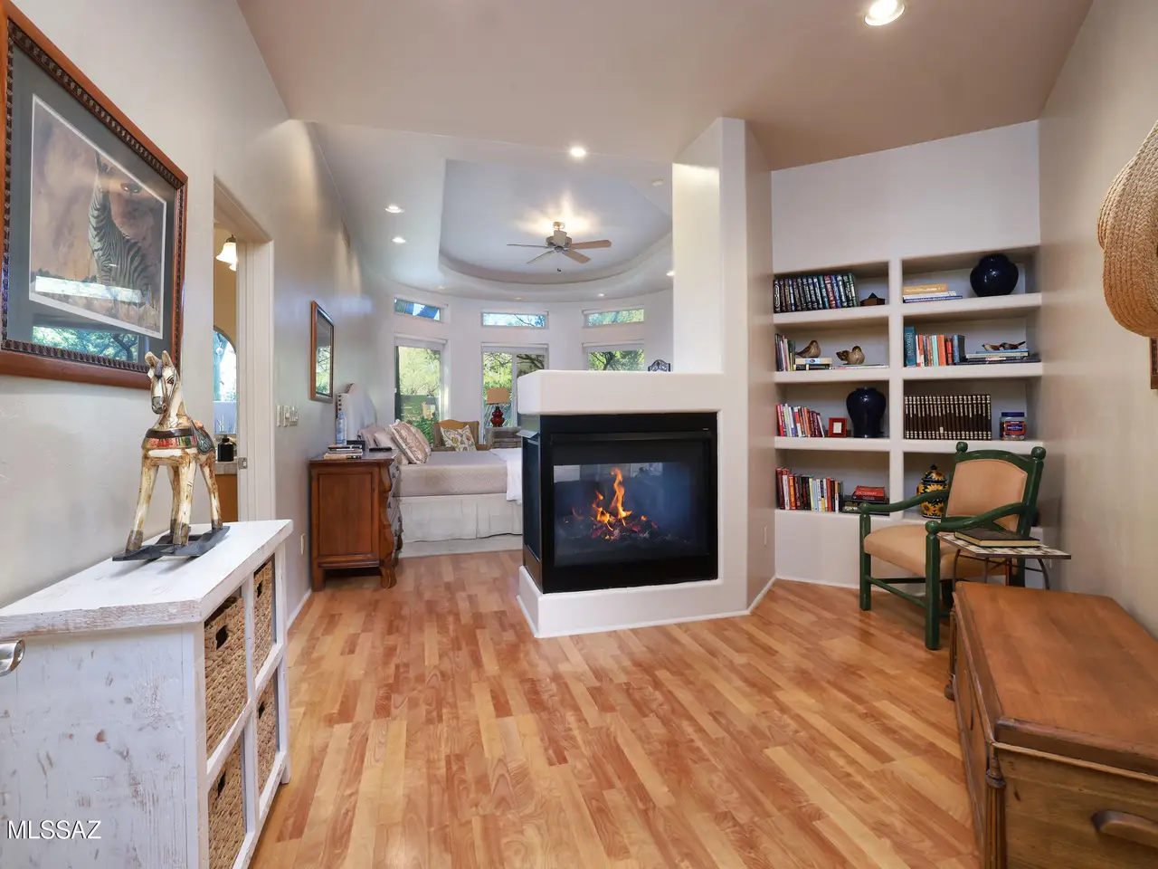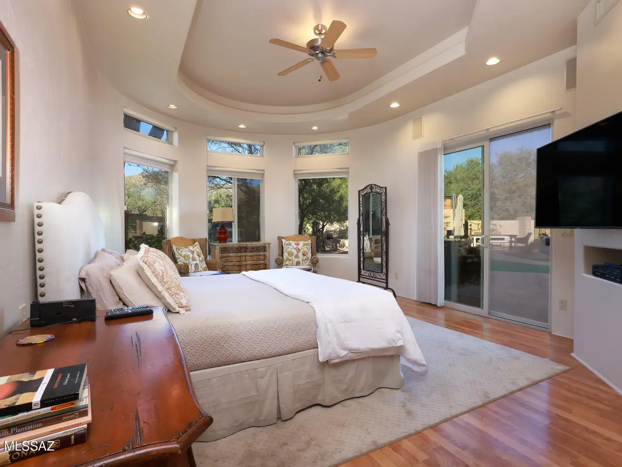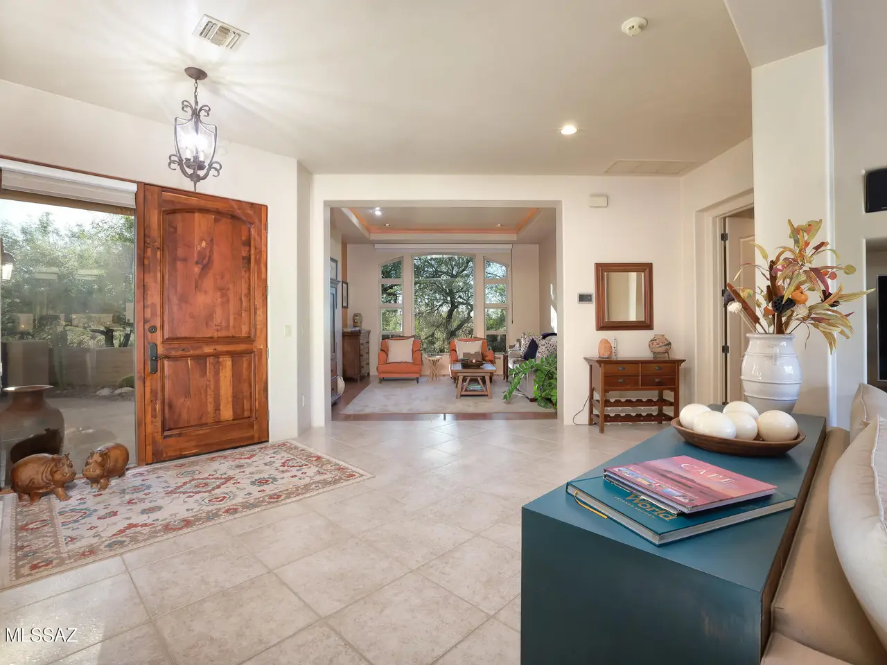 This beautifully updated home features breathtaking mountain views on 3.2 Acres with a 4 car garage & Rock waterfall and elevated heated spa that flows beautifully into the heated pool. A gated front courtyard with a soothing fountain welcomes you and sets the tone for what you're about to experience. Step through the custom mesquite entry door into a light-filled living space with walls of windows that frame the surrounding scenery. The gourmet kitchen, completely remodeled in 2023, showcases shaker-style cabinetry with lots of drawers. All Stainless steel appliances with Bosch refrigerator and top of the line WOLF gas cooktop with griddle, WOLF convection oven, WOLF steam oven - a dream for any home chef. With 4 bedrooms plus an office, plus a den/TV room and 4 full baths. there's plenty of space for everyone.The luxurious primary suite offers a private sitting area, a two-sided fireplace, spa-like bath, and a large walk-in closet. Step outside to your resort-style backyard featuring a sparkling pool with rock waterfall, heated spa, outdoor fireplace, and artificial turf for easy care. The built-in outdoor kitchen with BBQ and seating is perfect for entertaining under the stars. Additional highlights include a tankless water heater (2021), two newer HVAC systems (2019), and a high-efficiency water softener. All this just half a mile from the trailhead, where you can enjoy hiking and the beauty of nature right outside your door.