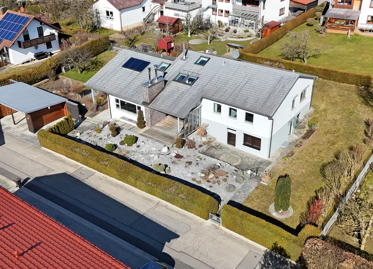 This impressive, extremely spacious detached house with separate granny apartment offers a wide range of possible uses - whether as a multi-generational home, for combining living and working or simply for spacious living with plenty of room for individual design. With a living space of approx. 368 m² on a plot of 1,408 m², nothing is left to be desired here. The house was built in 1978 in solid solid construction and was renovated and modernized to a high standard in 2013. The well thought-out architecture with up to three possible residential units creates maximum flexibility. Spacious living areas, light-flooded rooms and a converted attic ensure a pleasant living atmosphere with modern comfort. The tasteful combination of high-quality materials, the modern furnishings and the stylish design of the outdoor areas are particularly noteworthy. The lovingly landscaped rock garden gives the property an exclusive touch. Several terrace areas invite you to linger, while the modern carport with adjoining garden area offers ample parking space. This house combines luxurious living with well thought-out functionality and offers a rare opportunity for anyone looking for a spacious, comfortable home with versatile usage options. Come and view this property and be inspired by its many highlights.