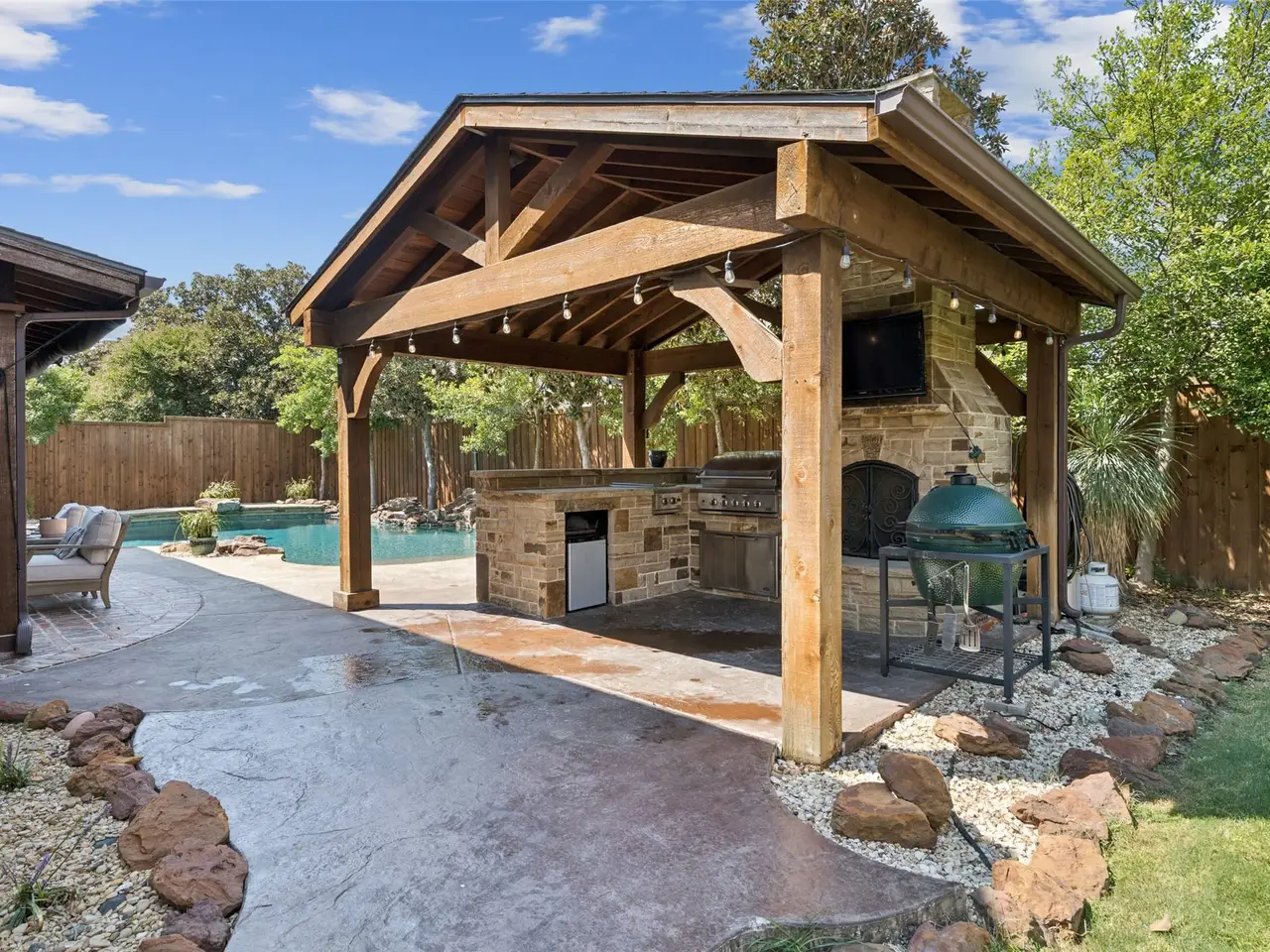 Introducing an updated luxury residence in highly sought-after Villages of Stonelake Estates, designed for todays lifestyle with the flexibility for multi-generational living. Featuring 6 bedrooms, 4 full baths, two living areas, a private office, and a media room, this home offers both sophistication and versatility. Inside, you’re greeted by solid hardwood floors and a thoughtfully reimagined interior. The chef's kitchen showcases a statement island, modern cabinetry, and premium finishes - perfect for gathering and entertaining. All bathrooms have been stylishly renewed with finishes aligned to today’s most desired standards, including the spa-worthy primary suite with soaring vaulted ceilings, a freestanding tub, and a custom-fitted closet. The home’s seamless floorplan balances openness with defined spaces, creating the ideal setting for family living or hosting. Upstairs, flexible bedrooms and the media room offer privacy and recreation, while the dedicated office ensures productivity at home. Step outdoors to your private retreat: a resort-inspired pool, covered patio, and fully equipped outdoor kitchen make entertaining effortless. A three-car garage - with a two-car bay plus separate single stall - adds function and convenience. Positioned within top-rated Frisco ISD and moments from shopping, dining, and major thoroughfares, this home pairs luxury finishes with an unbeatable location.