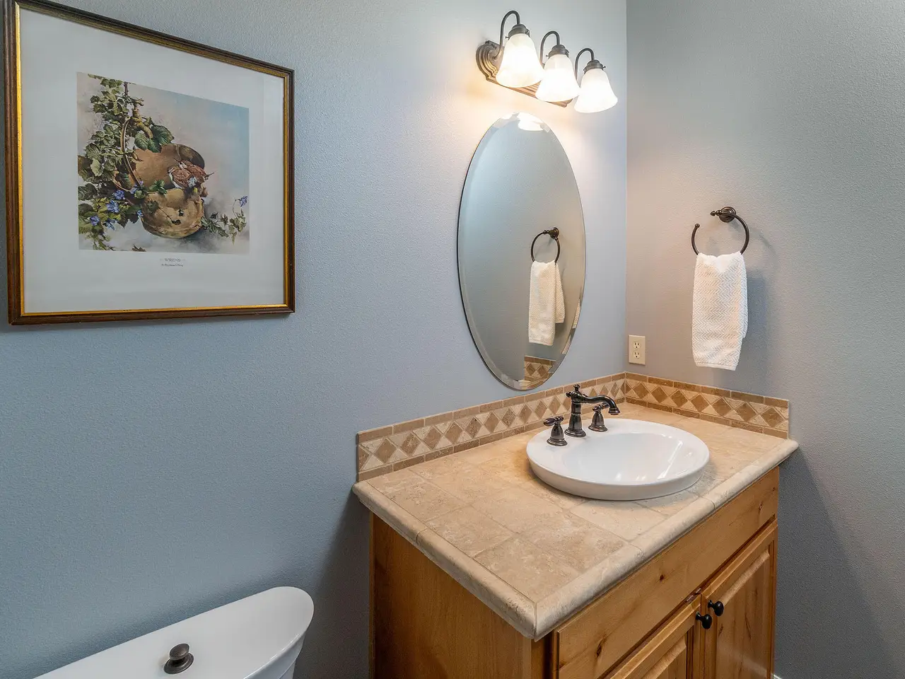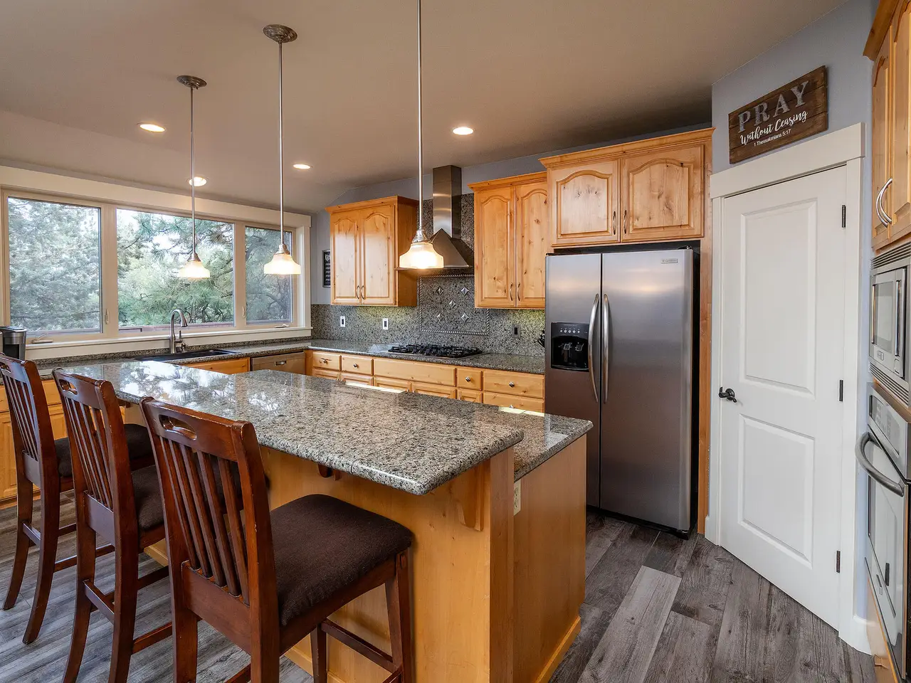 Beautiful 4-bedroom, 3-bath home in Bend's sought-after Awbrey Butte community. The great room features a 14-foot chiseled marble fireplace as the focal point. The kitchen offers granite countertops, an 8-foot island, stainless appliances, and a walk-in pantry. The main-level primary suite includes a dual vanity and soaking tub. A second bedroom or office is also on the main level. Upstairs are two additional bedrooms for family or guests. The finished basement is wired for surround sound, has extra storage rooms, and opens to a patio with a water feature and a fire pit. A 700 sq. ft. deck is perfect for entertaining and is reinforced and wired for a hot tub. A flat driveway leads to an oversized two-car garage which includes ample storage, a two-year-old furnace, and a 30-amp RV plug just outside the garage door. Enjoy luxury living and beautiful surroundings in Awbrey Butte.