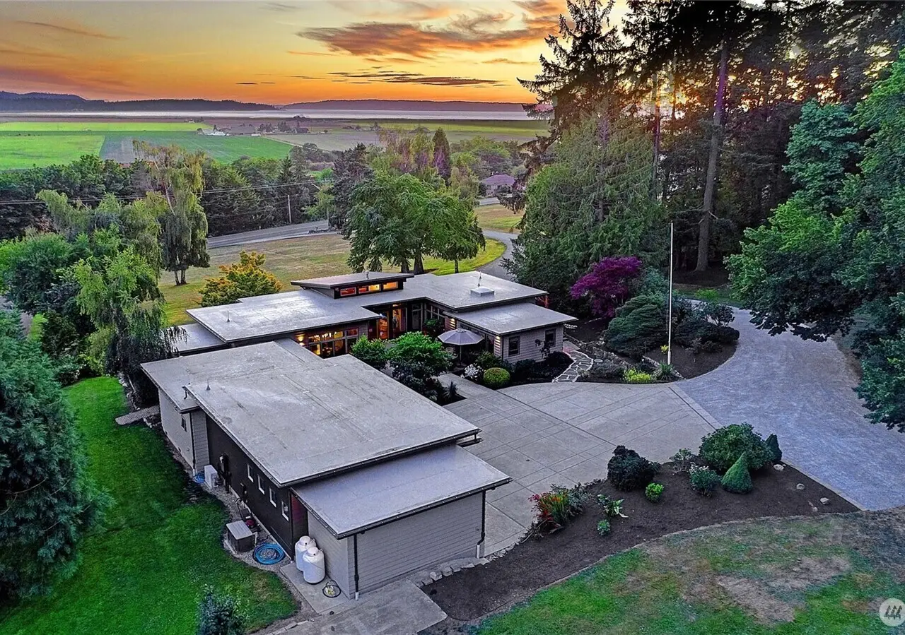Exquisite Mid-Century style home on 6.4 beautiful acres with evergreens and trails throughout. Views of the Olympics, Sound, City, Sunsets, and Valley. Six parcels within the city limits. Drive up to your finished four-car garage and walk through a gorgeous courtyard into your own piece of paradise. Beautiful open kitchen with large island. Stainless high-end appliances. Adjoining is your dining area with lots of built-ins. TV room, with adjoining office. Huge deck the width of the house. Large living room with steel fireplace. Secondary bedroom, 3/4 bath, machine room and guest closet are steps away. Spacious primary suite with updated bath and walk-in closet. Detached studio guest room with beautiful granite counters and 3/4 bath. Green Built!