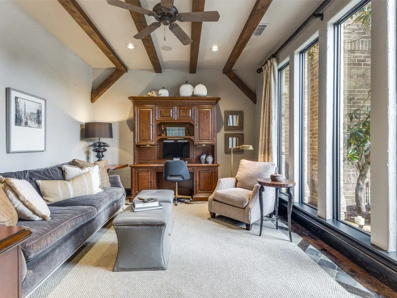 Discover European influences throughout this exquisite residence, blending timeless architectural elegance with modern luxury, all within the gated Hills of Breckinridge community. Designed for refined living and effortless entertaining, it showcases exceptional craftsmanship, custom finishes, & a beautifully landscaped backyard oasis. A grand foyer welcomes you with graceful arched doorways and intricate moulding, leading into a formal living area highlighted by a cast-stone fireplace & soaring 23-foot cathedral ceiling.The private study exudes warmth and sophistication with rich wood beams & hand-scraped hardwood floors. The recently remodeled kitchen is a true showpiecefeaturing custom-built cabinetry, stunning natural quartzite countertops and backsplash, and premium appliances including a built-in refrigerator, dual ovens, and gas cooktop. The adjoining family room offers a second stone fireplace and seamless access to the outdoor living area, perfect for entertaining or relaxing poolside. Upstairs, all bedrooms are thoughtfully positioned for privacy, including an oversized Primary Suite with its own sitting area and fireplace.The spa-inspired bath features a freestanding soaking tub, frameless glass shower, dual vanities, and designer lighting. Each secondary bedroom offers a refined ensuite bath with quartz countertops and modern finishes.Additional highlights include dual staircases, plantation shutters, custom draperies in designer fabrics, an upstairs utility room, and an oversized three-car garage with epoxy flooring. Outdoors, the private backyard is designed for both recreation and relaxation, complete with defined play areas, a sparkling pool, pergola, and expanded stone patio.The gated driveway enhances security and privacy.Recent updates include all windows, pool equipment, a tankless water heater, and enhanced exterior lighting & landscaping. Property is situated along the CollinDallas County line, offering a choice of Plano ISD or Garland ISD.