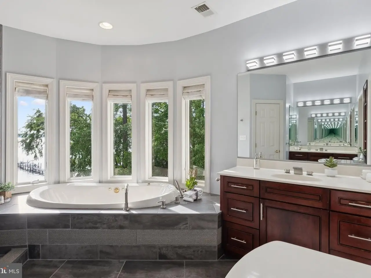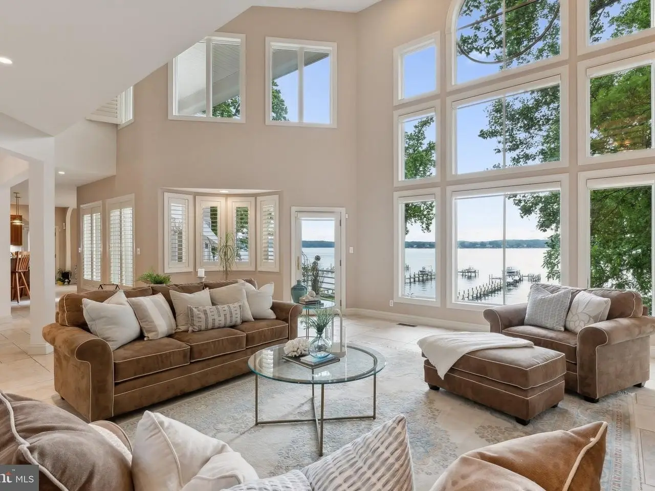 ""Sunset on the Severn"" - A gated, custom contemporary estate perched on 72 waterfront feet with a private pier, boat & jet ski lifts. A dramatic two-story great room with floating catwalk and wall of glass serves as the heart of this entertainer's dream. Just 15 minutes from downtown Annapolis, this Severna Park residence offers refined seclusion with seamless access to the heart of the Chesapeake. Designed to open upward and outward-toward light, toward water-every inch of this home invites you to embrace the surrounding beauty and live in rhythm with it. The main level blends form and function, anchored by a spacious eat-in kitchen and breakfast bar that flow effortlessly into both formal and informal living areas. A tucked-away family room with custom built-ins creates a cozy retreat, while art niches and clean architectural lines lend a sense of curated calm. Upstairs, the expansive primary suite features a private balcony with tranquil views, a custom walk-in closet, and a spa-like bath with dual vanities, a jetted tub, and a walk-in shower. A rear staircase leads to two additional bedrooms, a full bathroom, and a dedicated upstairs laundry. The walkout lower level is built for entertaining, featuring a stunning antique Victorian bar and a generous recreation room with an additional bedroom and a full bath. Just outside, a stone patio and manicured gardens offer a peaceful escape where birdsong and river breezes create a sense of timeless calm. Additional highlights include an oversized three-car garage with extensive storage, solar panels for year-round efficiency, a stone-paver motor court, a lily pad pond, and a garden path that gently winds to the private waterfront. Here, you don't just live by the water-you live in rhythm with it. Affectionately named Sunset on the Severn for its breathtaking evening views, you will absolutely love being home.