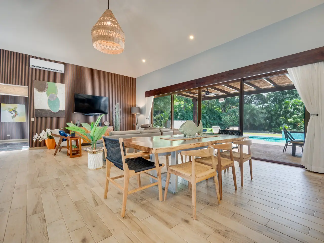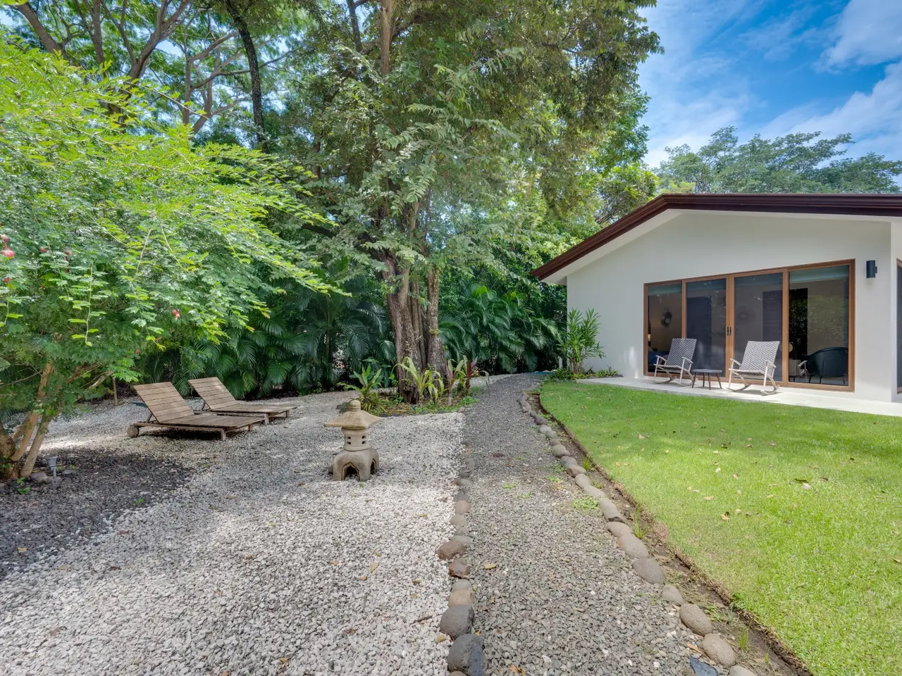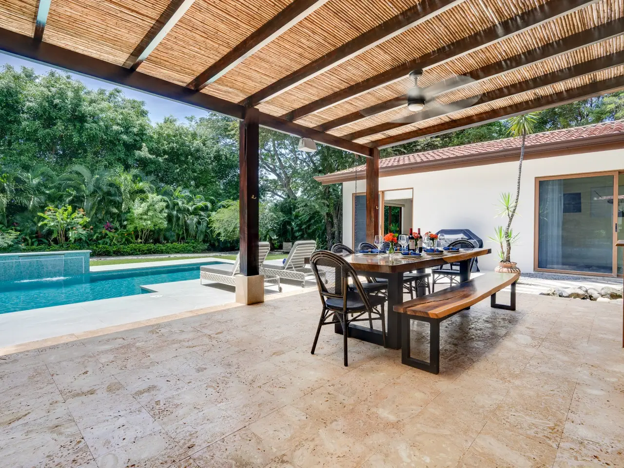 Casa Pachote – Luxury Living in Hacienda PinillaWelcome to Casa Pachote, an exquisite 4-bedroom, 4.5-bath luxury home in the prestigious Reserva de Golf community of Hacienda Pinilla. Recently refreshed with an $80,000 remodel, this residence blends contemporary sophistication with the inviting warmth of tropical living.Step inside and you’ll immediately feel the home’s open, airy ambiance. The living room radiates a welcoming, homey charm, framed by large patio doors that seamlessly connect indoor and outdoor spaces. Whether you’re relaxing with family or entertaining guests, the flow between the indoor living and outdoor dining areas creates an effortless sense of comfort and connection to nature.At the heart of the home is a chef’s kitchen, featuring elegant built-in appliances, a waterfall porcelain island, and matching counters and backsplash. A convenient pass-through window opens to the covered patio - perfect for serving meals al fresco or enjoying morning coffee by the pool.Designed in a distinctive “H” shape, the home’s layout balances privacy and harmony. Each wing hosts a master suite and guest bedroom, connected by a softly lit glass walkway that glows beautifully at night. This architectural touch highlights the home’s modern aesthetic.Every bedroom offers its own en-suite bathroom, ensuring privacy and comfort for family and guests alike. The two grand master suites are true sanctuaries: each with indoor sitting areas, King beds, and patio doors opening directly to the sparkling pool terrace. One master bedroom features an indoor and outdoor shower for a serene, spa-like experience.Step outside to your private tropical oasis. The expansive 11’ x 33’ pool with a tranquil waterfall and color-changing Pentair Glo lights becomes the centerpiece of the backyard as it is surrounded by lush landscaping, mature palms, and vibrant greenery that ensure total privacy. Thoughtfully placed landscape lighting creates a magical atmosphere after sunset, making the evenings just as beautiful as the days.The property is as practical as it is beautiful. Enjoy the convenience of an AstroTurf front lawn, in-ground sprinkler and drip irrigation systems, a whole-house water filtration and softening system, six-zone AC, and automatic blinds. The new outdoor deck space, new décor, and select furnishings complete the remodel, enhancing the home’s refined style.Additional highlights include:Spacious two-car garage with ample storageNew outdoor furniture and pool loungersExtensive exterior lighting on all sidesGolf cart charging outletFive TVs includedFully furnished and move-in ready, with all kitchenware includedFreshly painted exteriorAccess to all the amenities of Hacienda Pinilla including: golf, tennis, world-class surfing, beach club, miles of biking and hiking trails, restaurants, gym, etc Casa Pachote, Reserva de Golf 75 isn’t just a home—it’s a lifestyle. Offering a rare combination of luxury, comfort, and tranquility, it’s perfect as a full-time residence or high-end vacation retreat.? Experience the beauty of Hacienda Pinilla living, where every detail invites you to slow down, breathe, and feel at home.Contact us today to schedule your private showing.