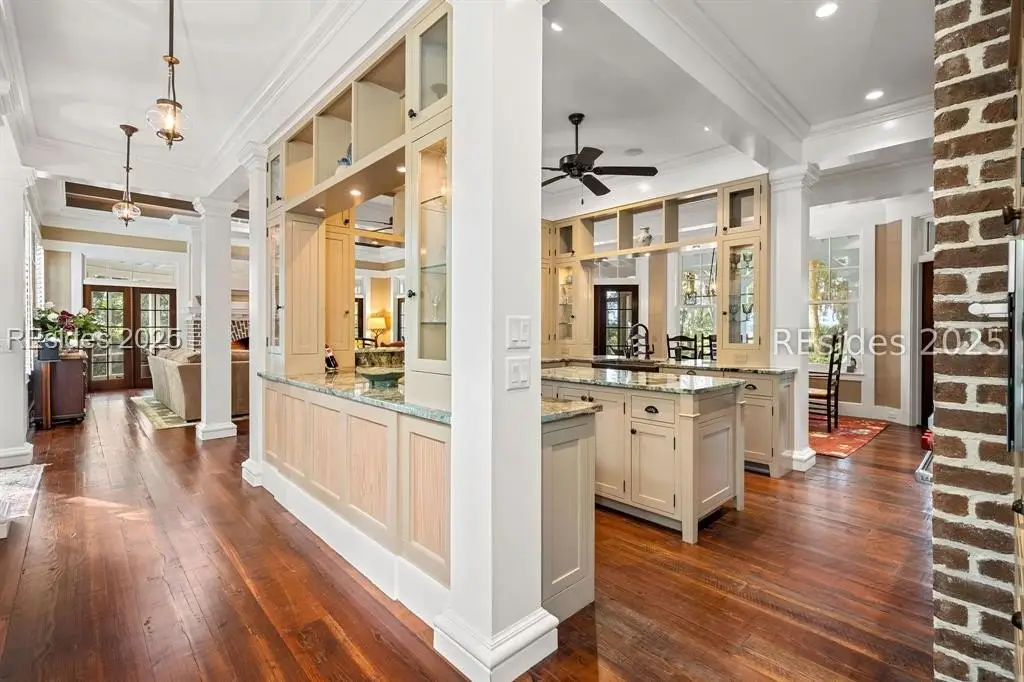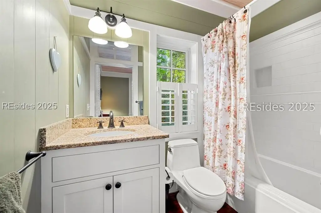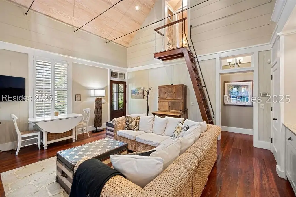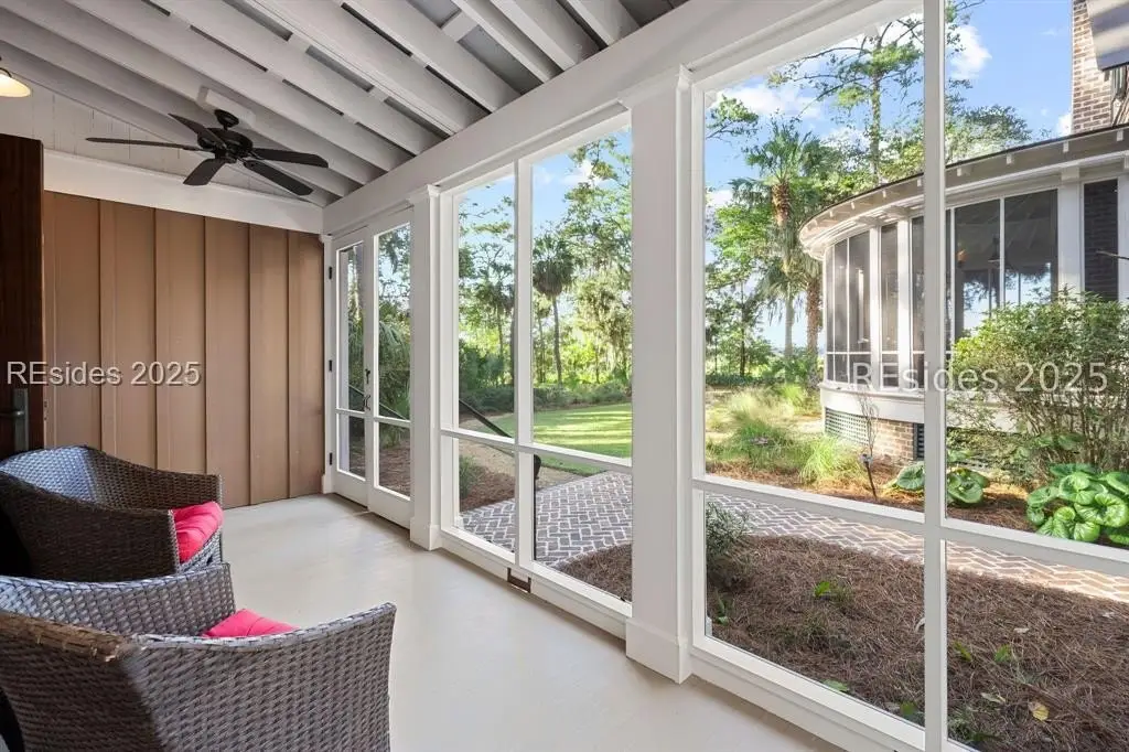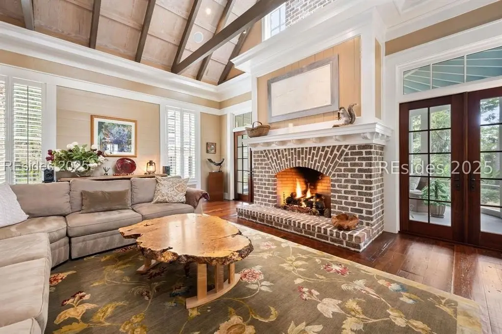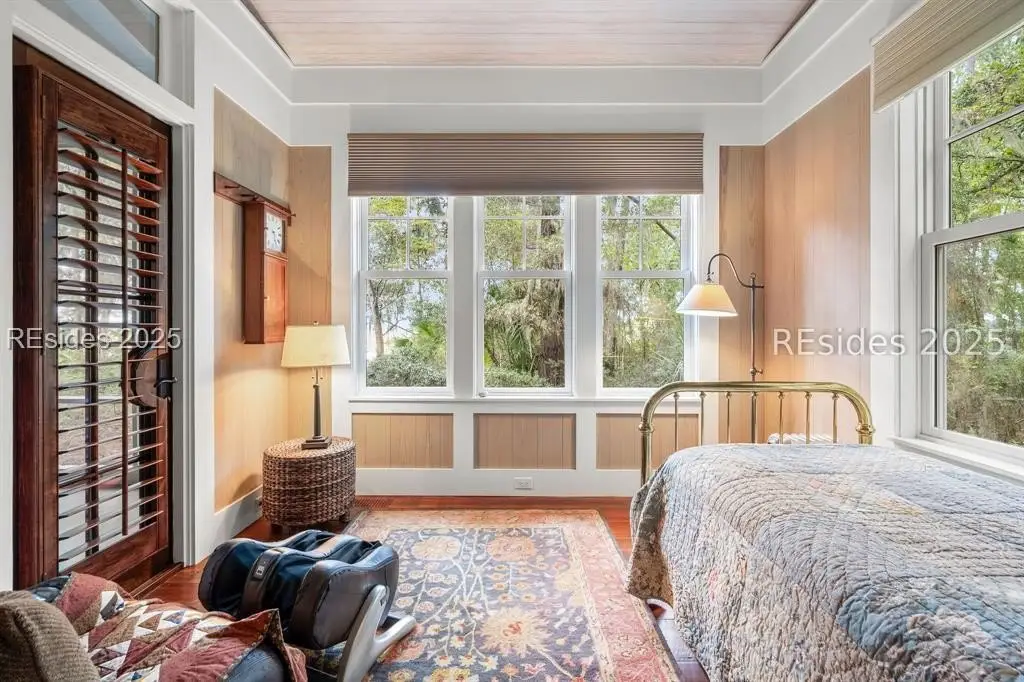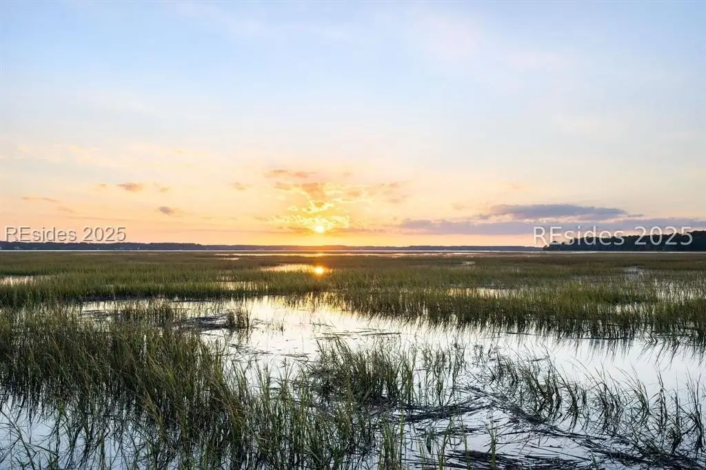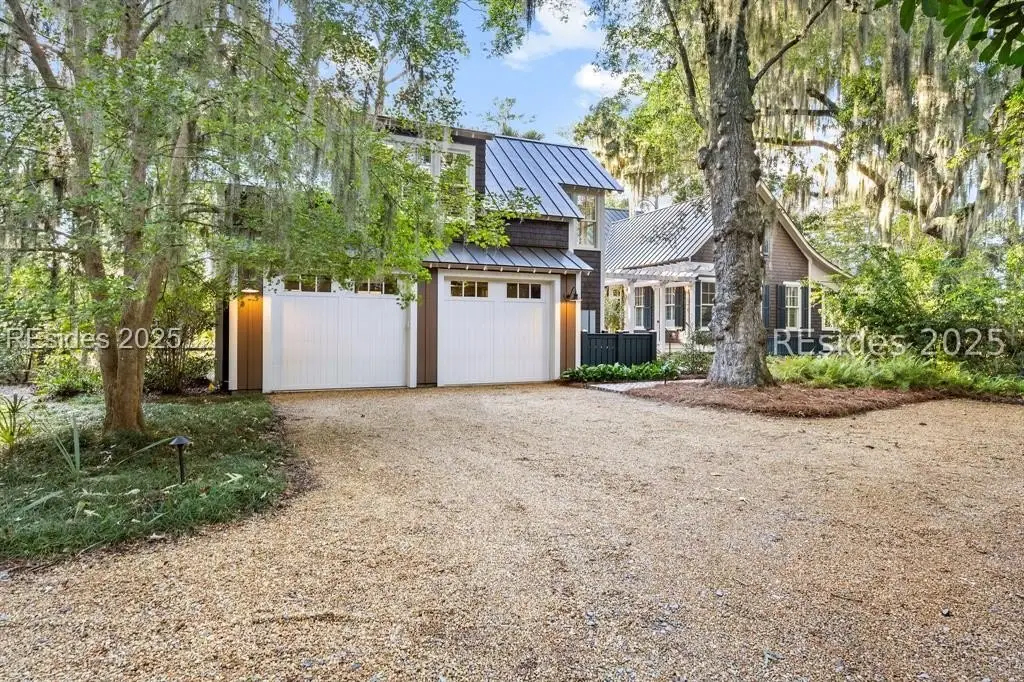 Exquisite sunsets over Callawassie Creek and the Colleton River provide a breathtaking backdrop for this rare Nantucket-style family compound on coveted Spring Island. Sited on 3.5+ acres, this 5,223 sq. ft., 5BR/5.5BA waterfront estate includes a private tidal dock with direct access to Callawassie Creek, the Colleton River, and the Atlantic Ocean. By boat, enjoy easy day trips to Hilton Head, Savannah, or Beaufort, or simply relax at home while fishing, crabbing, shrimping, or watching dolphins and Roseate Spoonbills from your backyard sanctuary. The 3,249 sq. ft. main residence (2BR/2.5BA) was designed for year-round living, showcasing an open floor plan, chef's kitchen, and porches that span the length of the home. The east wing features an apsidal screened porch with Savannah brick fireplace, ideal for Lowcountry outdoor living. The entire second floor is dedicated to a private owner's retreat, complete with sitting room and fireplace, screened porch, spa-like bath with freestanding tub and oversized shower, a large custom walk-in closet, and abundant finished storage. A 995 sq. ft. guest house (2BR/2BA) offers its own living room with fireplace, kitchenette with full-size appliances, washer/dryer, children's loft with built-in bunks, and screened porch overlooking the river. The detached two-car garage with golf cart bay includes a 482 sq. ft. carriage house, perfect for additional guest quarters, studio, or office along with a professional-grade darkroom. A freestanding 764 sq. ft. workshop provides a creative haven, currently outfitted as a professional woodworking studio with exceptional equipment (available separately), but equally suited as an artist's studio. Life on Spring Island is unlike anywhere else, with 3,000 acres of preserved natural beauty and premier amenities: an Arnold Palmer-designed golf course, equestrian center, tennis and pickleball, state-of-the-art fitness complex with heated and chilled saltwater pools, miles of scenic trails, a 7.5-acre farm, and an inspiring art barn. Blending timeless design, craftsmanship, and an extraordinary setting, this rare compound offers the ultimate in Lowcountry luxury, an unparalleled opportunity for multi-generational living on Spring Island.