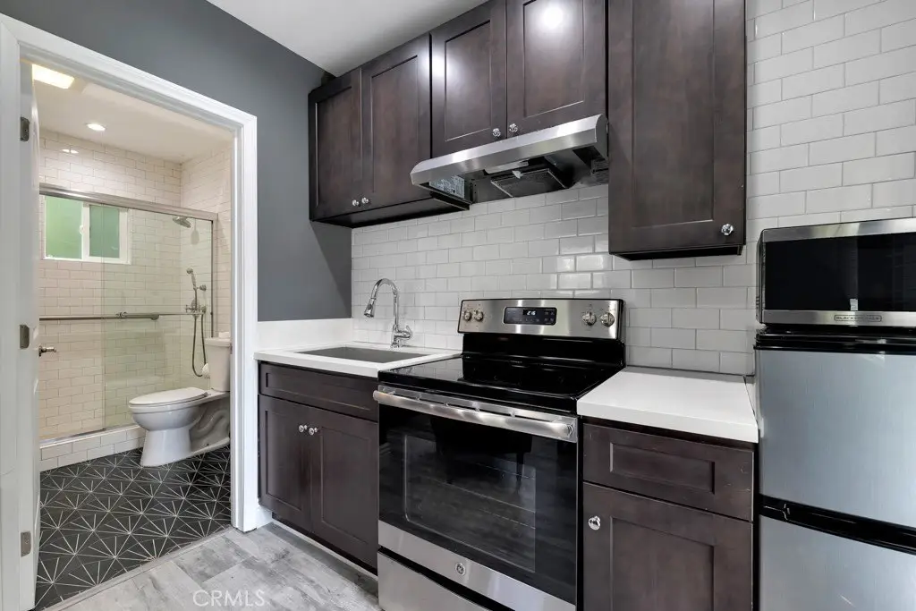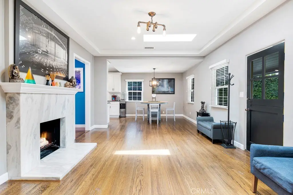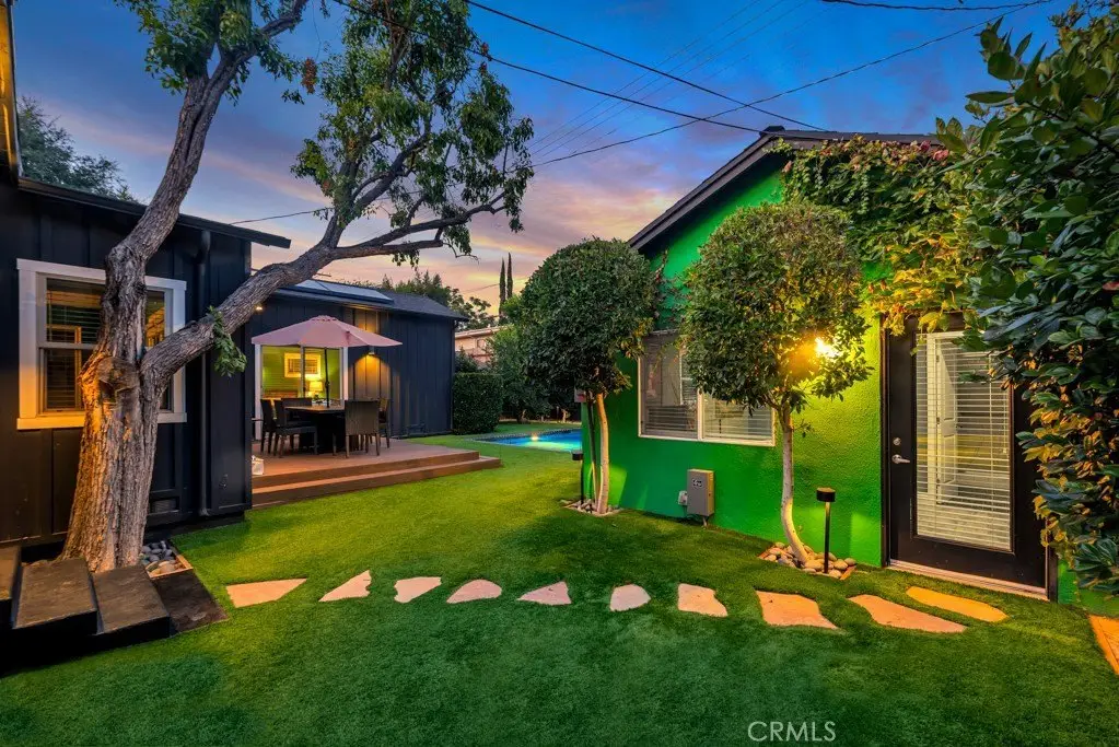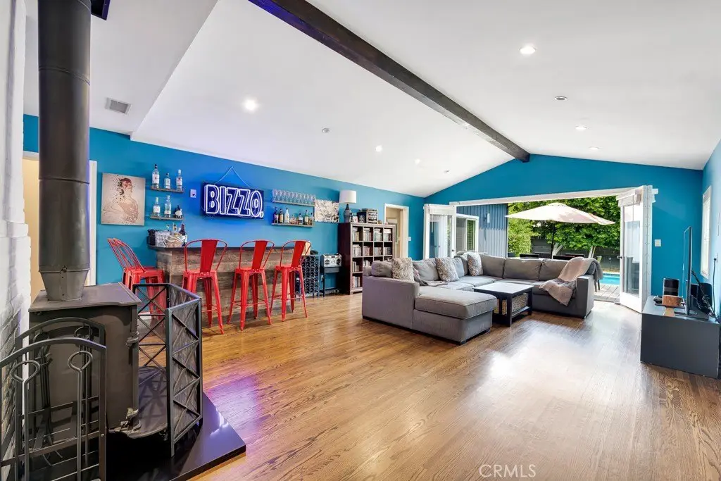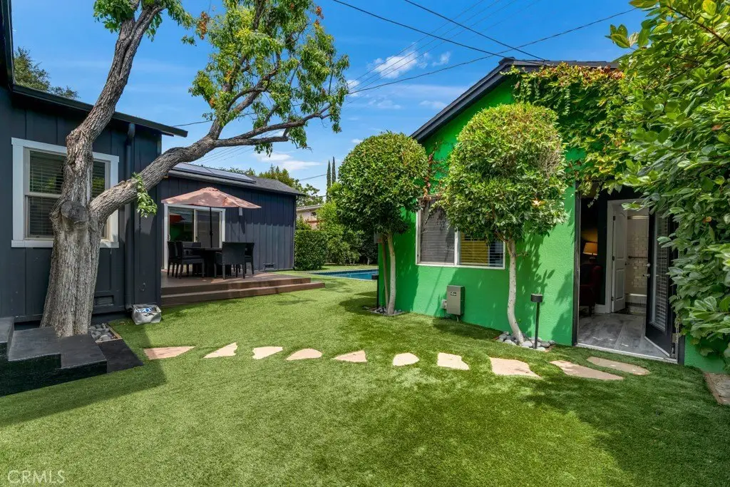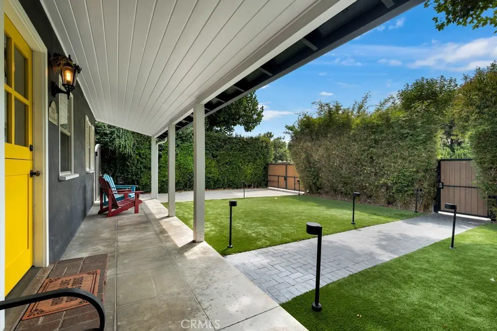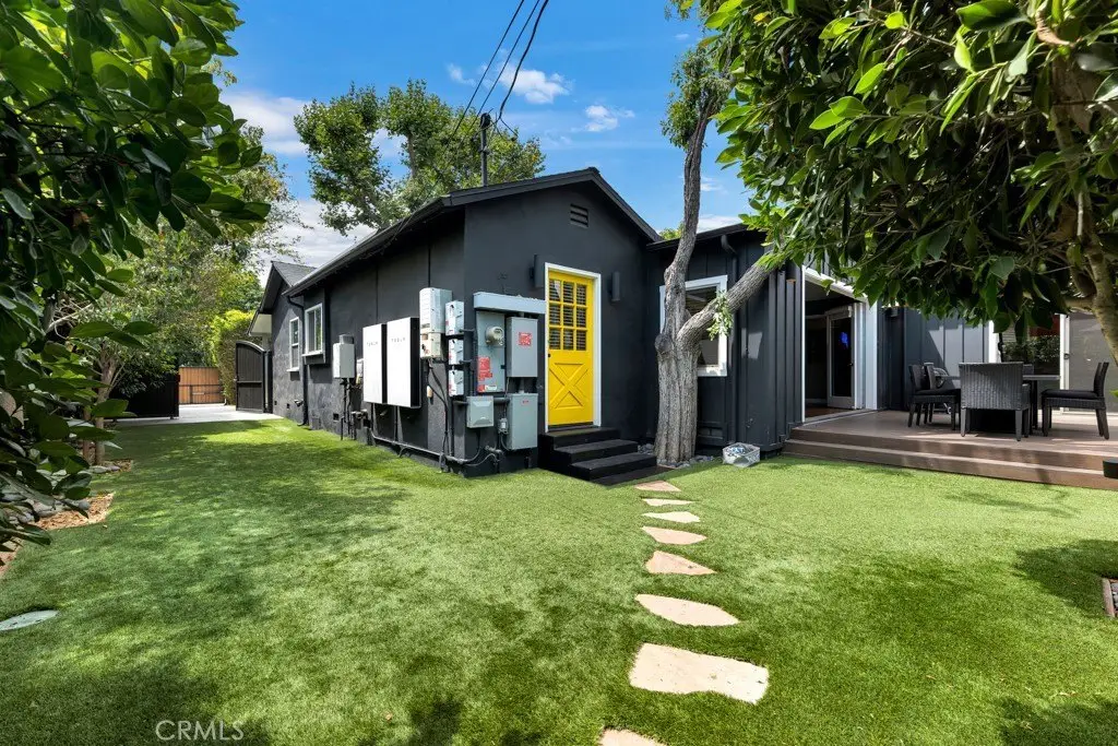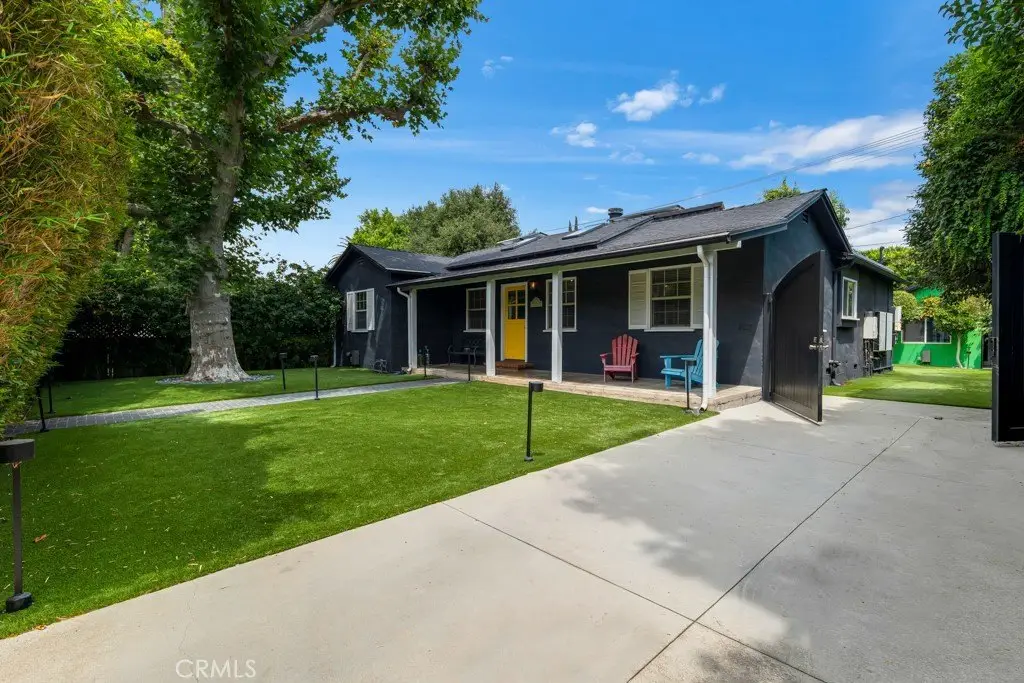 This stunningly renovated and expanded three bedroom, two bathroom home is a true masterpiece! With its soaring vaulted ceilings and open, airy layout, this residence showcases top-notch finishes and exceptional indoor/outdoor living. A charming Dutch door welcomes you into the cozy formal living room, featuring a sophisticated stone fireplace as its centerpiece. The seamless flow of the open-concept design leads you effortlessly into the dining area, which is beautifully highlighted by a striking architectural light fixture. The contemporary kitchen is a chef's dream, complete with custom cabinetry, quartz countertops, a Wolf range, and high-end stainless steel appliances. The newly designed master suite is a luxurious retreat, featuring a spacious walk-through closet and an ensuite bathroom adorned with premium finishes such as Waterworks tile, bespoke cabinetry, and elegant European fixtures. The airy great room is accentuated by large modern bi-fold doors that open up completely to reveal a brand-new deck and an exquisitely landscaped backyard. The outdoor space boasts a heated saltwater pool and a Studio ADU equipped with its own full kitchen. Additionally, the property is outfitted with fully paid-off Tesla solar panels and two Tesla batteries, enhancing its energy efficiency. This incredible opportunity is not to be missed!