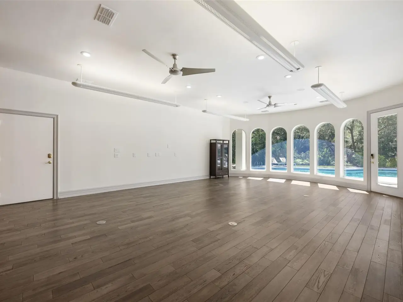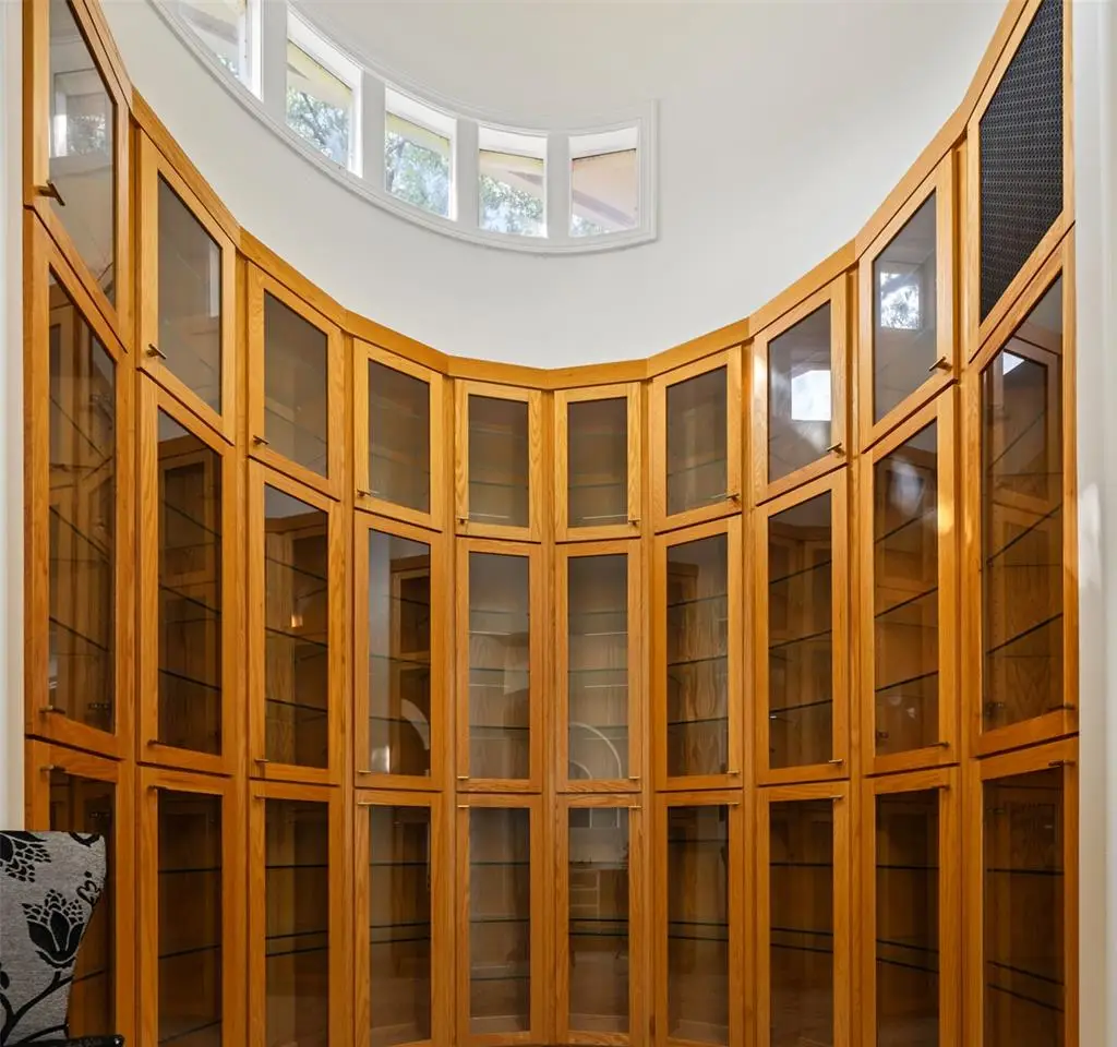 Expansive media room with floor-to-ceiling bookshelves Pre-wired sound system