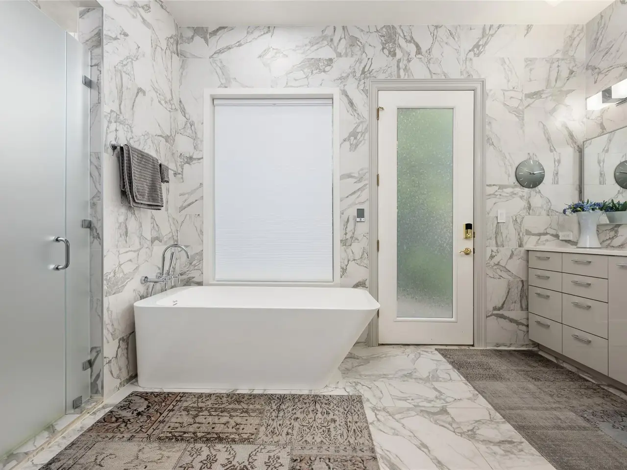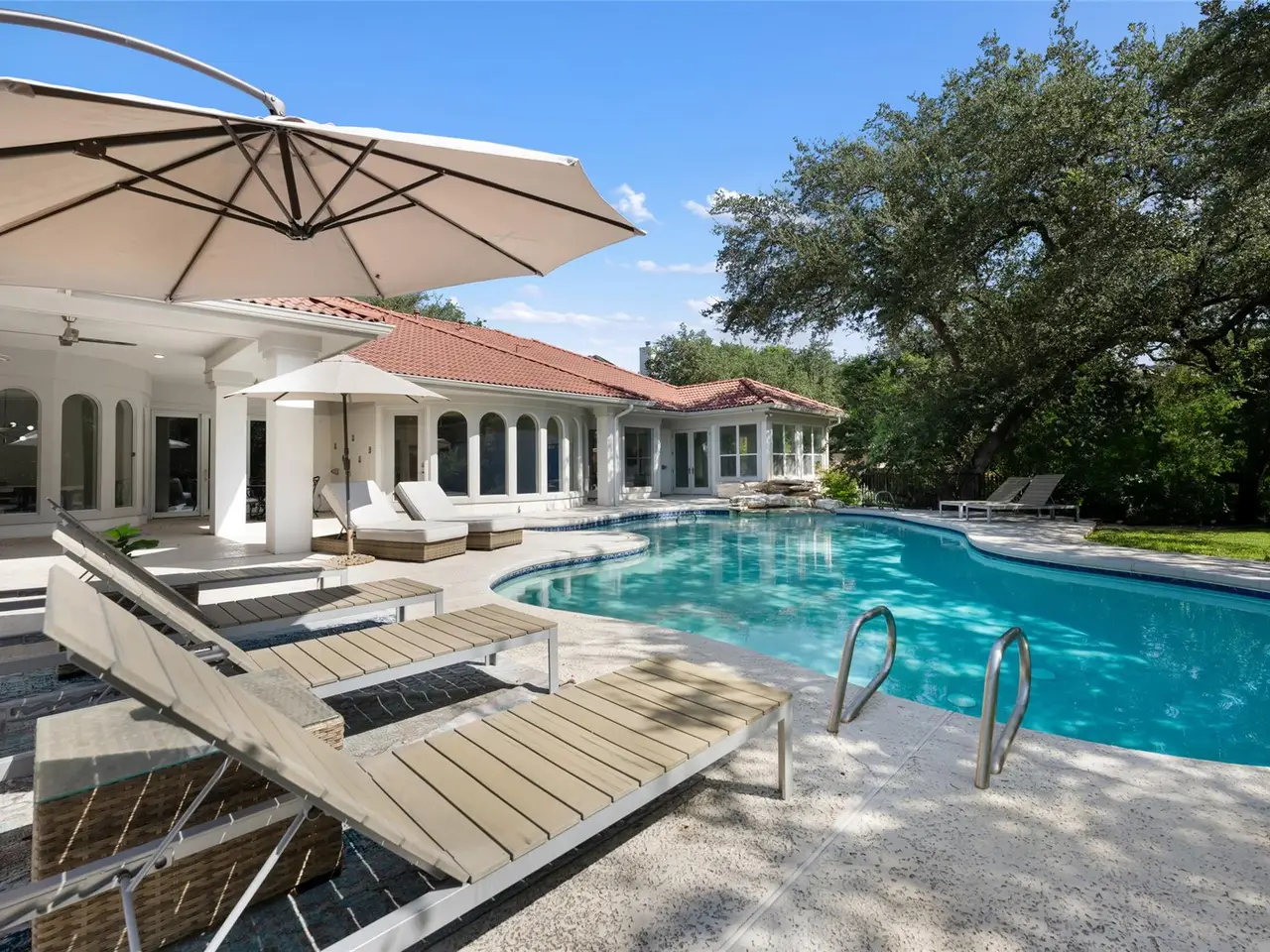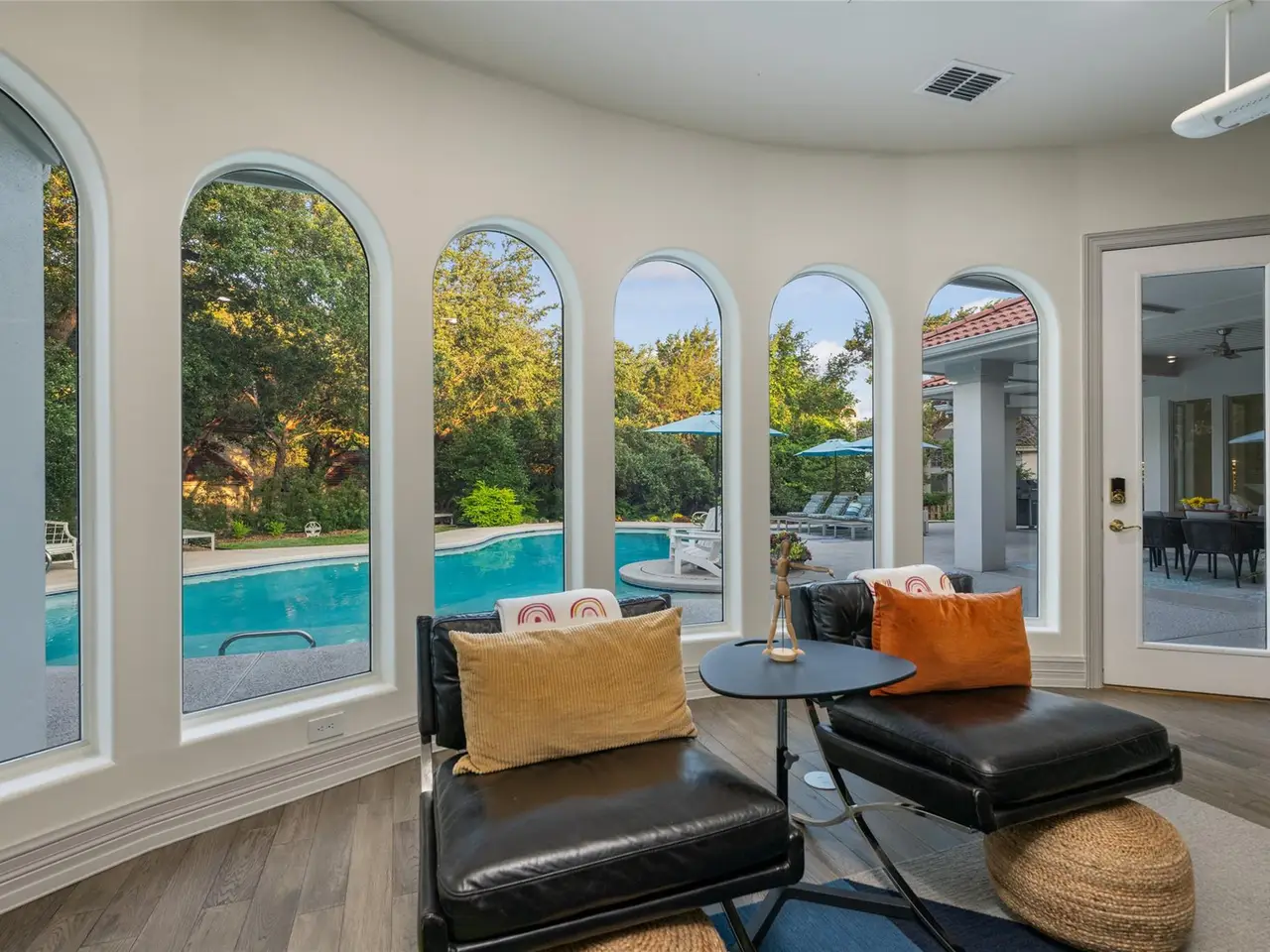 Spanish-style architecture meets contemporary luxury at this 4-bedroom, 3.5-bathroom home nestled in a quiet cul-de-sac. The beautifully curated interiors impress the moment you enter the residence, with gorgeous tile floors and a double-height rotunda. The resort-style pool is the home's focal point, with ample windows that invite picturesque views of the backyard inside. Enjoy the open-concept floor plan across multiple living and dining areas, including a living room with a fireplace, formal dining, a rounded breakfast nook, and a family room. The kitchen is outfitted with high-end stainless steel appliances by Viking, bar seating, a coffee bar, and a center island. The expansive media room boasts floor-to-ceiling bookshelves for your personal library, as well as stunning arched windows that provide the space with abundant natural light. Escape to luxury in the primary suite with backyard access and a spa-inspired bathroom with a soaking tub, heated floors, a walk-in shower, dual vanities, a walk-in closet, and a highly desirable indoor therapy pool. Guests will enjoy spacious bedrooms and upgraded bathrooms, including a second primary en-suite with a soaking tub, walk-in shower, and heated floors. In the backyard, tranquility and relaxation abound, with a resort-style pool and waterfall. Dine al fresco on the covered patio with a view of the landscaped backyard. The home has a pre-wired sound system, allowing you to easily connect your devices. A 3-car garage with a workshop and an EV charging station provides additional storage. The home is part of The Courtyard community, which offers access to a private park on Bull Creek featuring trails, playgrounds, and a dock for canoeing, kayaking, and other recreational activities, as well as access to Lake Austin. This home has perfected single-story living in a coveted Austin neighborhood. Tax and assessed values are estimates for illustration purposes only. All figures should be independently verified.