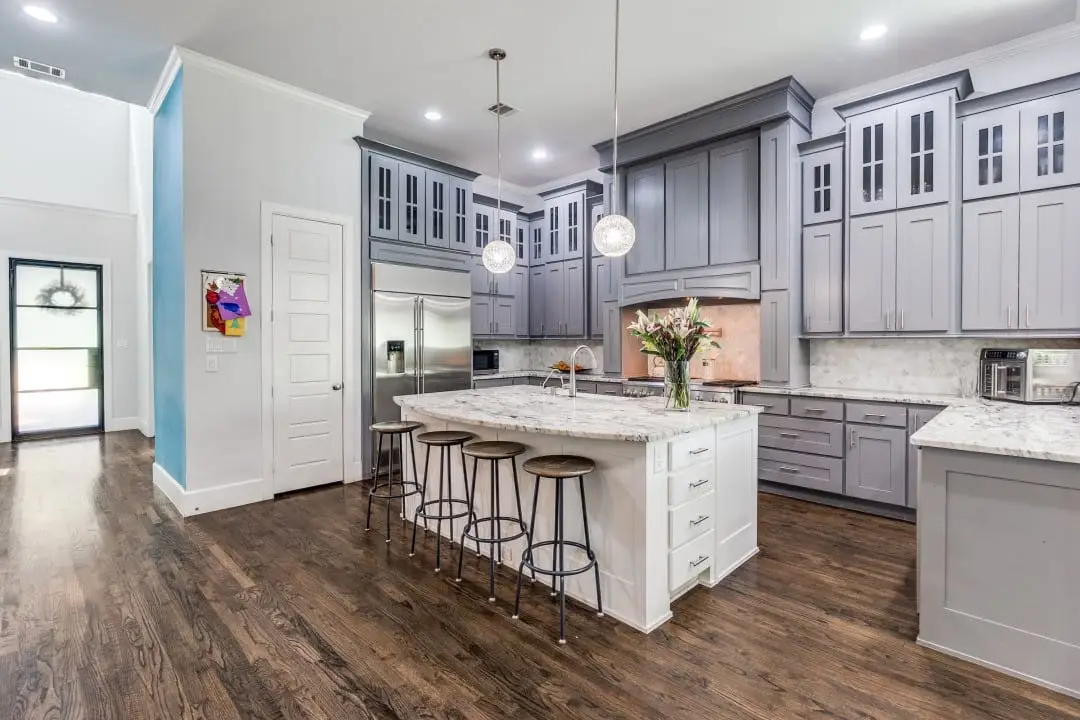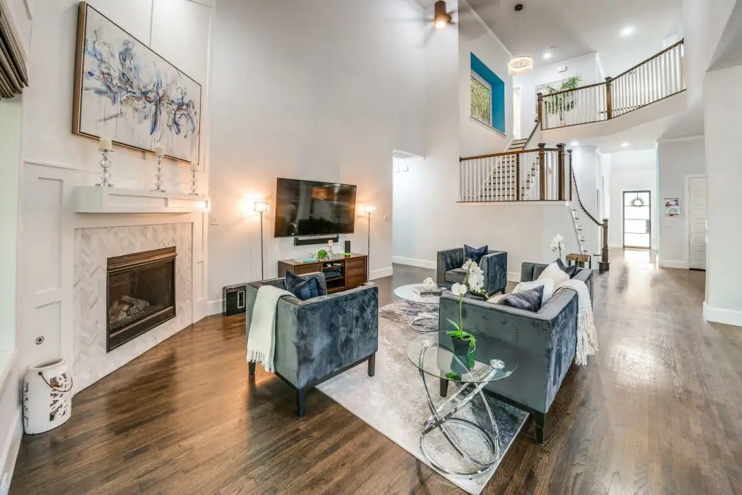 Nestled in a quiet cul de sac, this family home in the heart of Lakewood exhibits a style reminiscent of Hill Country architecture. The stone faade and a covered porch create welcoming curb appeal. A glass-paneled front door leads to the interior, past a study with glass paneled doors and down the hall to a spacious and open kitchen and living and dining areas. Completed in 2016, this home feels fresh and well-cared for, with rich hardwoods extending seamlessly throughout the kitchen, living and dining areas. An expansive marble-topped island and breakfast bar lend a sense of presence and definition to the kitchen area, along with a multitude of seating options. GE Monogram appliances, High ceilings throughout the kitchen, living and dining areas lend an open and airy feel to the entire first floor. An outdoor patio French doors lead to a cozy patio which offers a serene patio,entertaining area featuring a gas fireplace and seating areas for a true outdoor retreat.A downstairs master bedroom featuring a cathedral ceiling leads to a crisp and clean lined, master bathroom, finished in shades of white flanked by gorgeous fixtures which add an air of sophistication to the space. One and a half additional bathrooms, and one more bedroom downstairs make this home well suited for guests. Upstairs, three additional bedrooms and a playroom offer additional functionality, as well as space for fun and games. The backyard is turfed and features a sprinkler system, a board on board privacy fence. This lovely home is perfect for indoor outdoor entertainment and many gatherings.