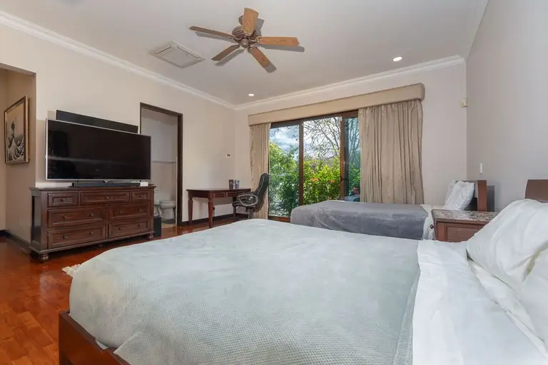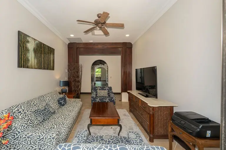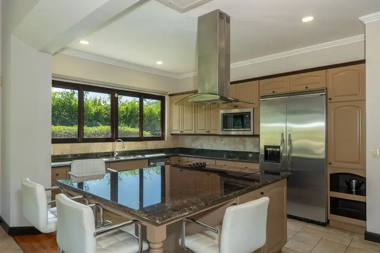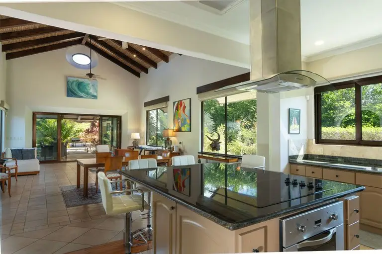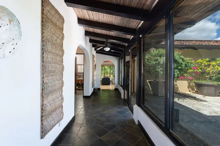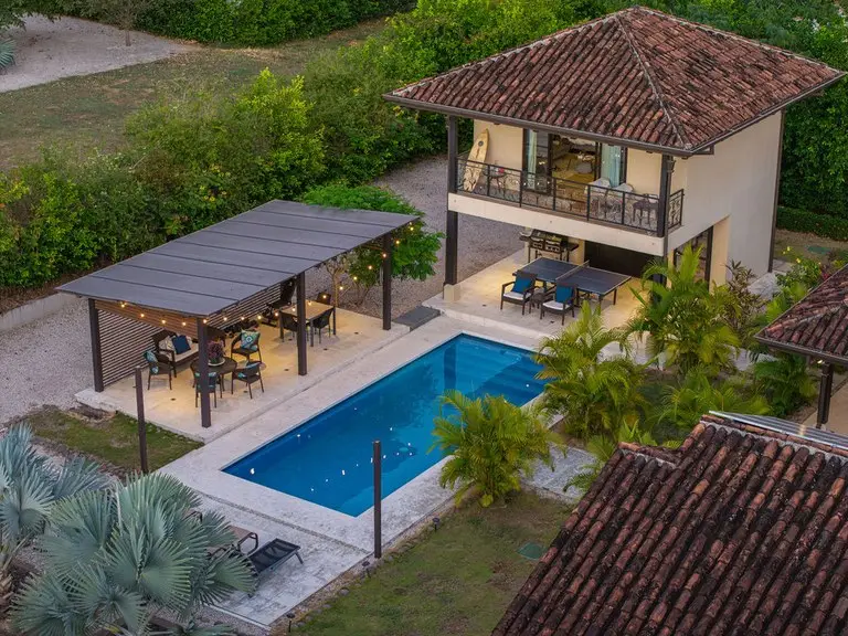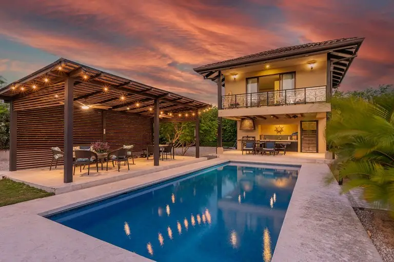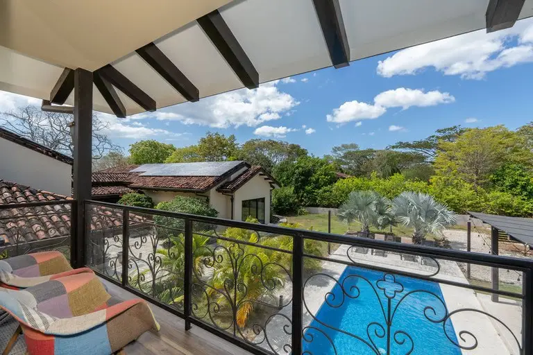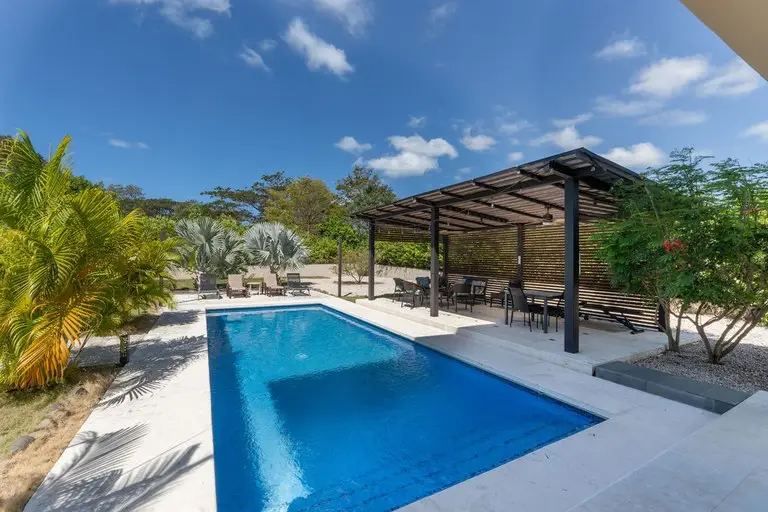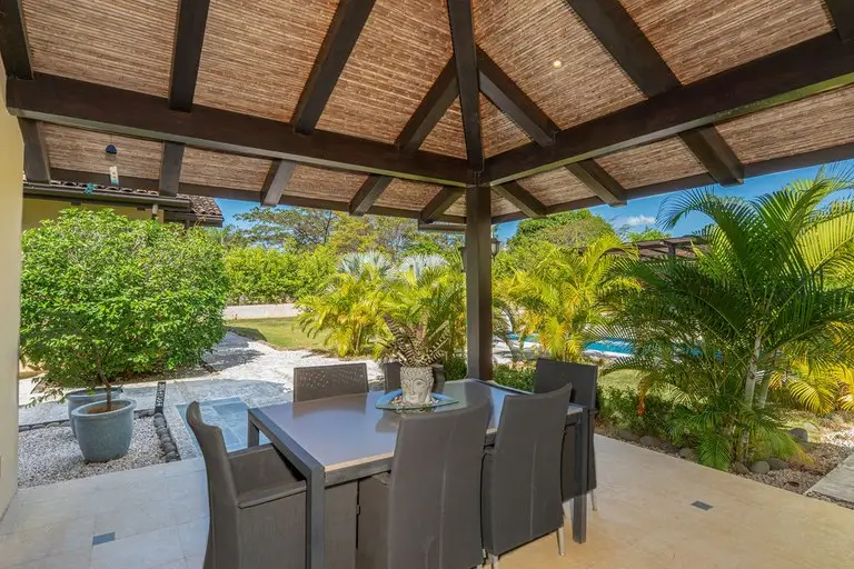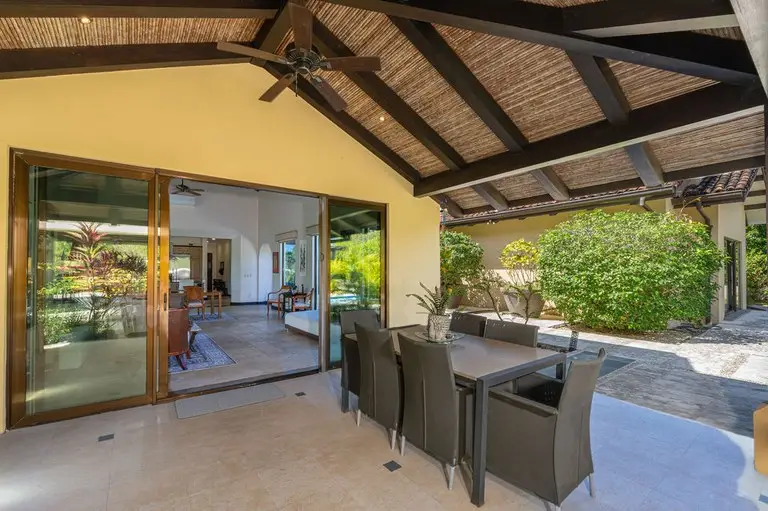 Discover the epitome of Costa Rican luxury at this stunning ranch-style home, nestled within the prestigious Las Brisas community in Hacienda Pinilla. It is perfectly designed to host up to 12 guests. This luxurious home has 5 bedrooms and 6 ½ baths, an office, TV room, solar panels that cut the electrical bill in half, a two-car spacious garage with storage closets, an electric vehicle (EV) outlet, and an extended driveway with parking space for multiple vehicles, an outdoor shower, state of the art monitored security system, and an expansive outdoor backyard space. In the open-concept great room, large windows blur the boundaries between indoor and outdoor spaces, flooding the house with natural light. The fully equipped kitchen boasts high-end appliances and an expansive island, perfect for preparing gourmet meals. The thoughtful layout includes two wings, connected by a large, enclosed foyer with expansive windows, a half bath, access to the backyard, and a full view of the gardens and pool. The first wing houses the master bedroom with a luxurious ensuite bathroom, an office, two additional large bedrooms with en suite baths, a salita/TV room, and a side outdoor patio. Across the enclosed walkway, the second wing offers a charming bedroom with a twin bed and an additional twin trundle bed, the kitchen, laundry room, 2-car garage, and the living room with high ceilings and giant windows. In addition to the main house, there is a spacious casita with an ensuite bathroom and a beautiful large balcony with furniture to enjoy the views of the surrounding area. Step into your private backyard sanctuary, where outdoor living meets effortless luxury. Anchored by a sparkling pool, this expansive outdoor space is designed for relaxation,entertainment, and endless possibilities. The sparkling pool is a centerpiece for fun and relaxation, perfect for cooling off on warm days or enjoying a sunset swim. Conveniently located just off the pool is an outdoor kitchen with a BBQ, and a full bathroom that ensures guests and family can rinse off or refresh without entering the main house. There are multiple covered seating areas with shaded spaces and ample seating ideal for hosting gatherings, lounging with a good book, or enjoying al fresco dining. The backyard offers plenty of space to customize further, including the opportunity to add another casita. Whether you envision a guest retreat, additional home office, or private studio, the options are endless in this versatile outdoor haven. This exceptional property blends luxury, functionality, and Costa Rica's natural beauty, promising an unforgettable experience in one of the country’s most exclusive communities.