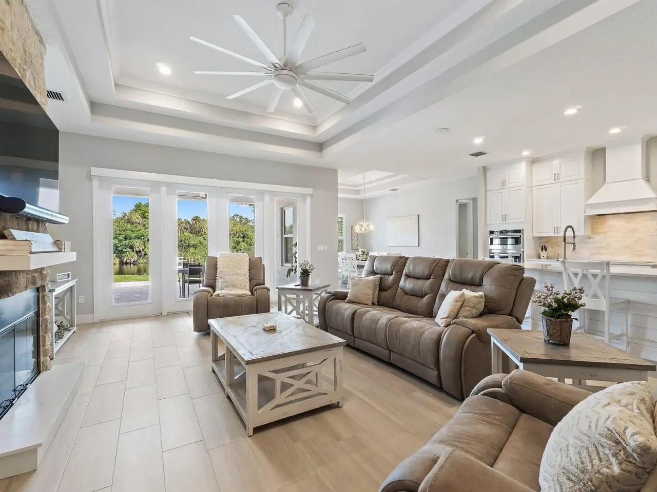 Welcome to your private waterfront retreat on the St. Lucie River. This newly constructed, CBS-built residence in Indiantown, Florida offers the perfect blend of luxury, serenity, and recreation. With 2,833 square feet under air (4,088 total), the home is thoughtfully designed with four bedrooms, three baths, and exquisite finishes including wood-look tile flooring, plantation shutters, impact windows and doors, a metal roof, and soaring 12-foot coffered ceilings beneath a 10-foot beam roof. The chefs kitchen is a showpiece, featuring a seating island, wet bar, and walk-in pantry, complemented by a formal dining room for entertaining. Retreat to the spacious master suite, where a glamorous spa-like bath and custom built-in closets provide everyday indulgence.